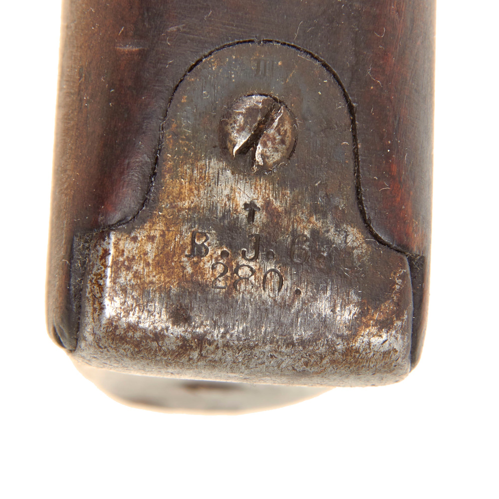 The upper barrel band also bears the "Hammer" mark of Tula Arsenal, as does the right side of the bolt, rear sight leaf, and the top of the butt plate, which also has may be regimental markings of B. J. 6. / 280. The magazine housing of the rifle bears the "Bow and Arrow" marking of Izhevsk Arsenal, another Czarist marking which was discontinued following the Russian revolution and subsequent civil war. It was very common for rifles in service for a long time to have parts swapped out like this. There are some additional markings on rifle, which look to be Imperial.