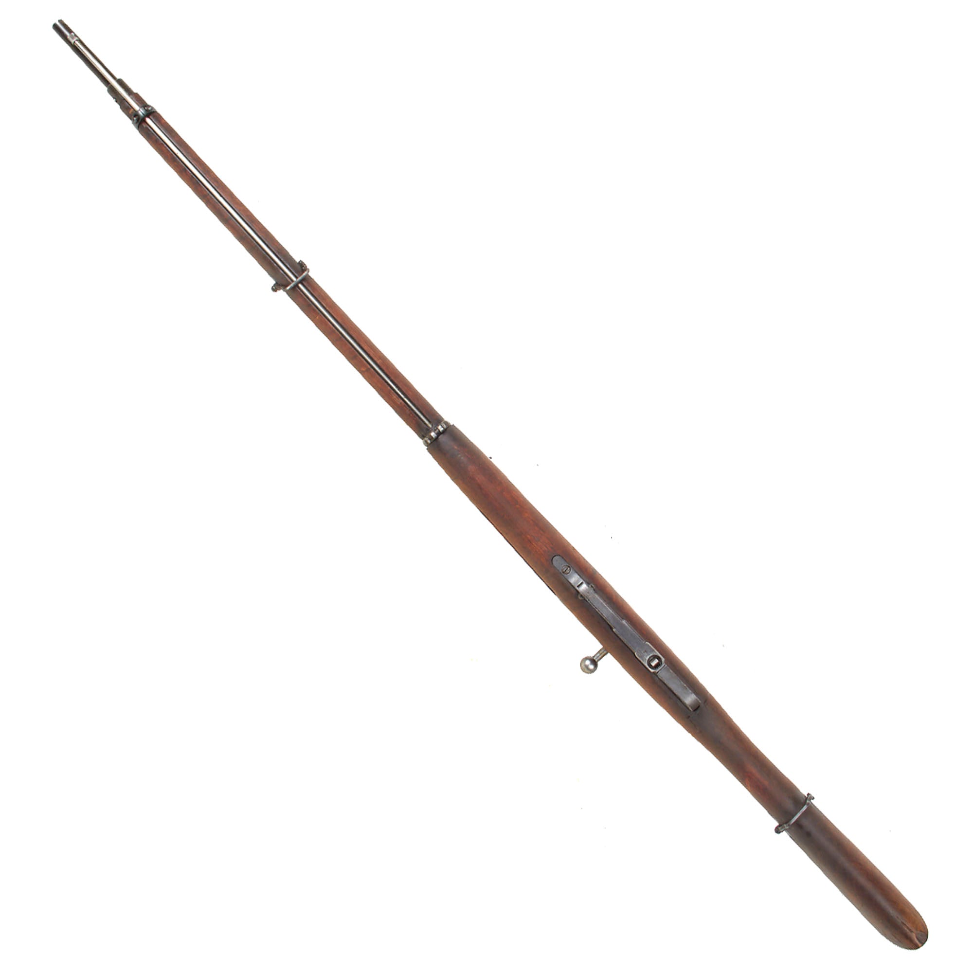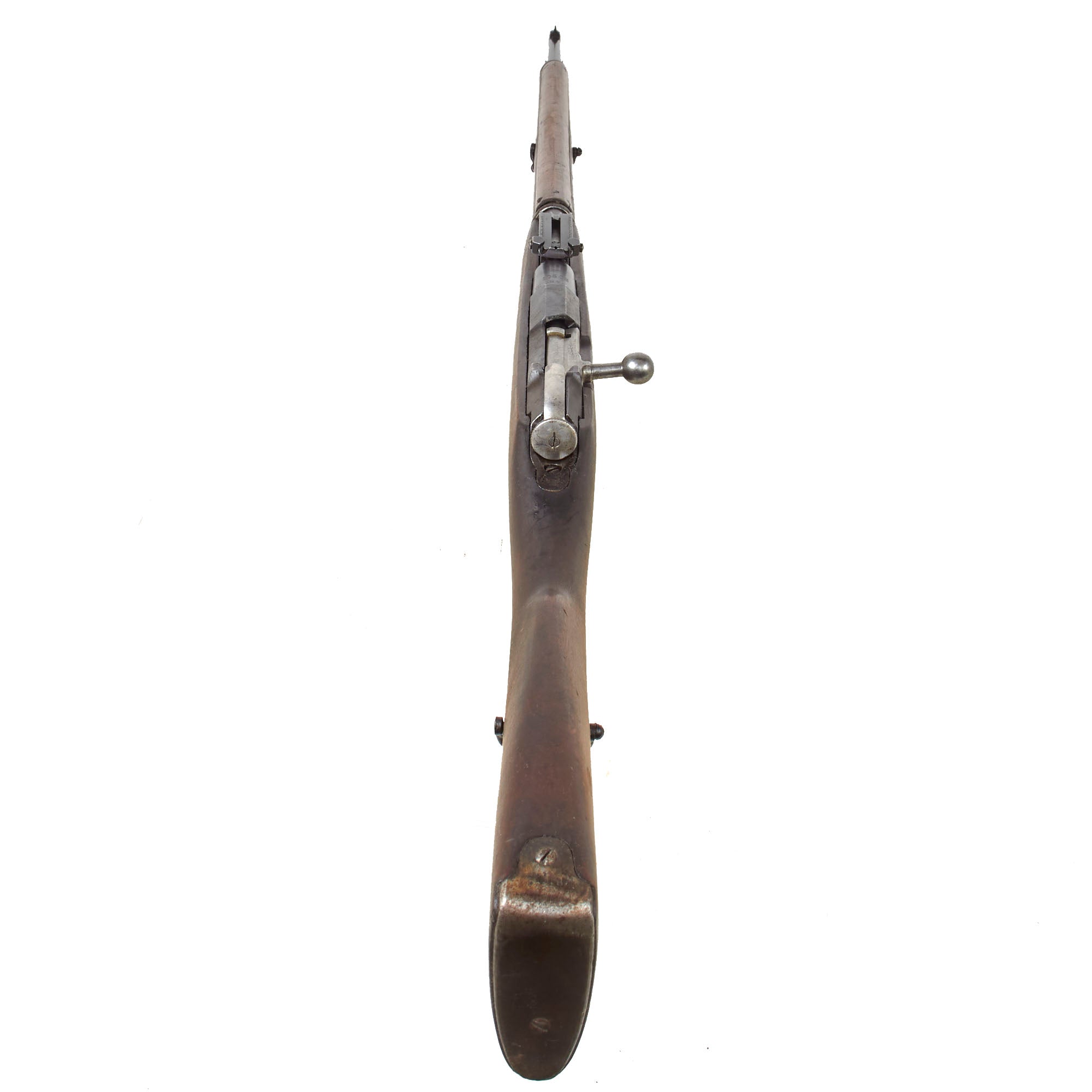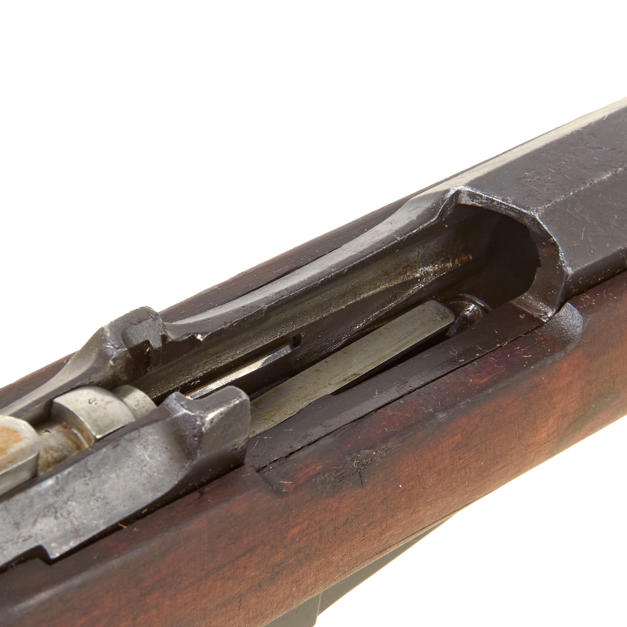 This entailed replacing the stock with a new one, constructed from two pieces of wood with a glued finger joint in the middle. The new stock featured traditional sling swivels fitted into escutcheons, instead of the slots used on the Russian types. This example has both intact, and does not show any signs of recapture by the Soviets.