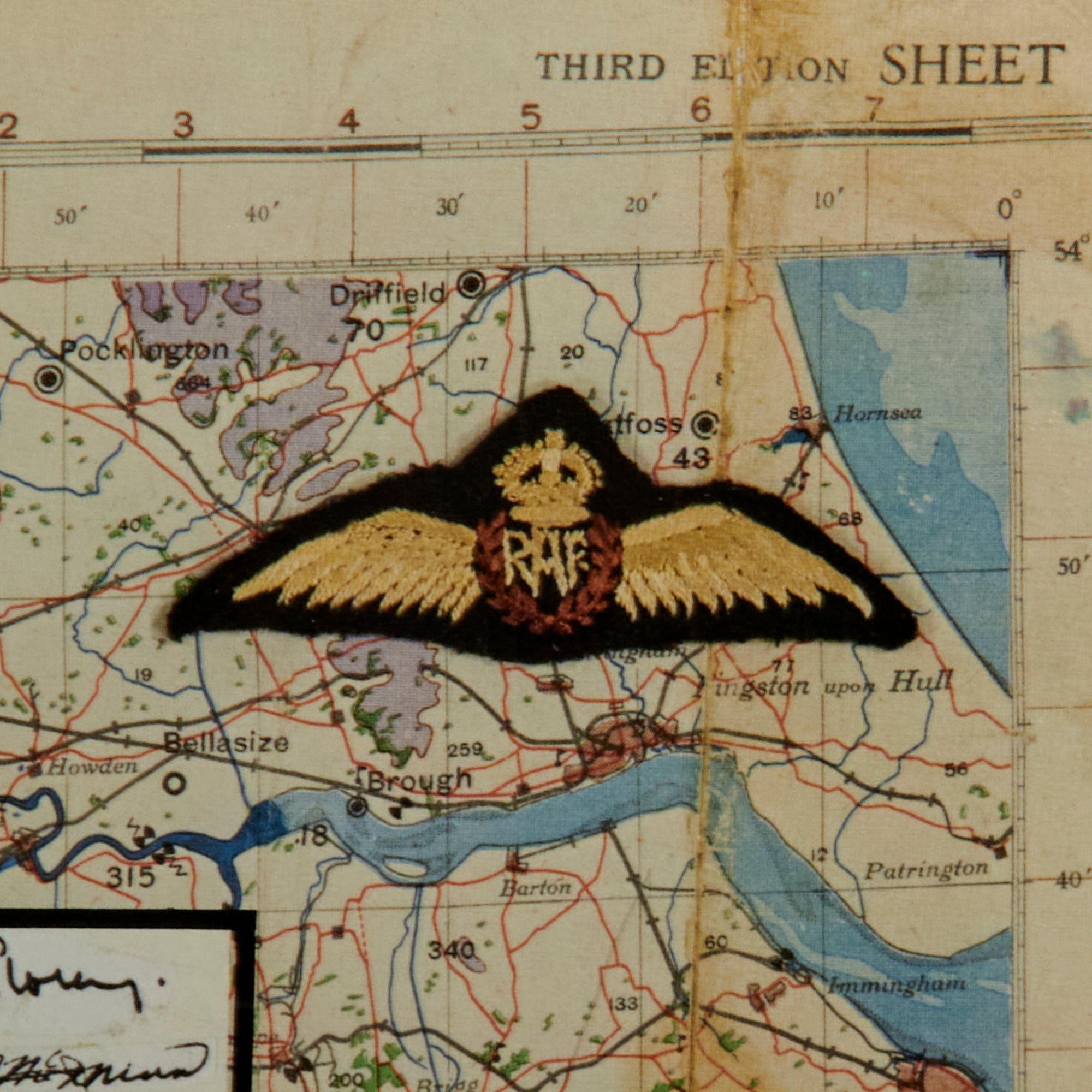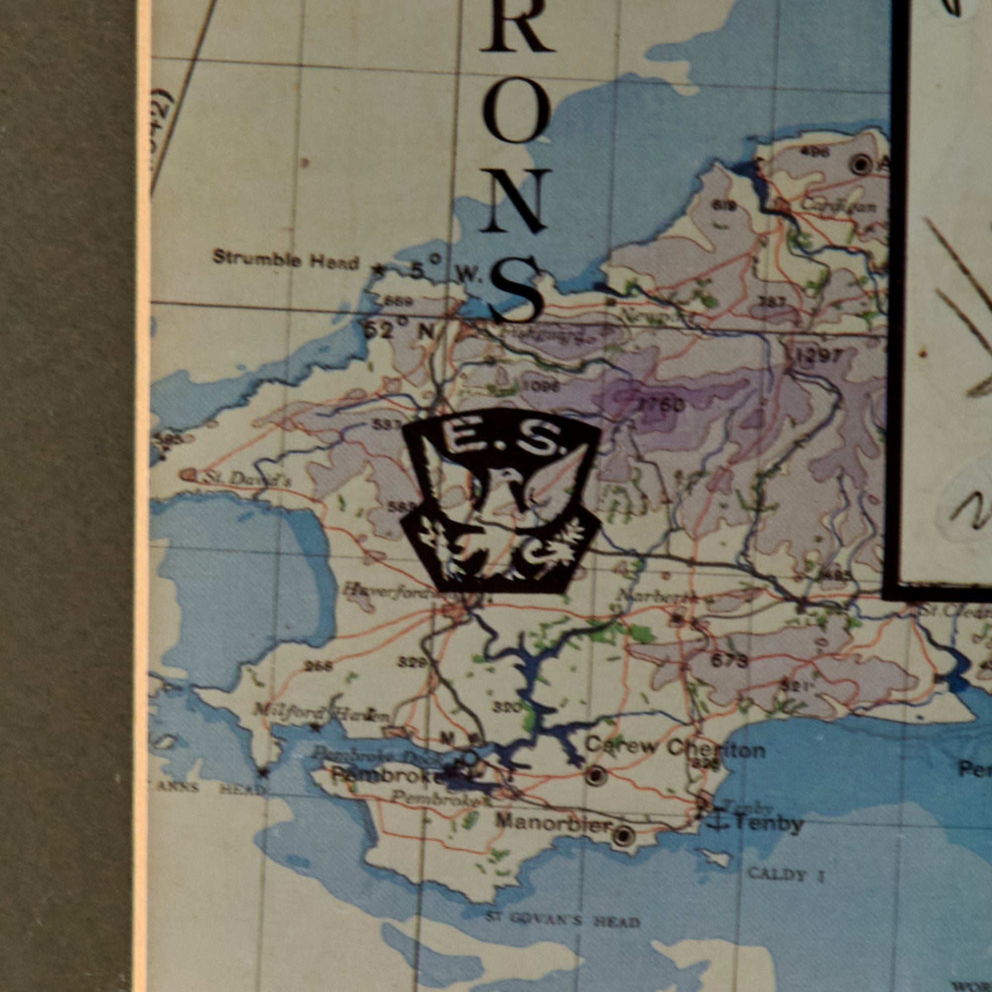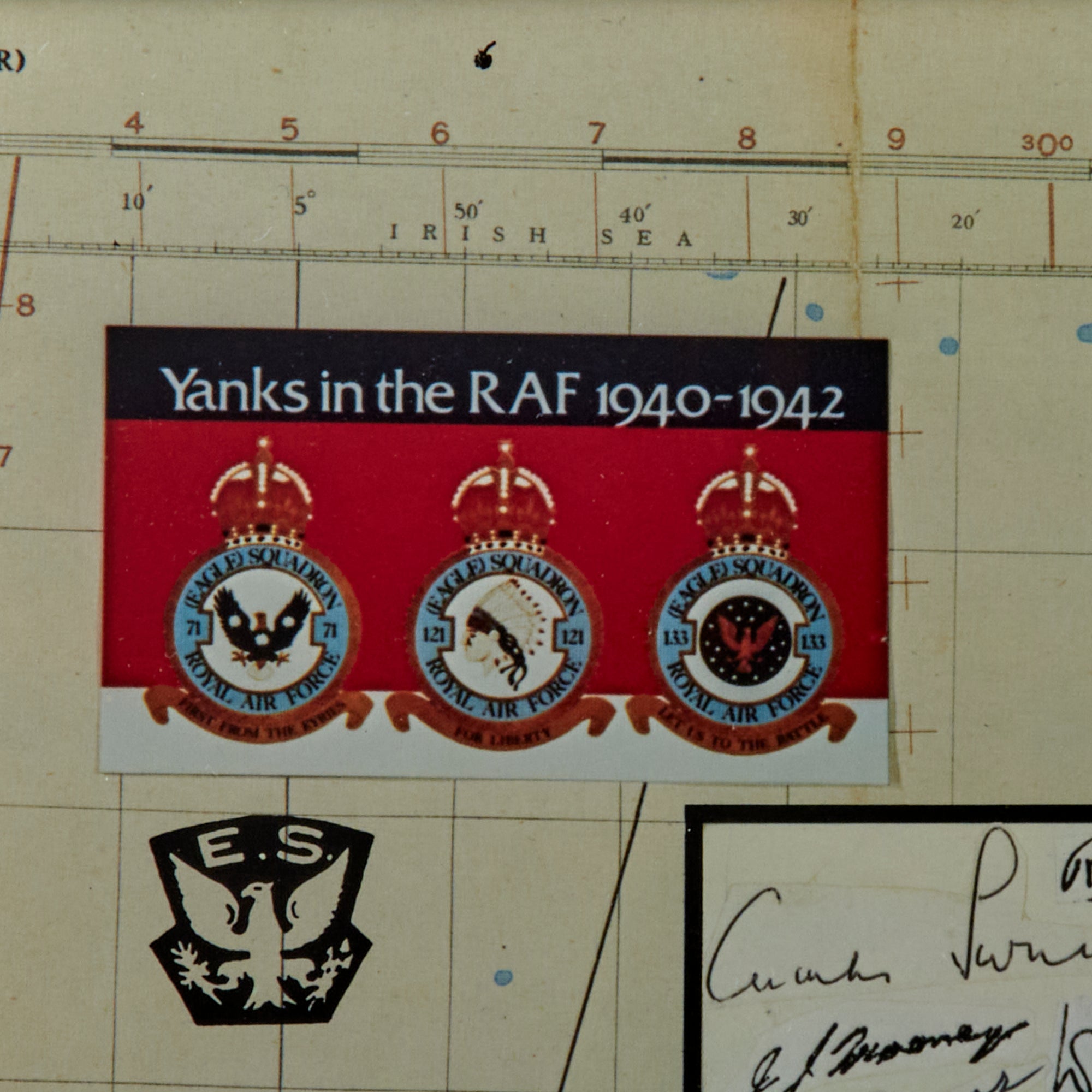 The iconic Supermarine Spitfire is a British fighter aircraft that played a crucial role during World War II. This spitfire was flown by pilots of the American Eagle Squadron or 71, 121 or 133 Squadron. This squadron was comprised of American volunteer pilots serving with the Royal Air Force in WW2. The photo is signed by many of each of the three squadrons and is placed in front of a map of the midlands and features the RAF and Eagle Squadron badges as well as the individual badges for the 71, 121 and 133.