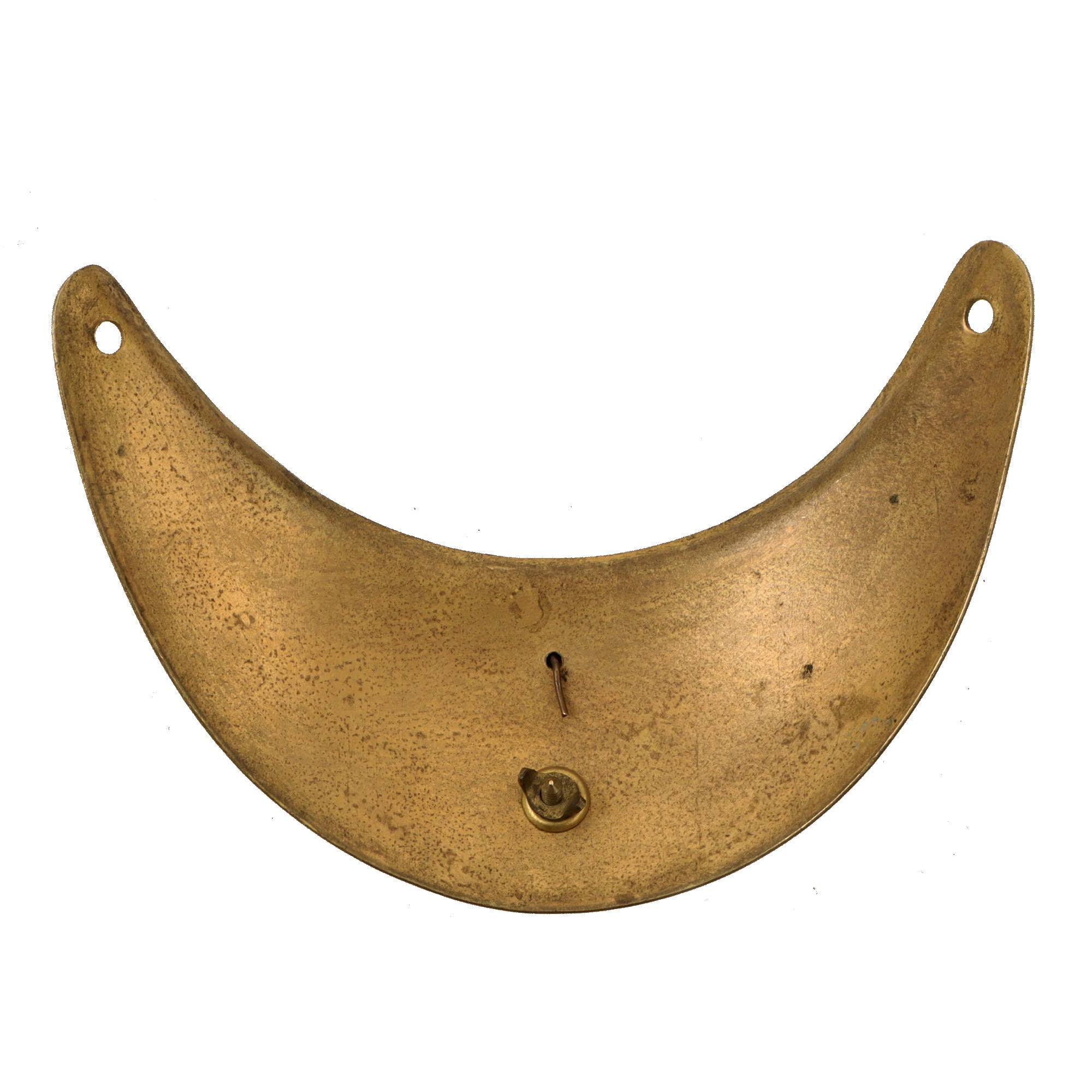 The condition is heavily worn with some residue to the front. The badge has a bit of play but has certainly always been on the gorget. The right side next to the hole is stamped R. The gorget measures 5 ⅜ x 4”. There is minor pitting present on the reverse as well as scratching.