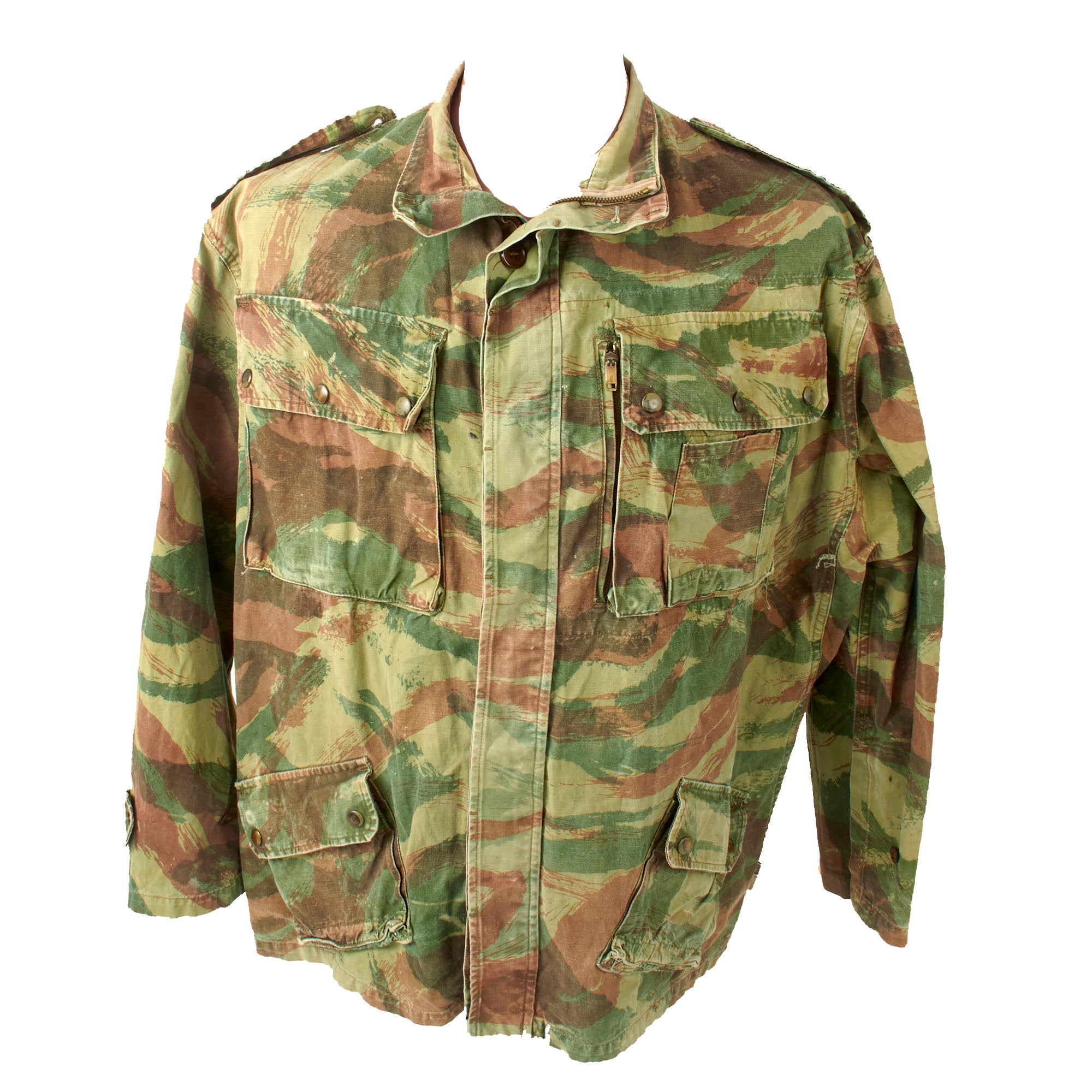 Original Item: Only One Available. After the Second World War, the French Army began rebuilding and created a new uniform. This uniform included a "Lizard Pattern" camouflage, which was used to make a specific jump smock and trousers for parachute troops. The design of the smock and the camouflage pattern were influenced by the American jump smocks and British Denison smocks worn during WW2. The smock underwent several changes over the following decade, with the 1952 pattern being the example in question, hence "47/52".