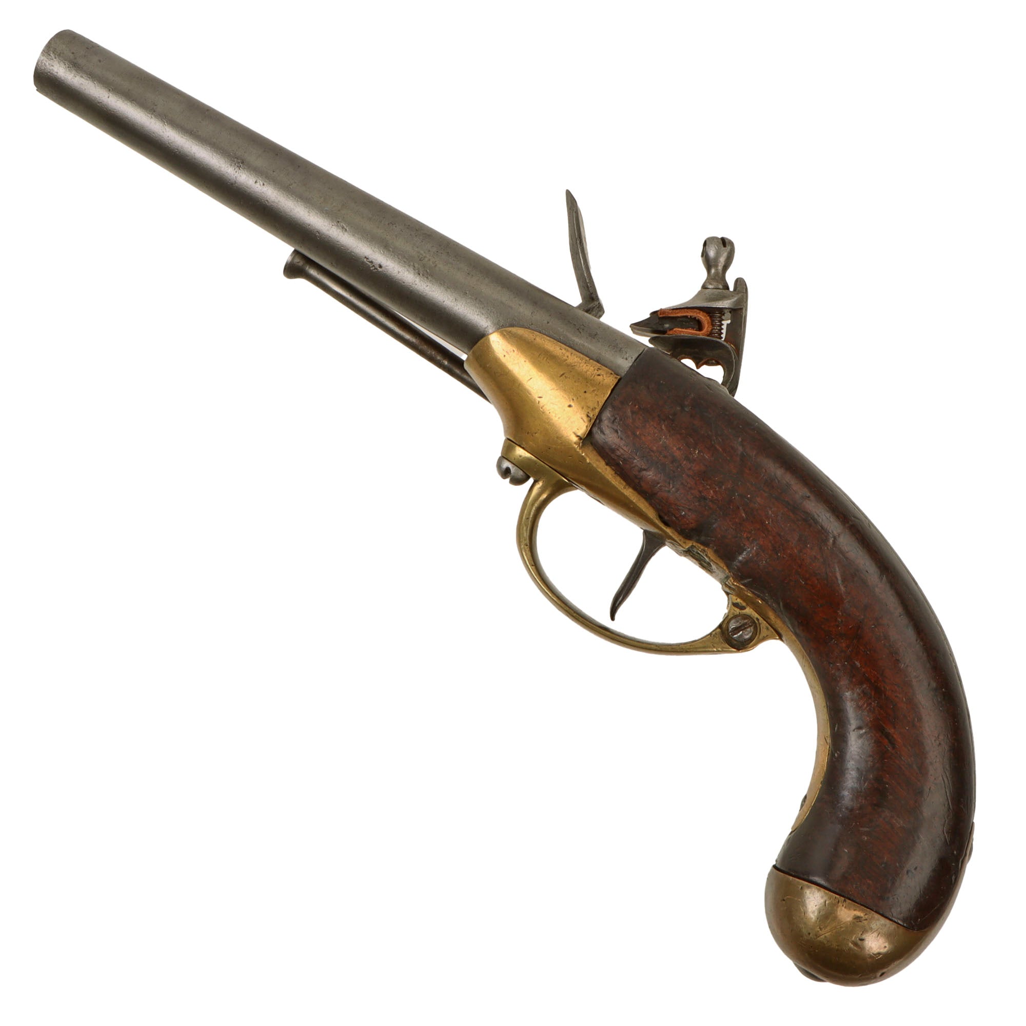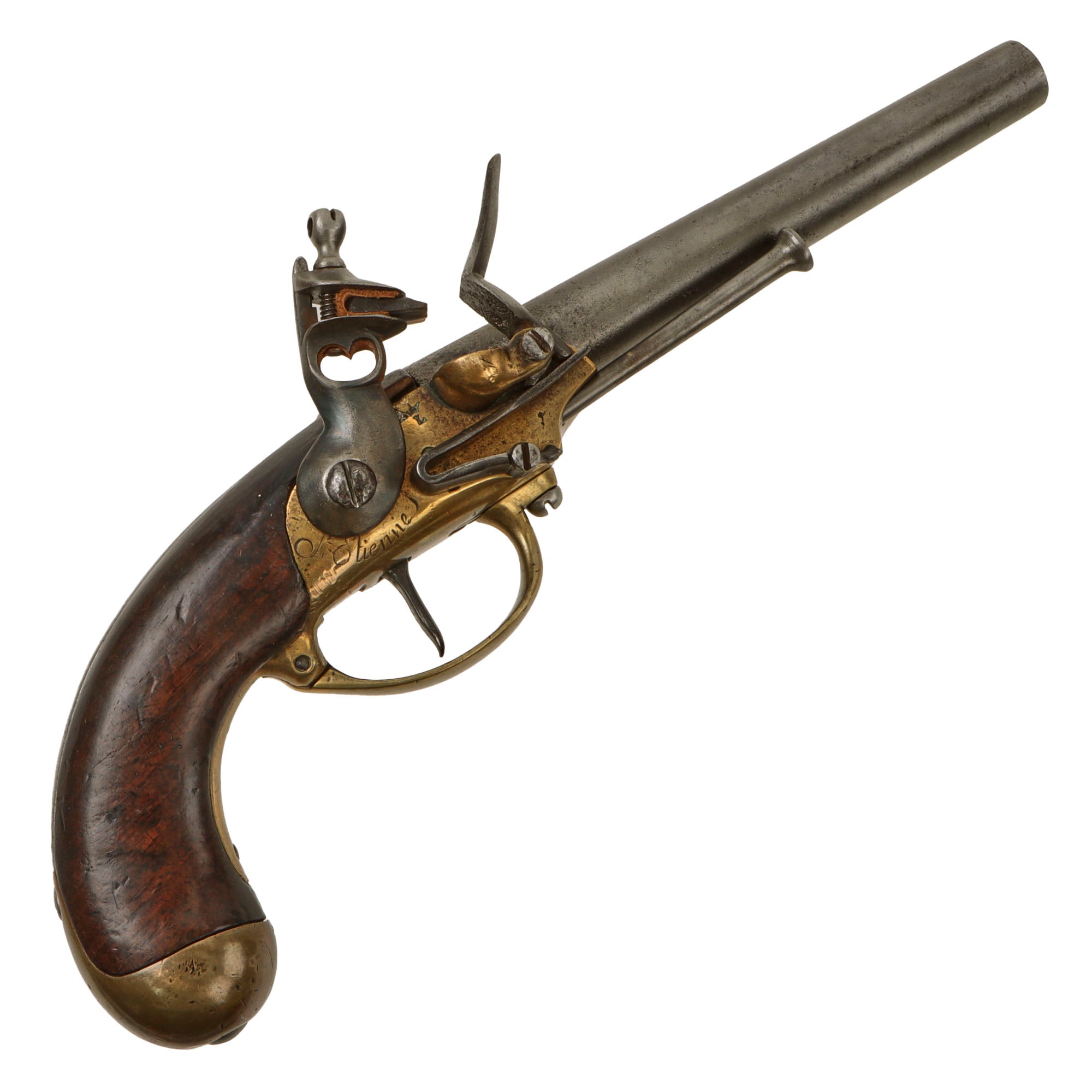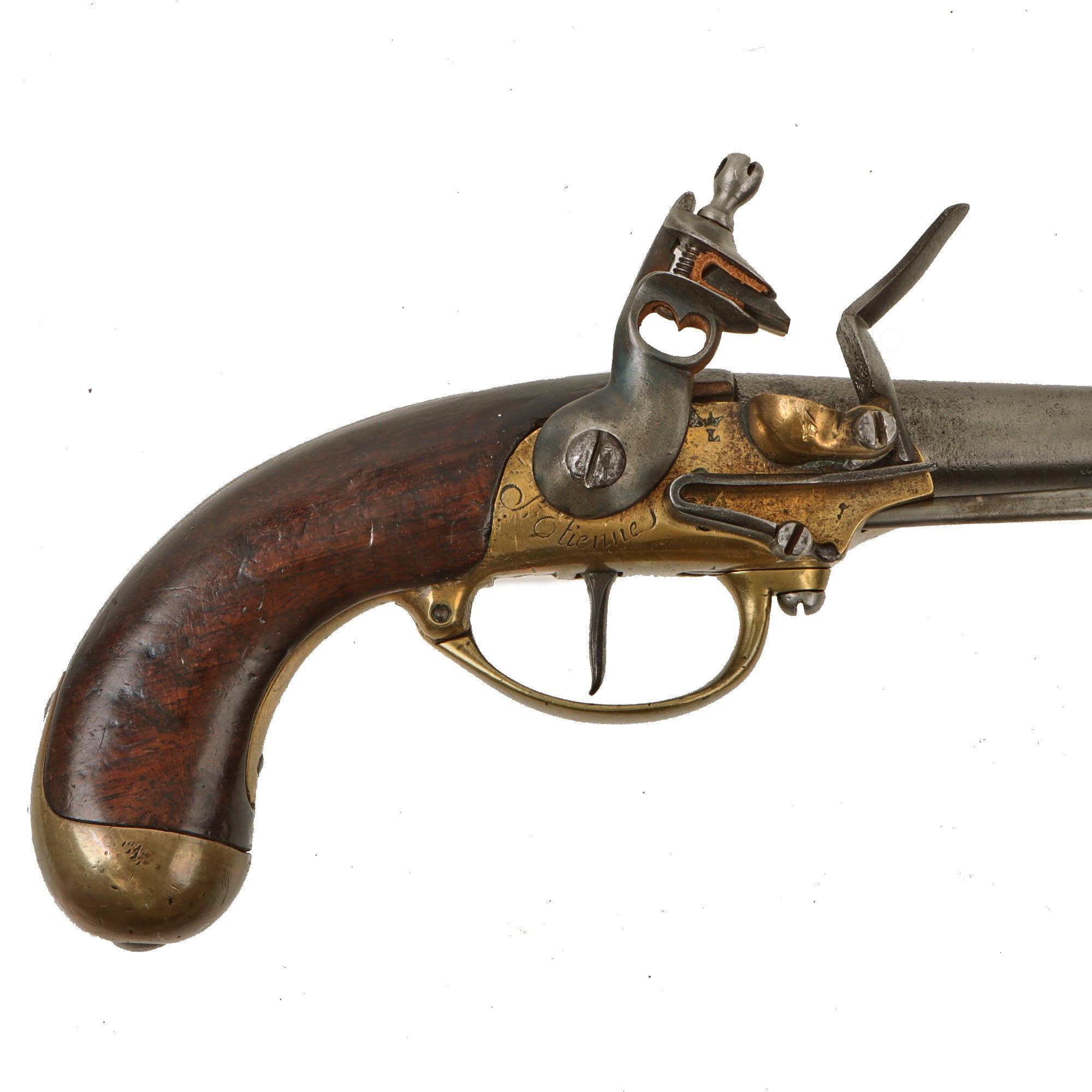 Original item. Only One Available. This is a very nice example of the father of American single shot martial pistols, the French M-1777 Flintlock Cavalry Pistol. This was the pistol the U.S. company of "Simeon & North" copied to create the newly independent United States' first martial flintlock pistol. These pistols are very rare on the market, especially ones such as this that are still in the original flintlock configuration. Most that we have seen were converted to percussion in the mid 1800s.