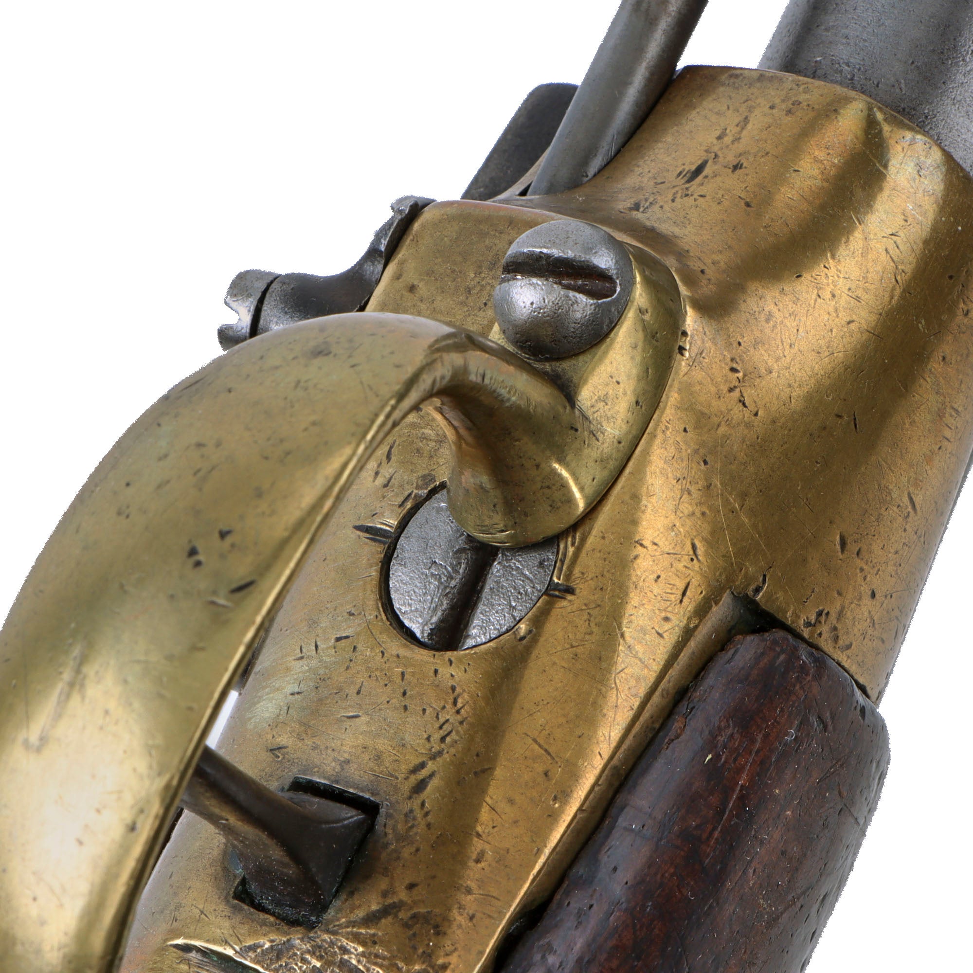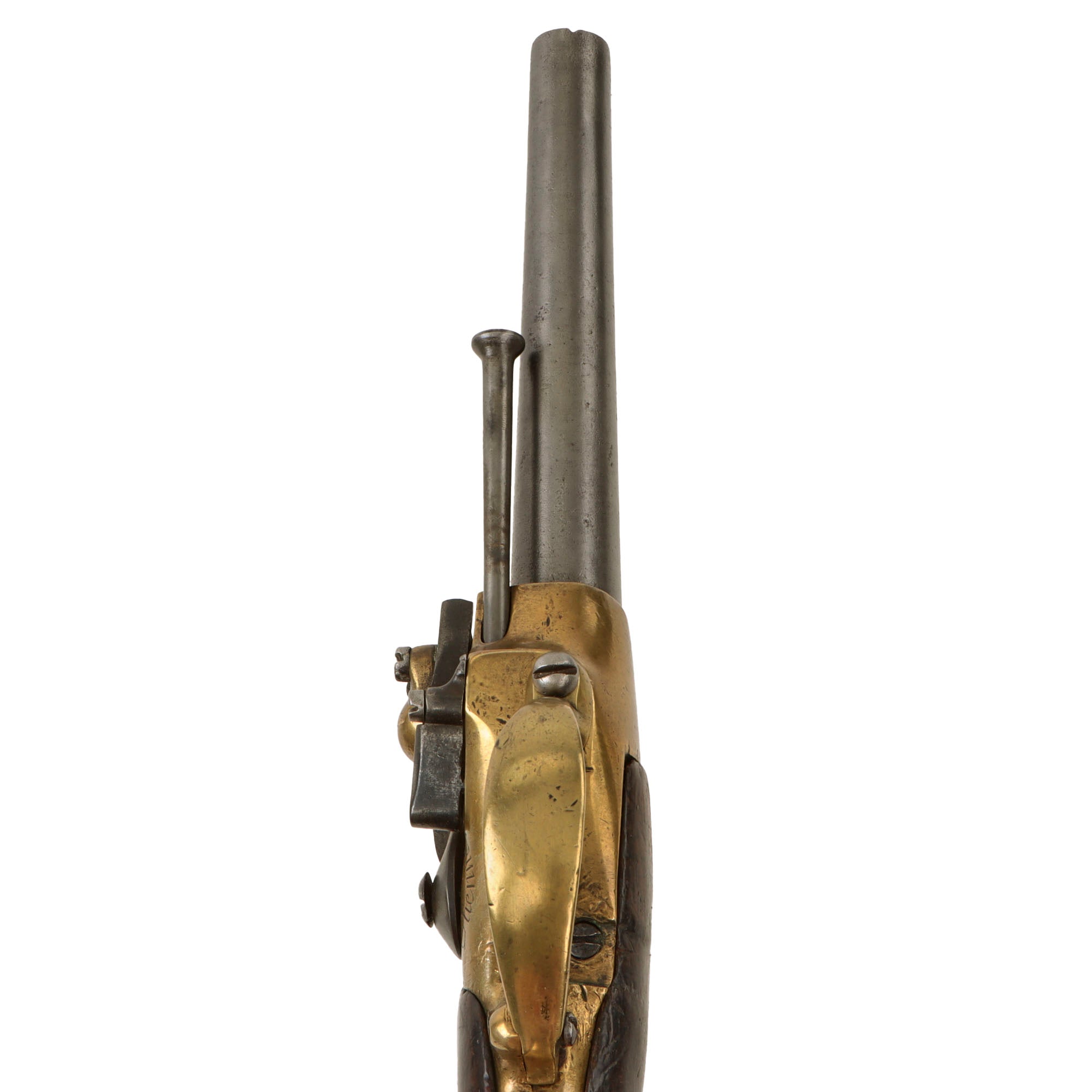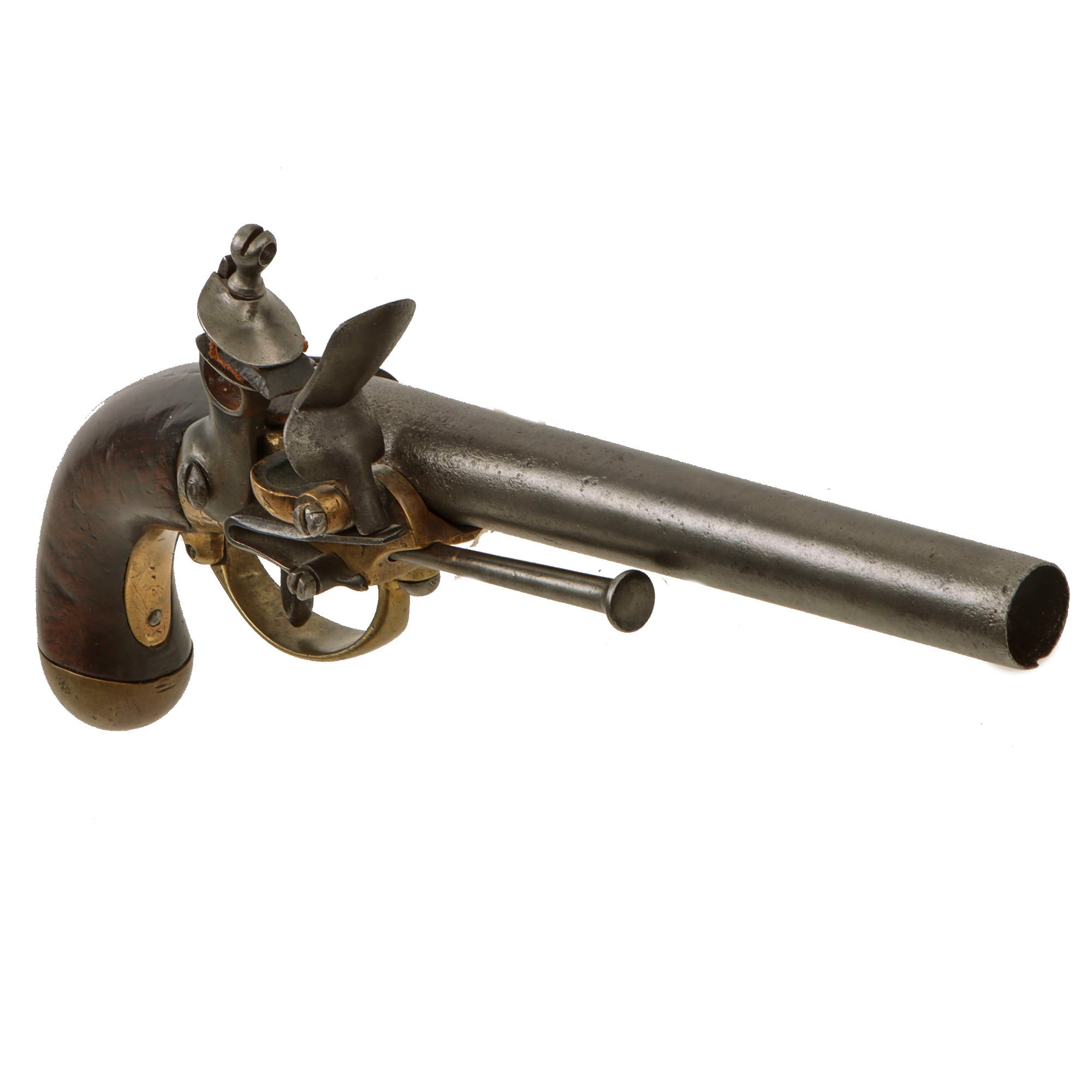 Original item. Only One Available. This is a very nice example of the father of American single shot martial pistols, the French M-1777 Flintlock Cavalry Pistol. This was the pistol the U.S. company of "Simeon & North" copied to create the newly independent United States' first martial flintlock pistol. These pistols are very rare on the market, especially ones such as this that are still in the original flintlock configuration. Most that we have seen were converted to percussion in the mid 1800s.