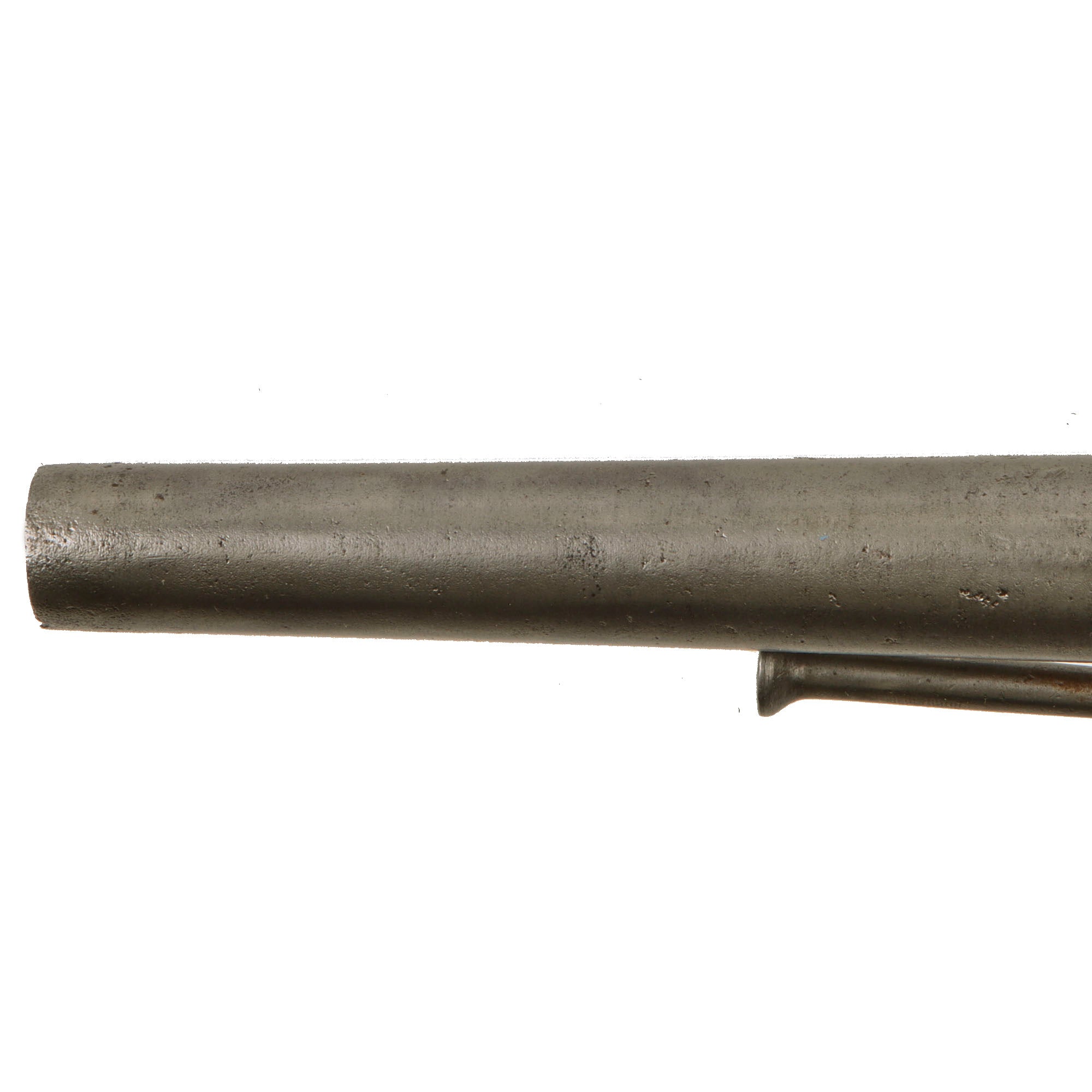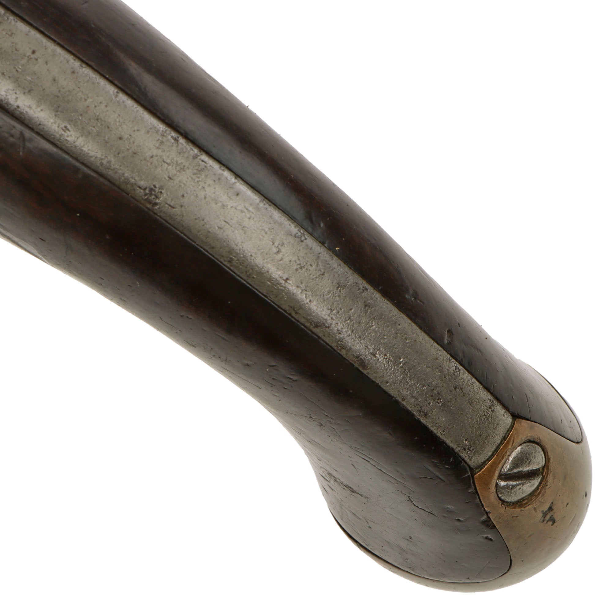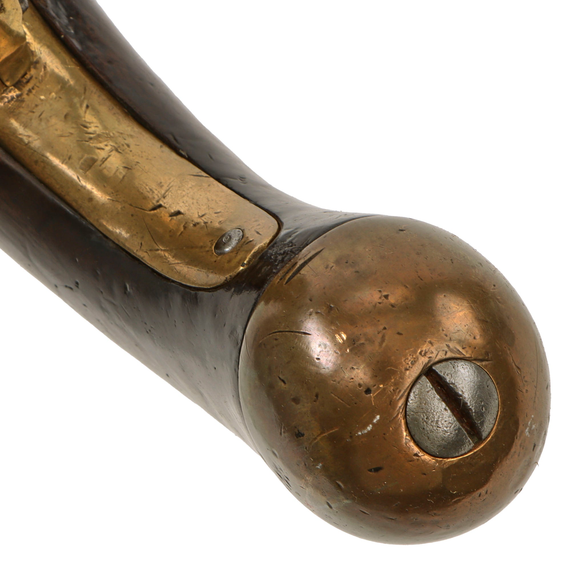 The pistol is in very good used condition, and as with most we have seen there is a good amount of past oxidation and peppering on the iron and steel components, which in this case was cleaned away, leaving a matte gray patina on these. The brass components are still in great shape, with a lovely aged patina and no signs of major cleaning. The wooden stock is in very good shape, showing dents and scratches, but no cracks or repairs. The original iron ramrod is still present under the barrel, and has the correct threads on the end. We checked the lock, and it is fully functional, holding at half cock and firing only at full.