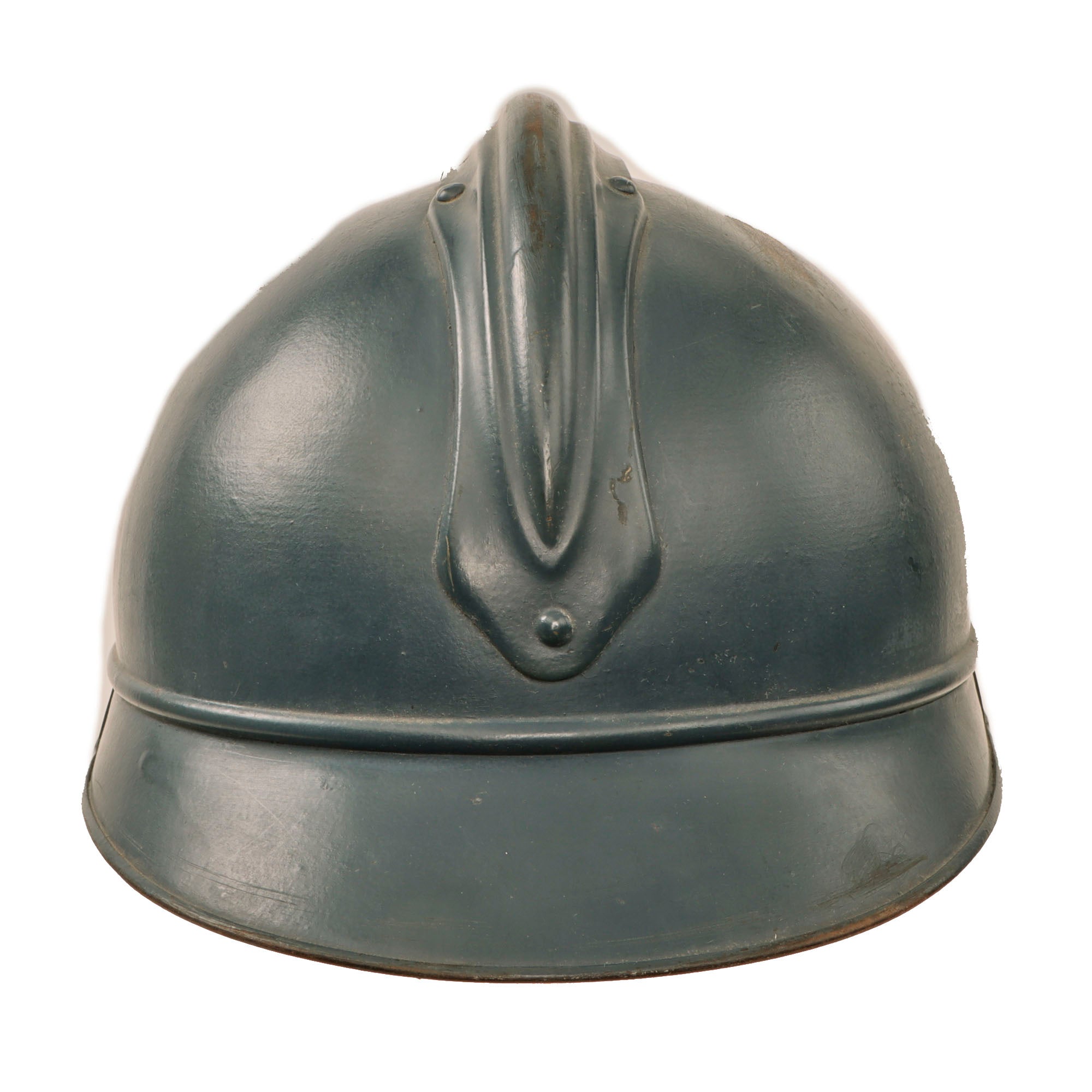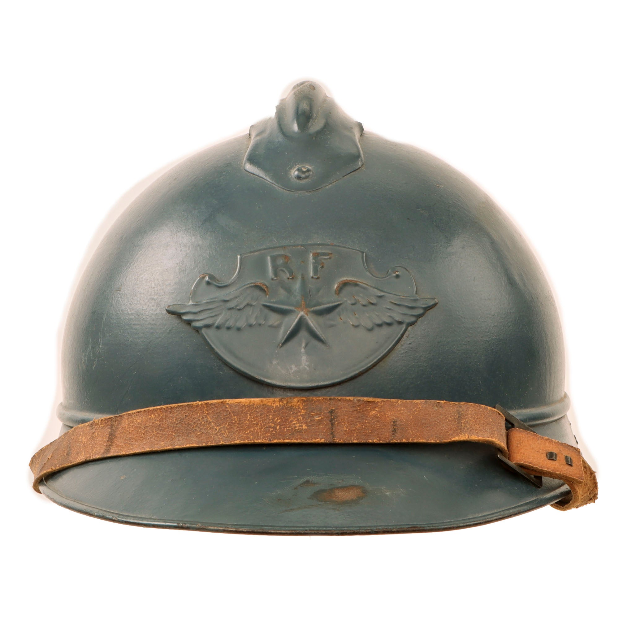 Original Item: Only One Available. This is an authentic World War I M-1915 French Army "Adrian" steel helmet, which looks to have seen use into the 1920s, with an extremely scarce French Air Force front badge. It depicts a winged star under the standard R F on the "bomb" standing for Republique Francaise. This example has a single layer of great Horizon Blue paint.
