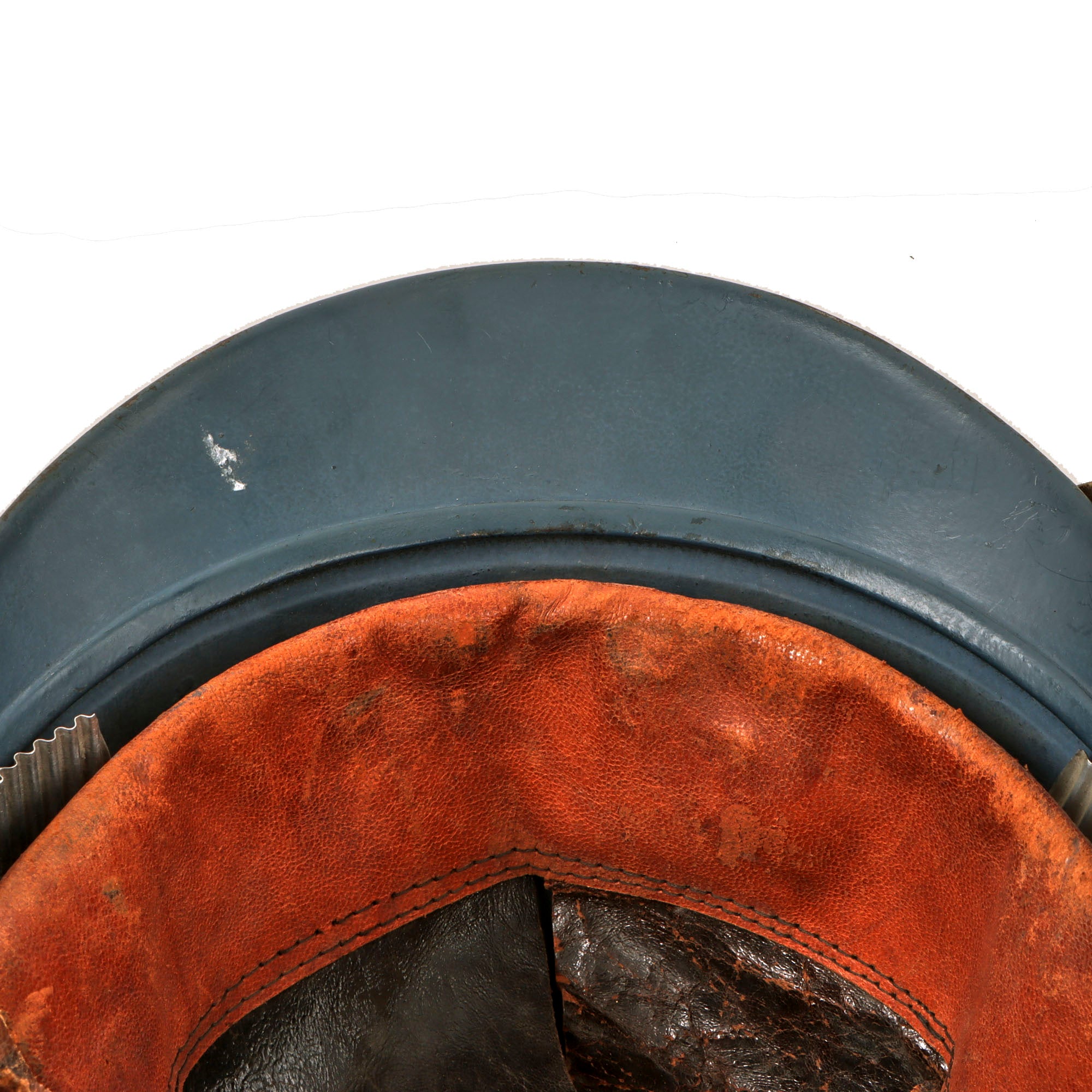The 2nd Pattern leather liner is present, showing moderate wear, with a lot of the finish present, slight tearing and minor cracking present around the lip of the liner. The liner itself is still secured properly inside, and three of the four corrugated aluminum spacers are still present. The chinstrap is present but broken on one side, but can still be wedged into the bale to present on the brim.