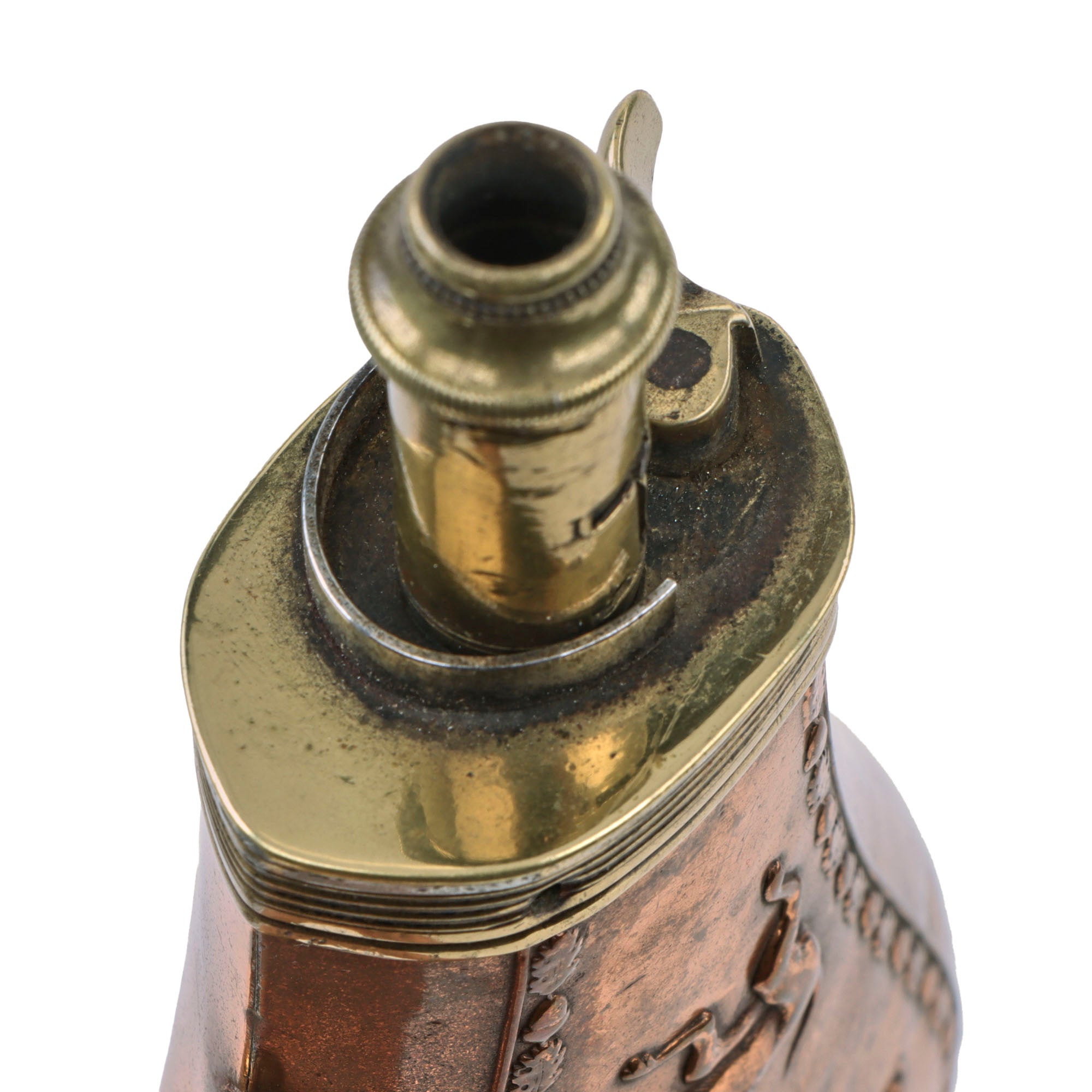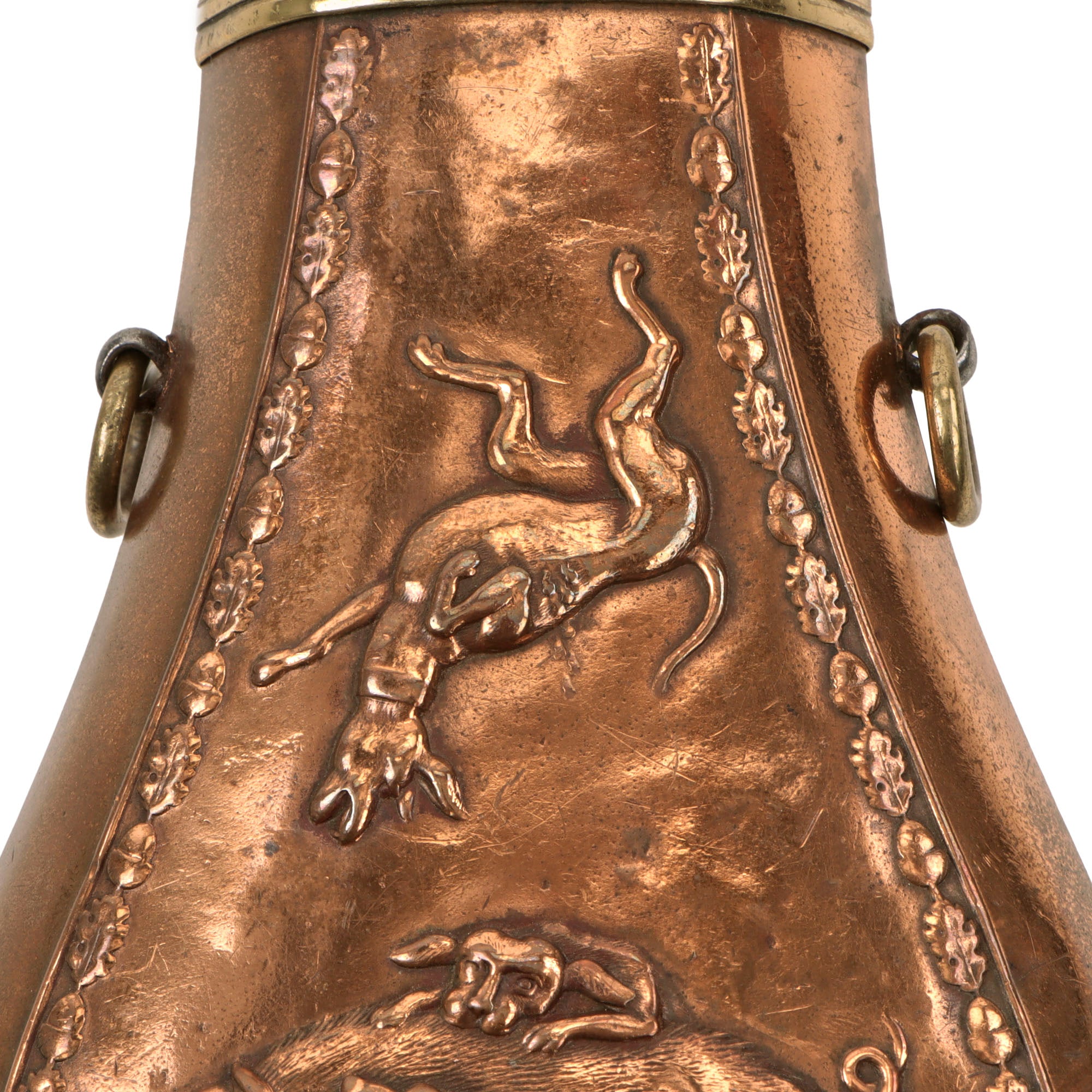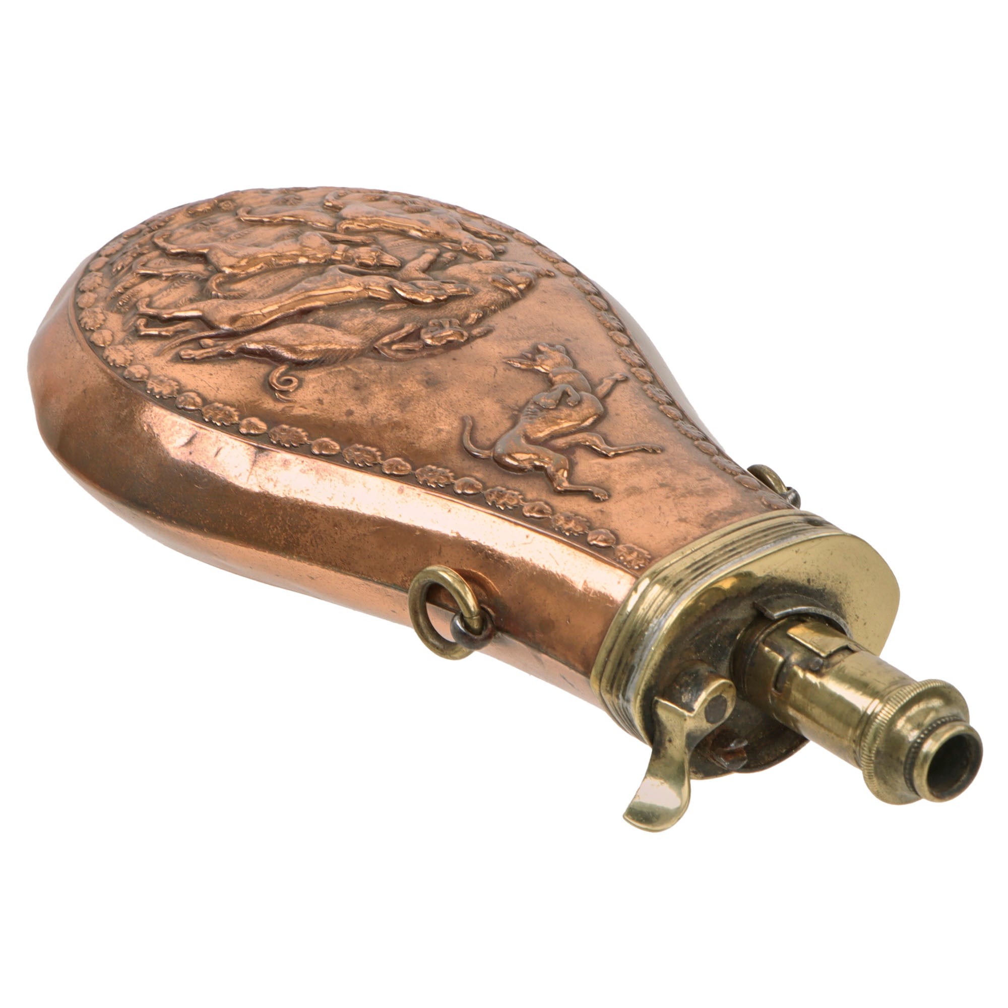 Original Item. Only One Available. This is a lovely mid-19th century French copper powder horn with a lovely wild boar hunt scene on one side, with the markings within the scene N.A. Paris J.N. for a maker in Paris, France.