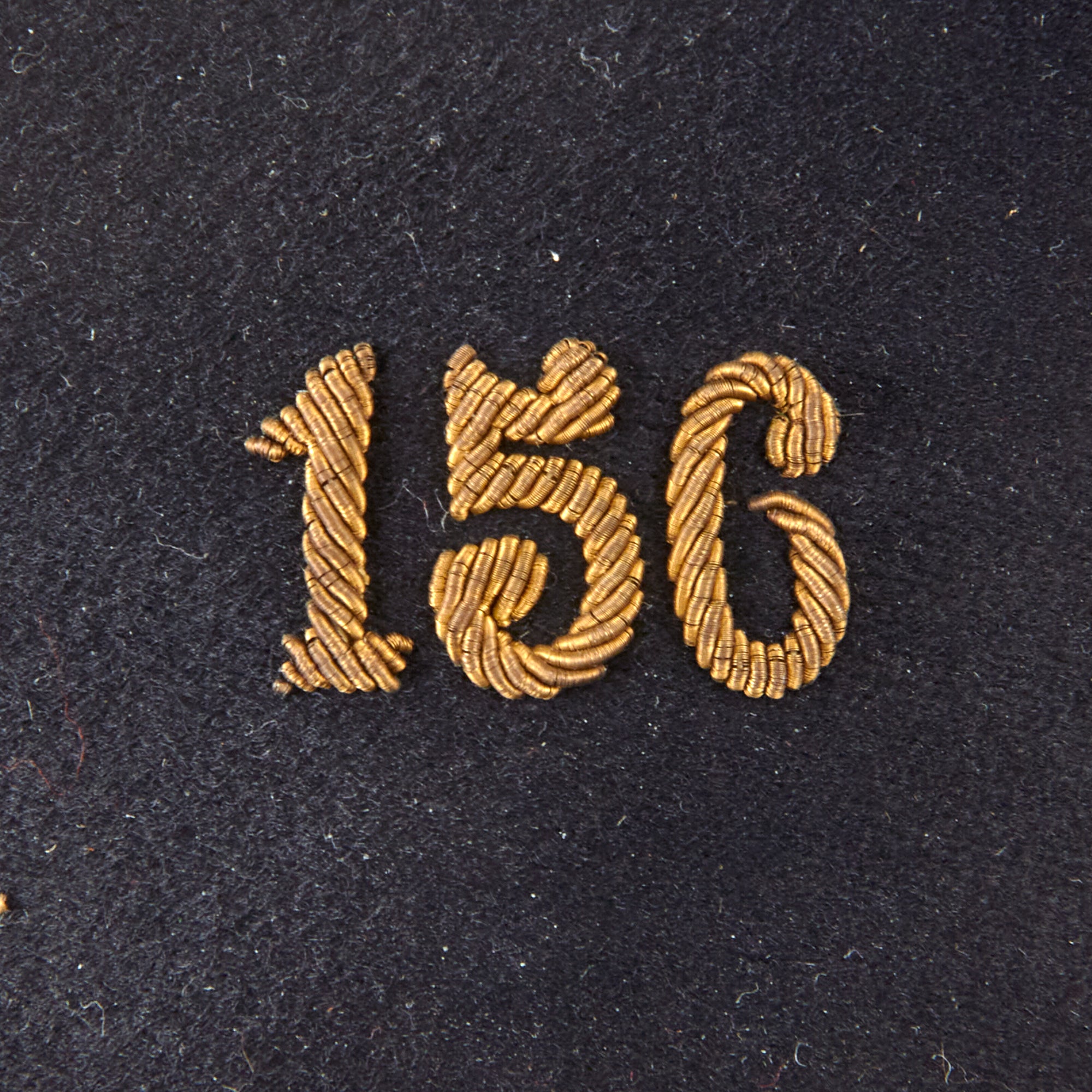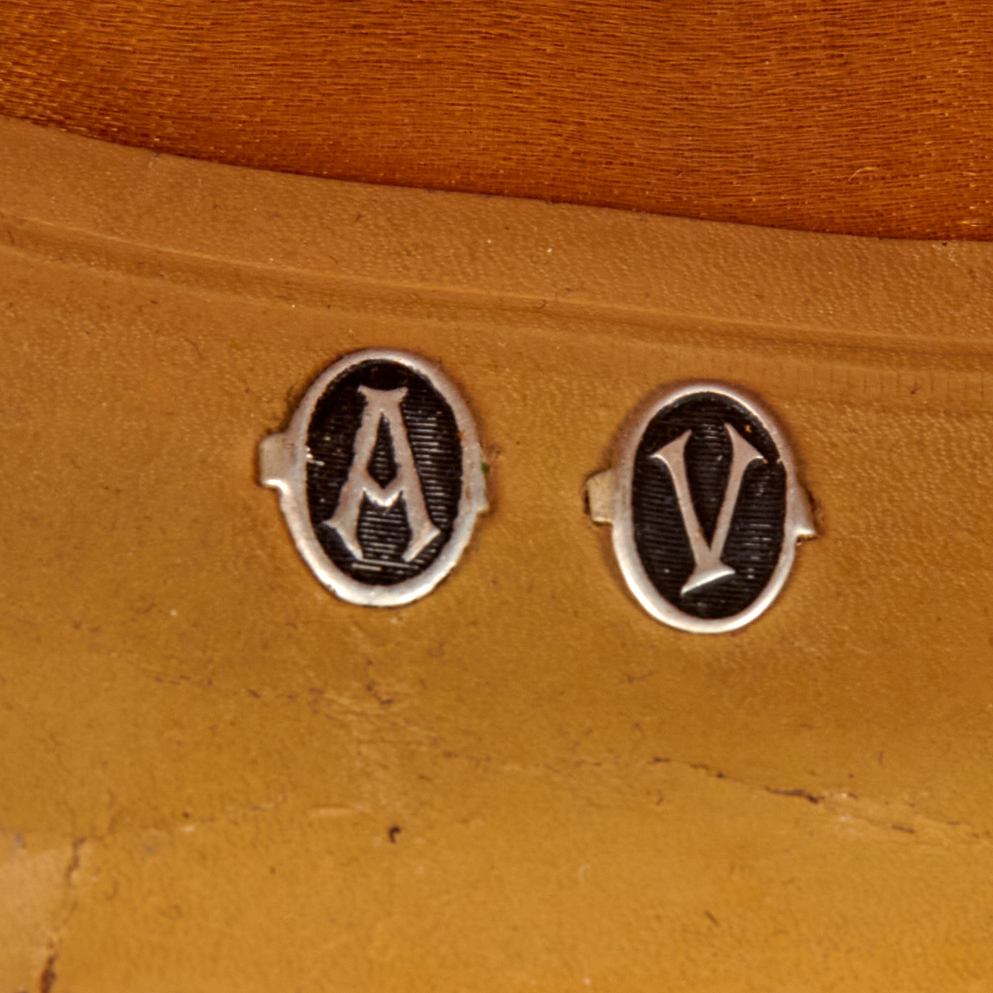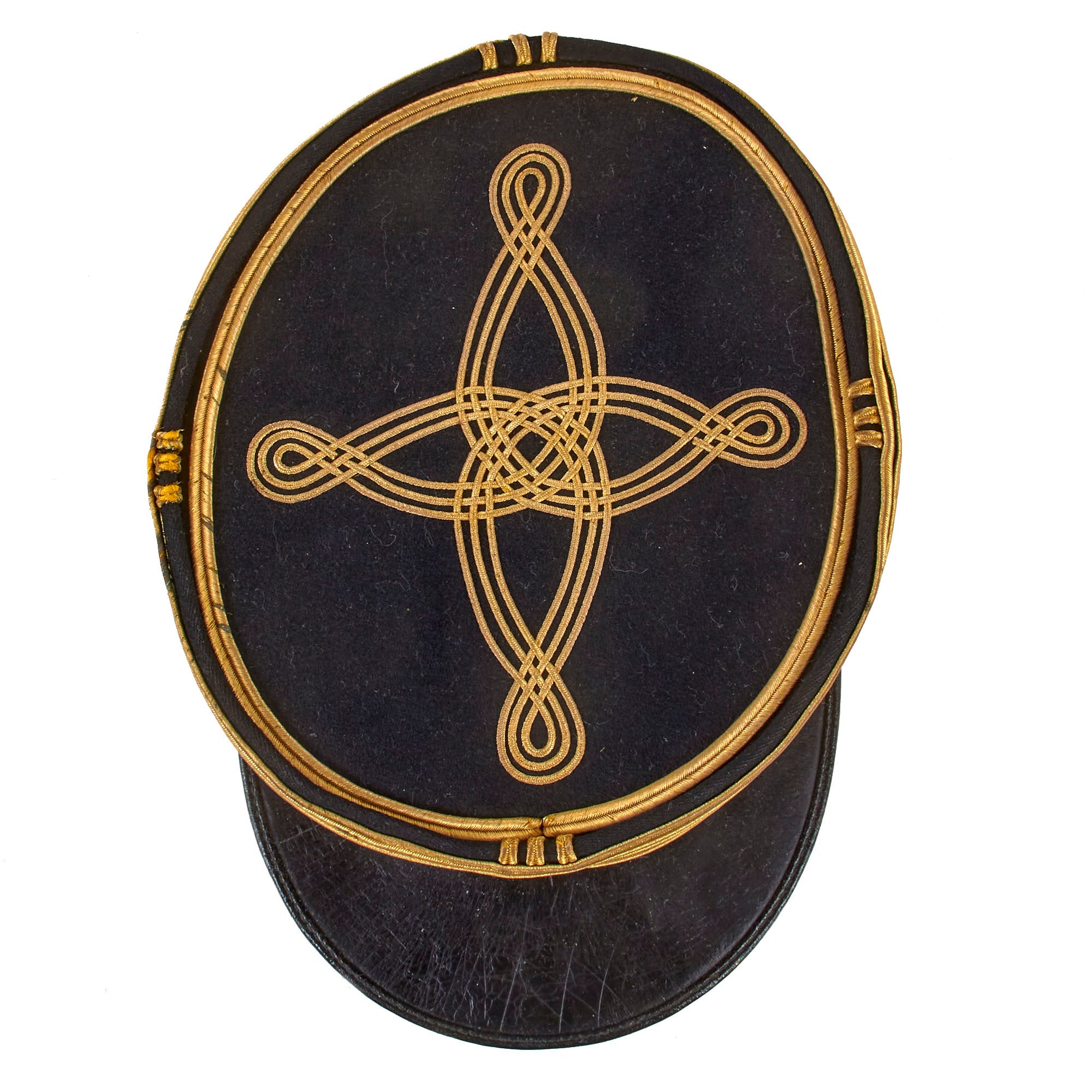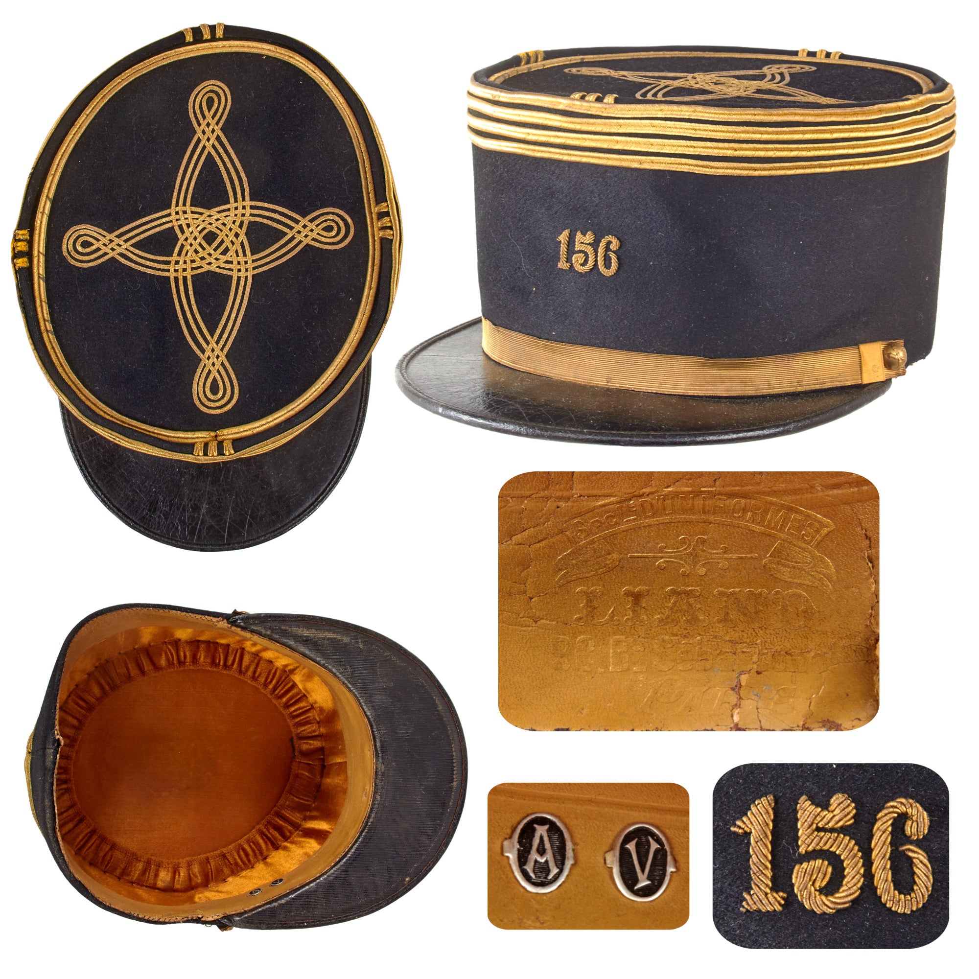 The kepi is high quality in construction and retains markings on the sweatband for manufacture by Liano of Paris, a company we couldn’t find much information on. The faux chinstrap is still intact, held in place by two artillery buttons. The crown is in great shape with just basic wear. The interior shows that the oilcloth sweatband is well-retained, but the stitching is coming off in multiple spots. The sweatband has initial devices for A.V., certainly the initials of the officer. The orange/gold lining still looks great with some sweat-staining. The visor shows heavy crazing but the character is still great. The kepi is roughly a size 7.