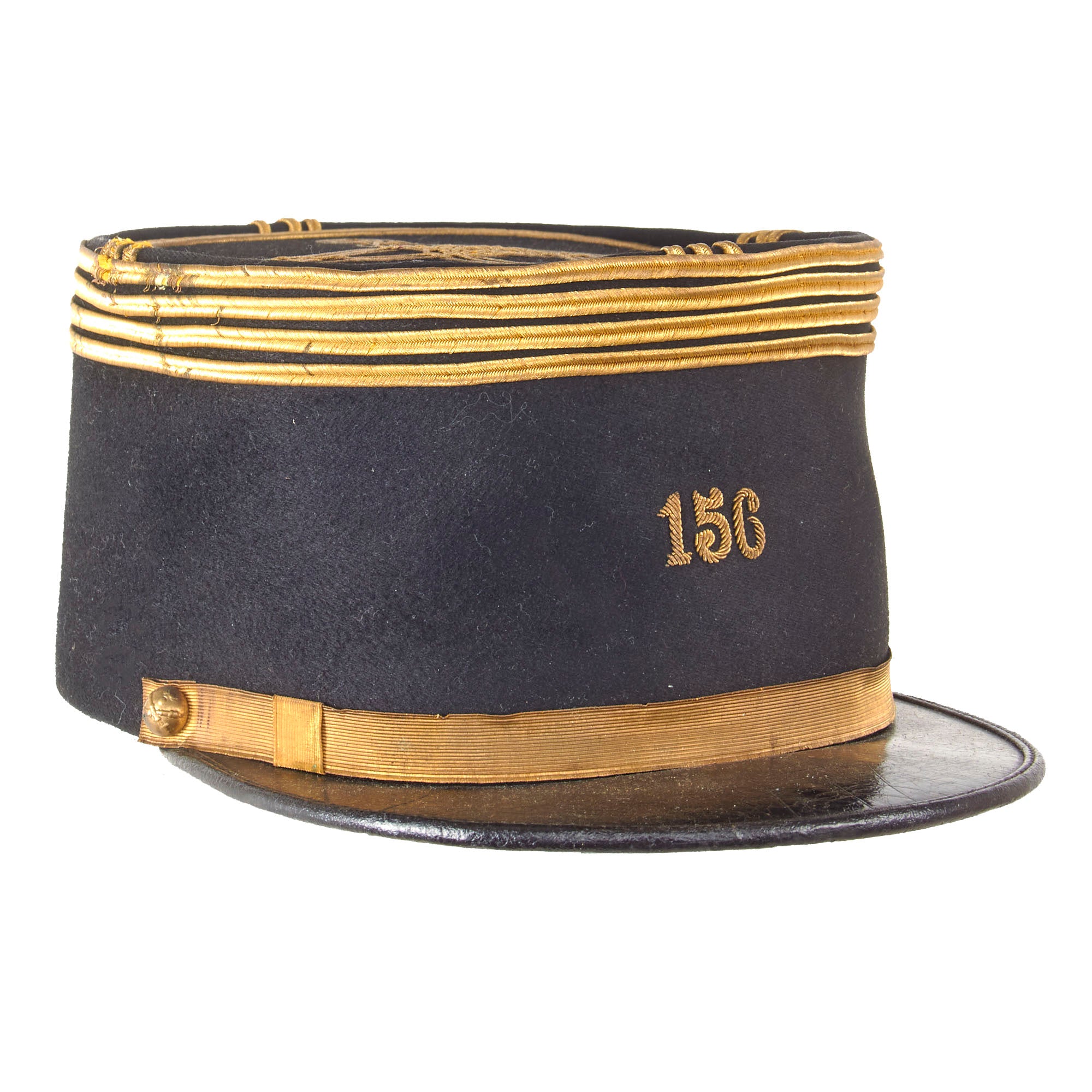 Original Item: Only One Available. This is a lovely World War One French Artillery Officer’s kepi in excellent condition. This is the lower height style kepi they first started using after phasing out the floppy or "bummer" type kepis. This style was only worn for a short time during WWI into the early 1920's. From the construction of this example, it appears earlier and certainly during the WWI period. It has numerals on the front denoting the 156th Field Artillery.