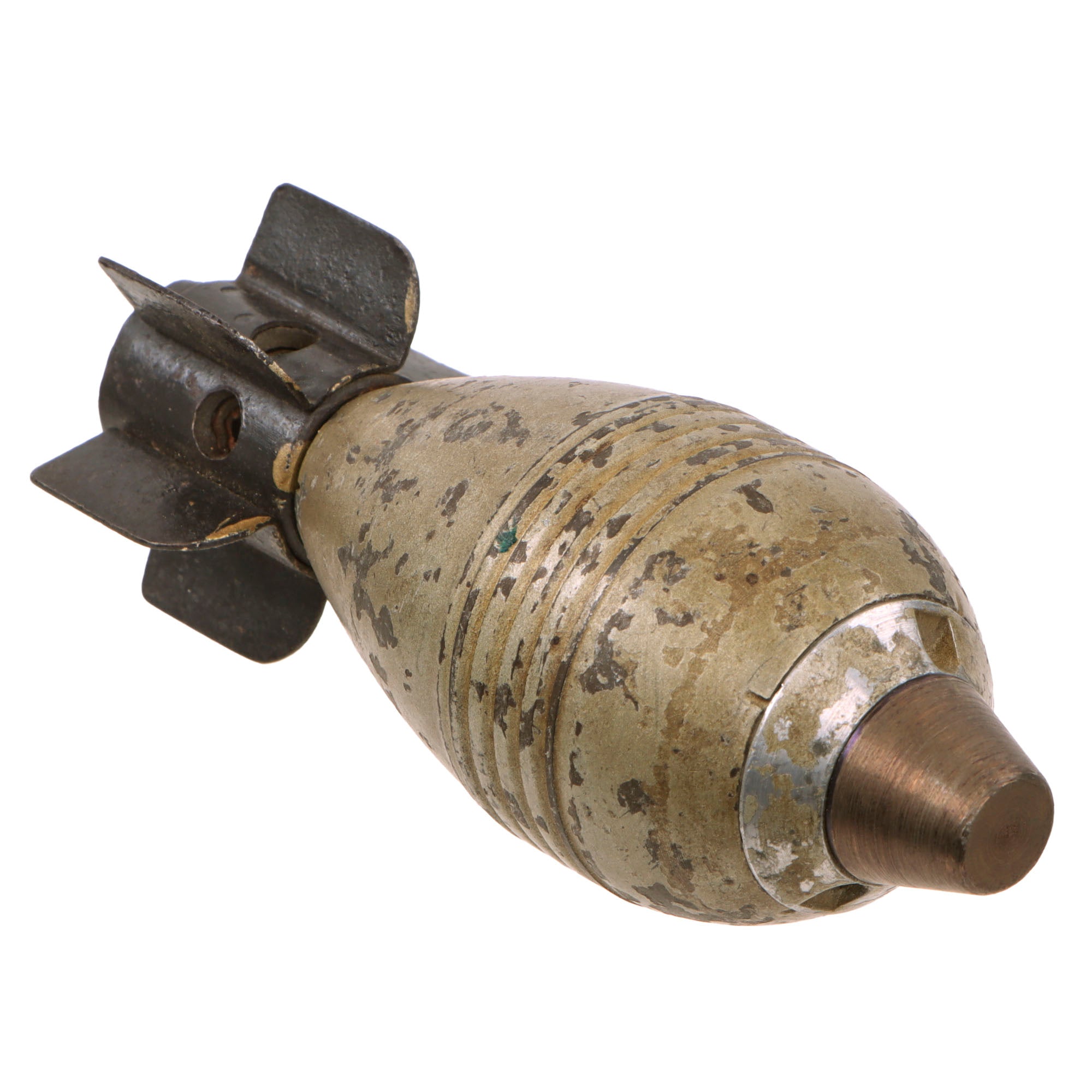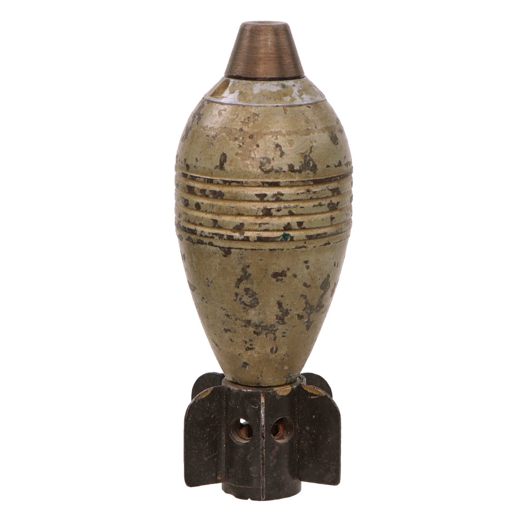 This is a great 50mm French mortar for the MLE37 mortar. This example is fitted with a fuze which is unscrewable, and the mount is also unscrewable, retaining the original detonation tube.