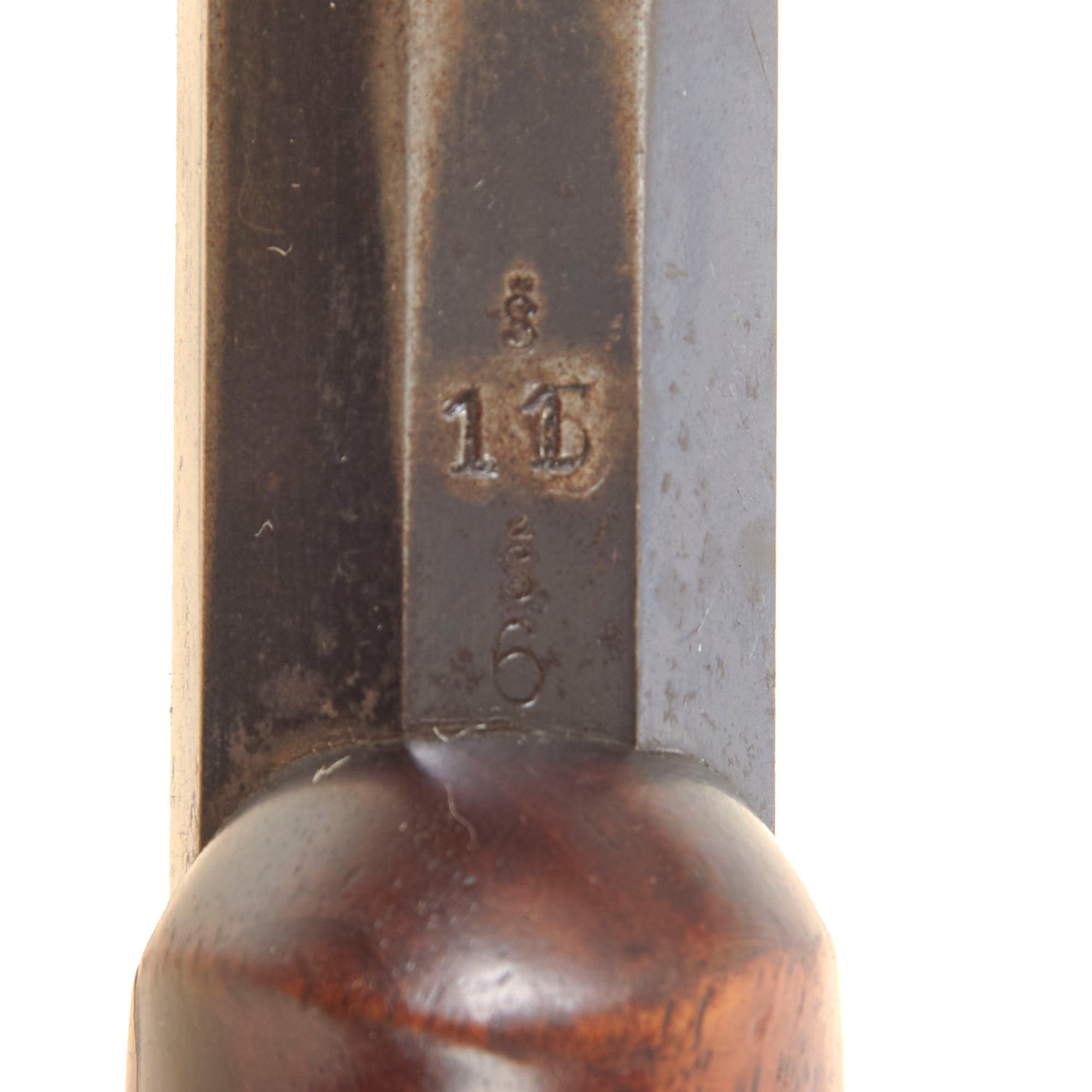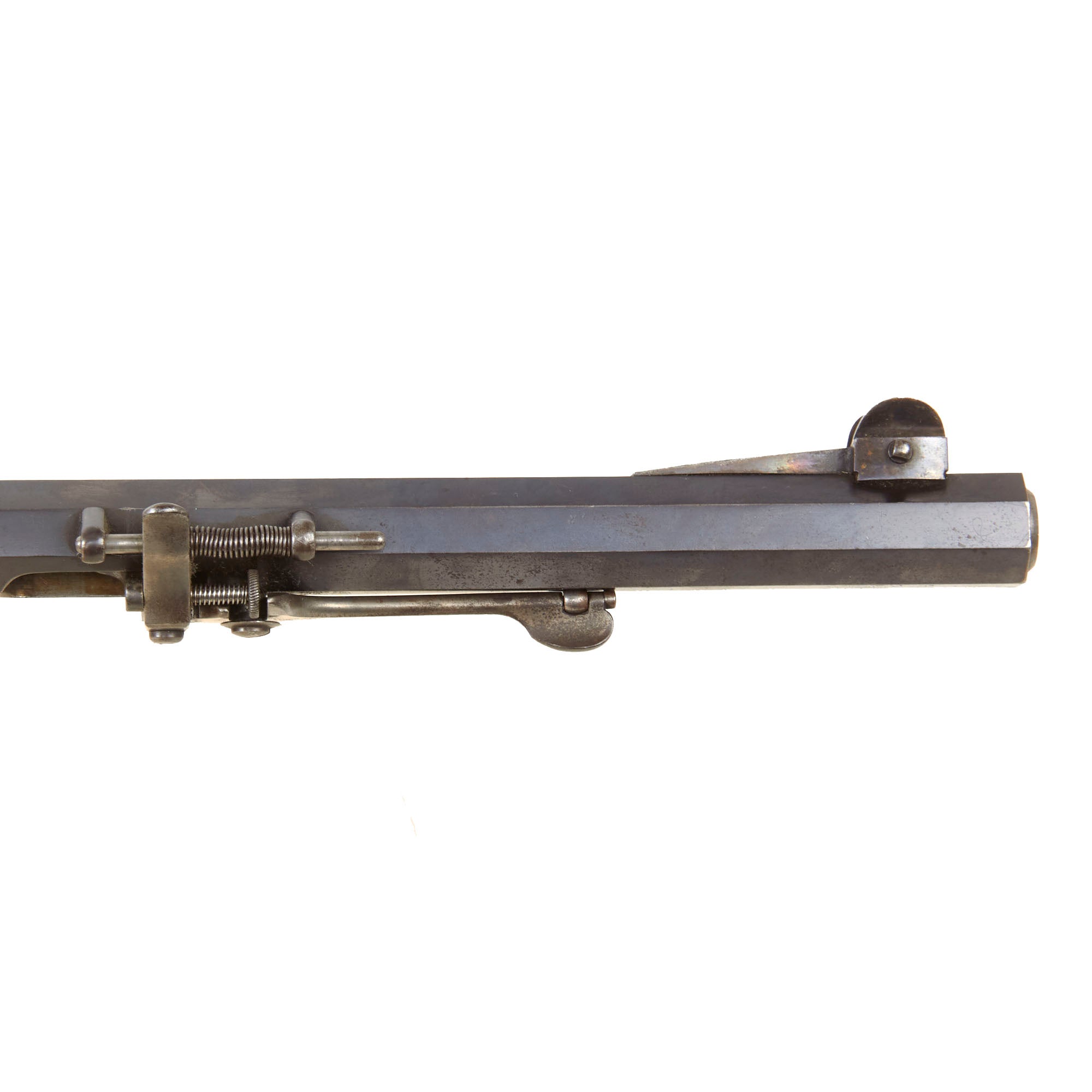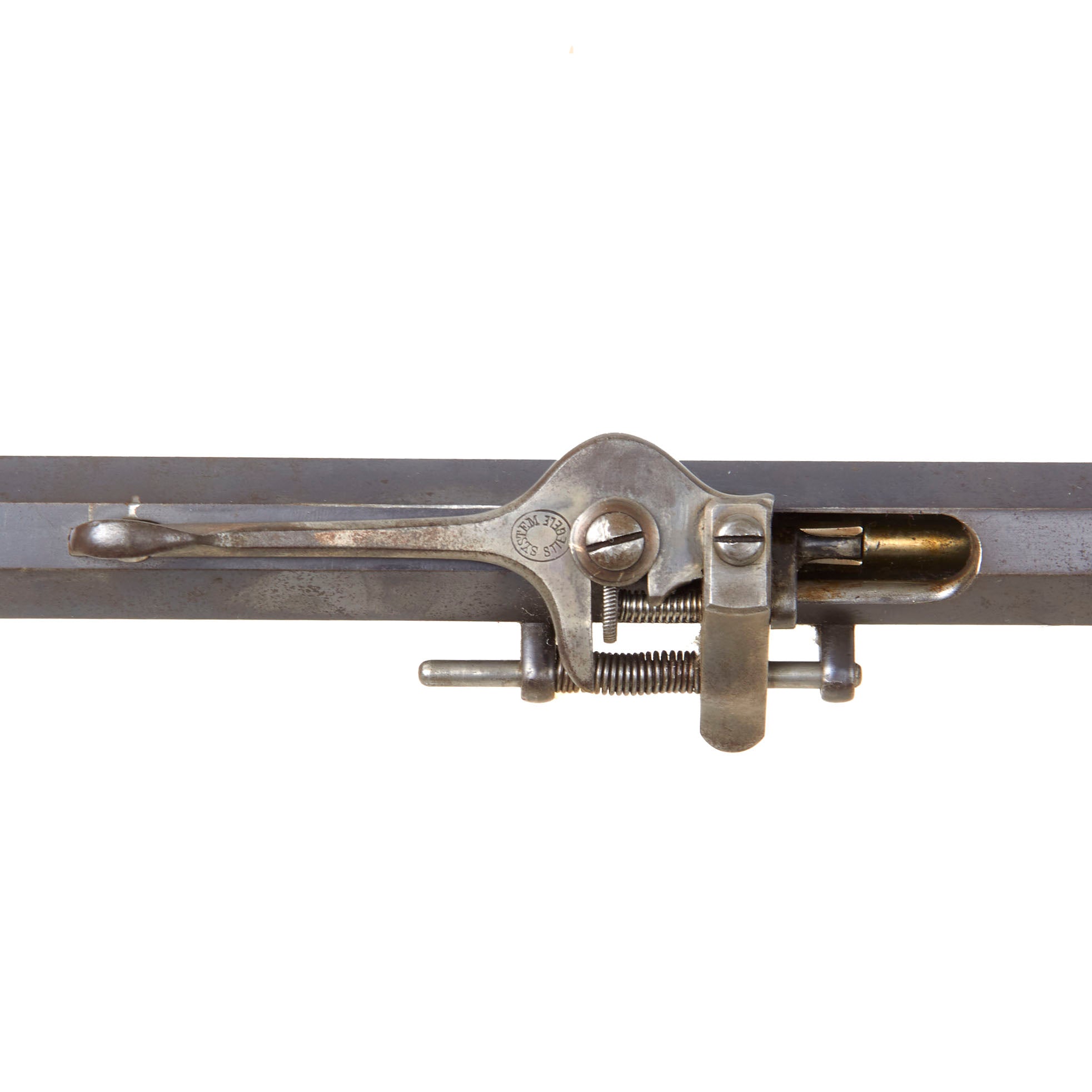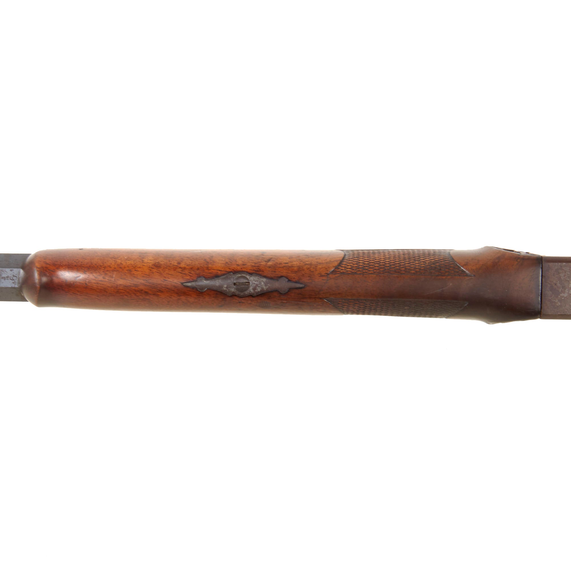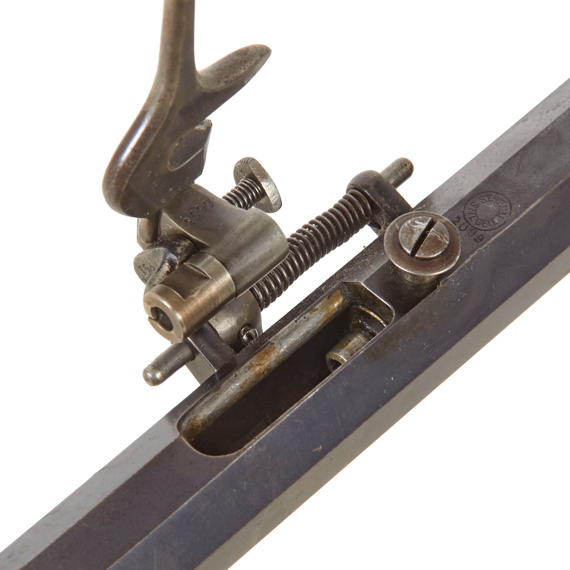 This example is half stocked, and is definitely different than most we see, as it is actually now currently set up as a 4.5mm pellet rifle. We do not know if this was the original configuration, but it definitely is now, and cannot be made to use any other type of projectile. It looks like it was based on or converted from a falling-block action, however that now pulls back a plunger that runs down the barrel, which when the trigger is pulled propels the pellet out of the 7 inch insert at the front of the rifle. As with other pellet guns we see, it is actually loaded through a hole in the bottom of the barrel about 7 inches from the muzzle. There is a small carrier for the pellet that rotates into the barrel, and then locks in place.
