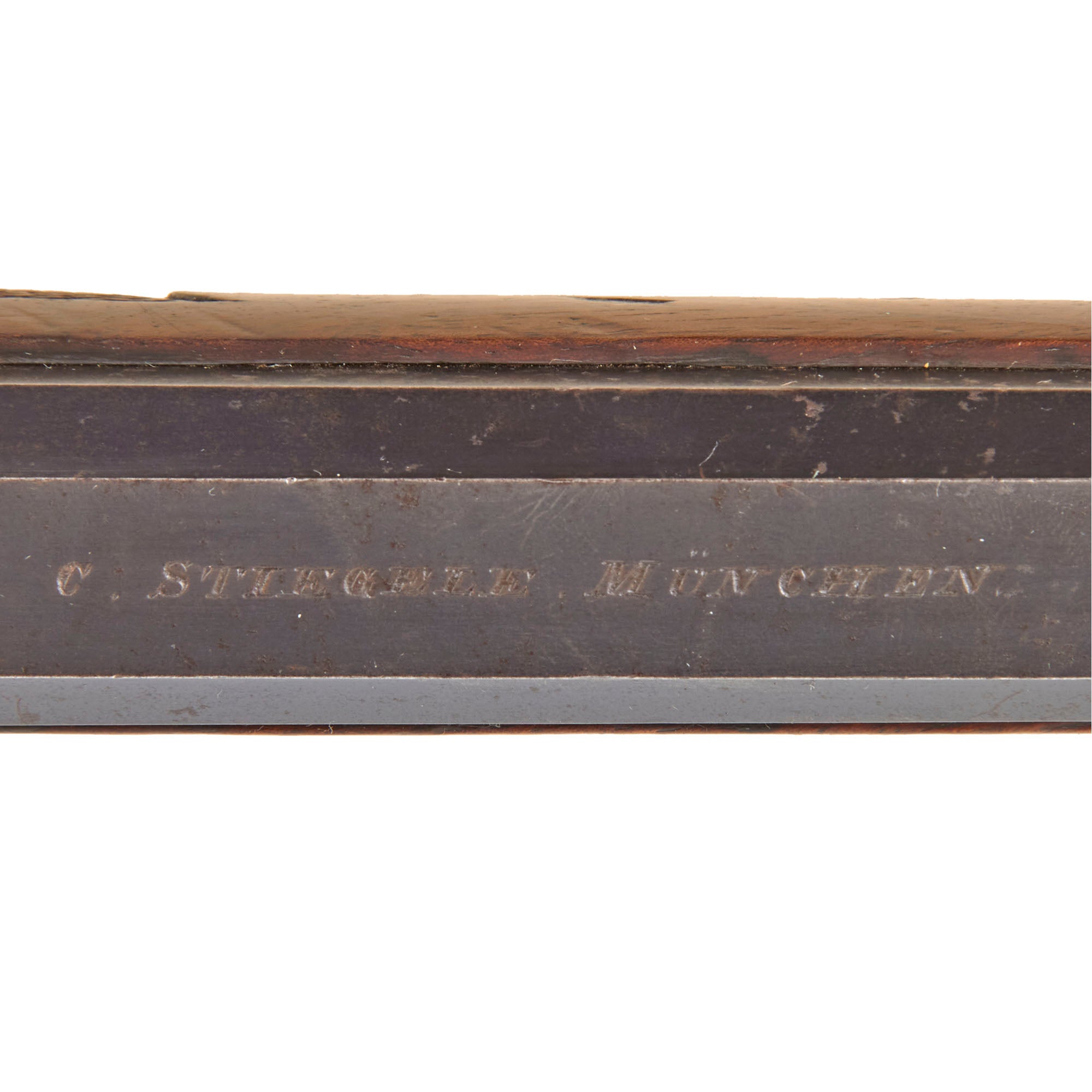 When Schützen became a competitive sport in Germany and the surrounding areas, many gun makers built these rifles to specifically fit an individual shooter. Being bespoke, that means that it will often not fit anyone else perfectly with regards to grip, length of pull, cheek rest configuration or even how the butt plate fits the shoulder. These were made by well known artisan level gunsmiths, and this example is marked on the top of the barrel with C. STIEGELE. MÜNCHEN, for very well-regarded maker Carl Anton Stiegele, located in Munich, Bavaria, Germany. He would later take into business his brother Gründer as well as his son Carl, during which time they made guns for many exceedingly well-heeled clients. A quick google search can find many examples, and we also found this lovely archive at German Hunting Guns - Stiegele, Carl Anton.