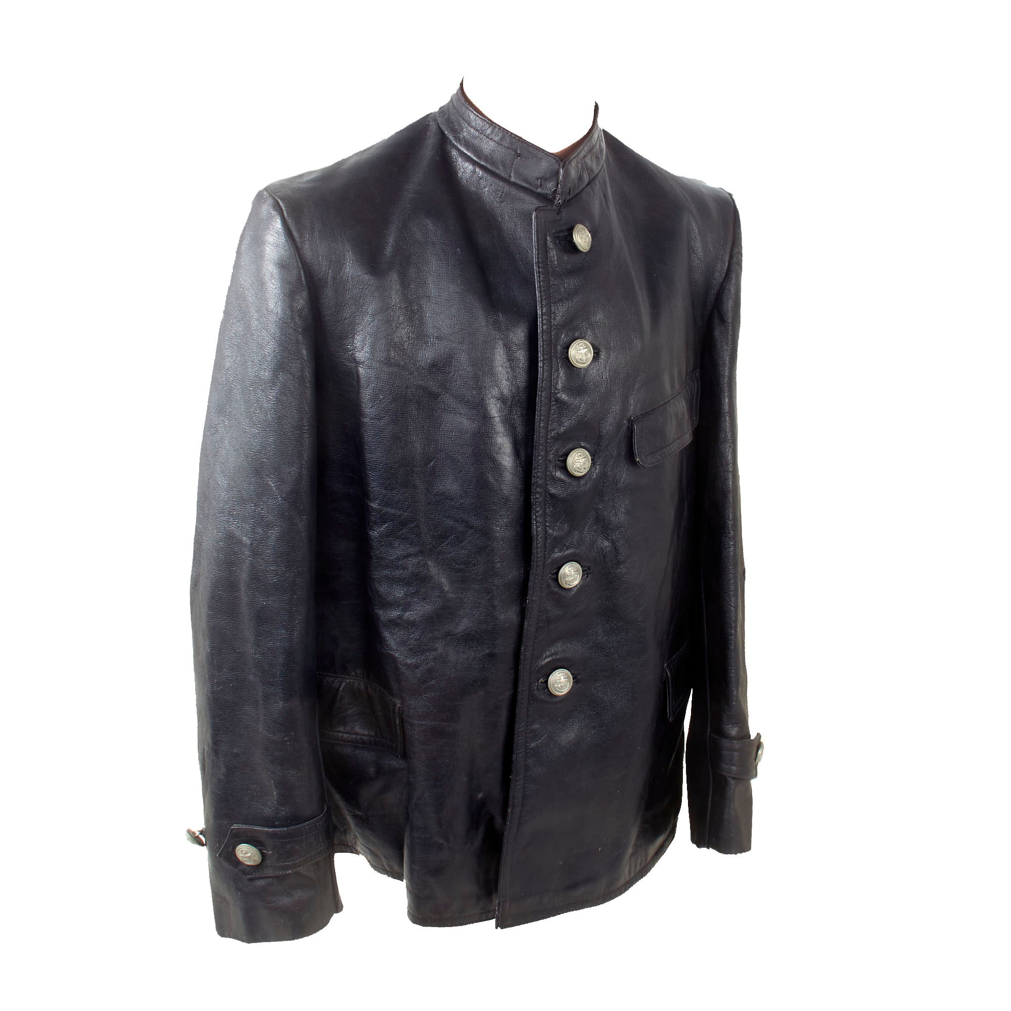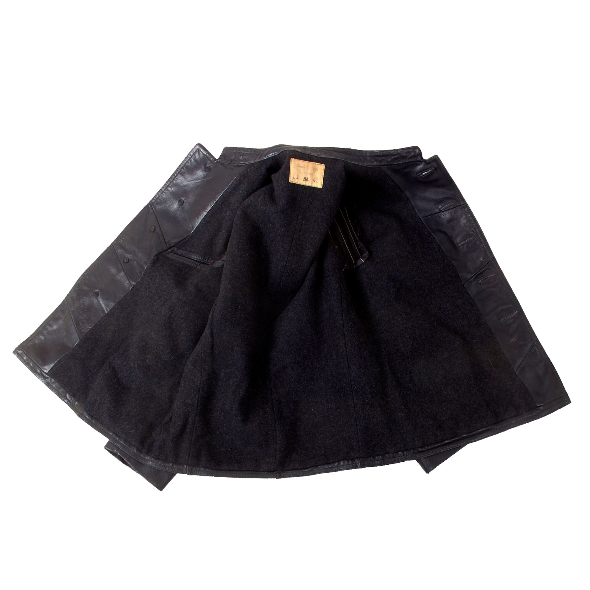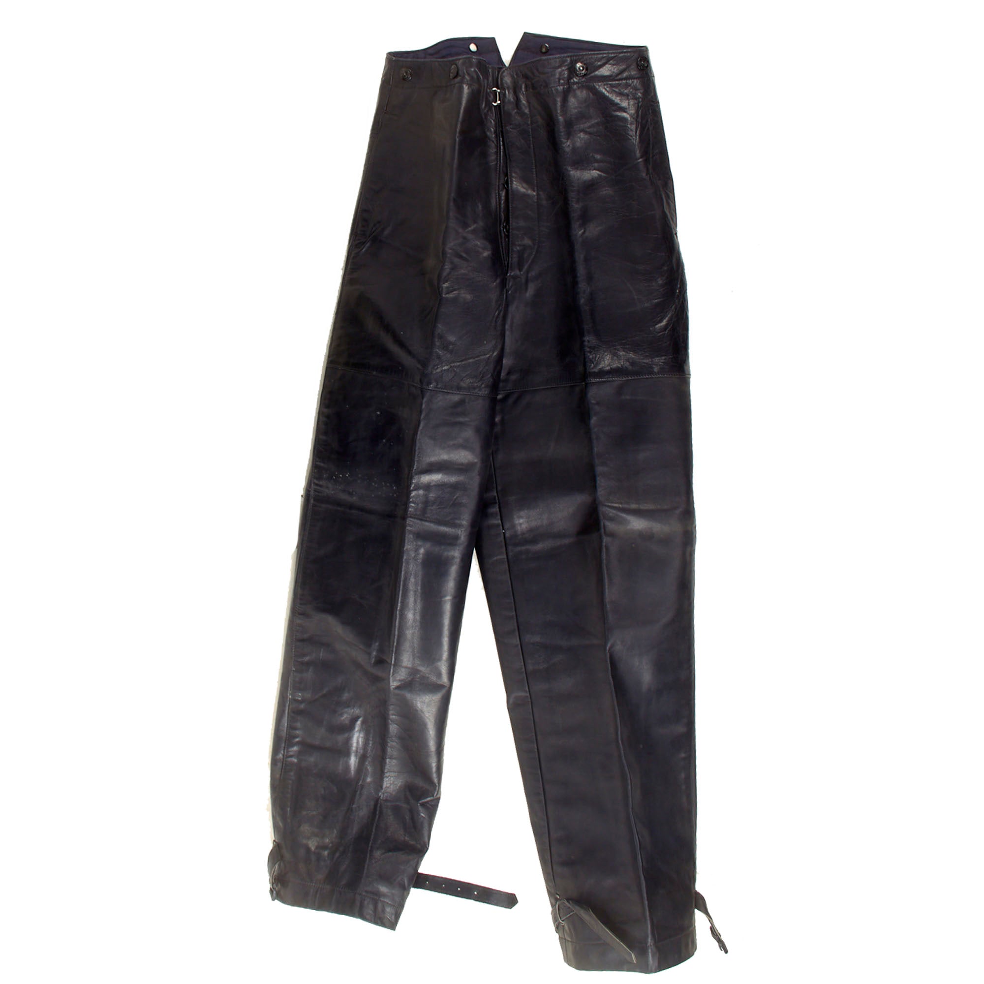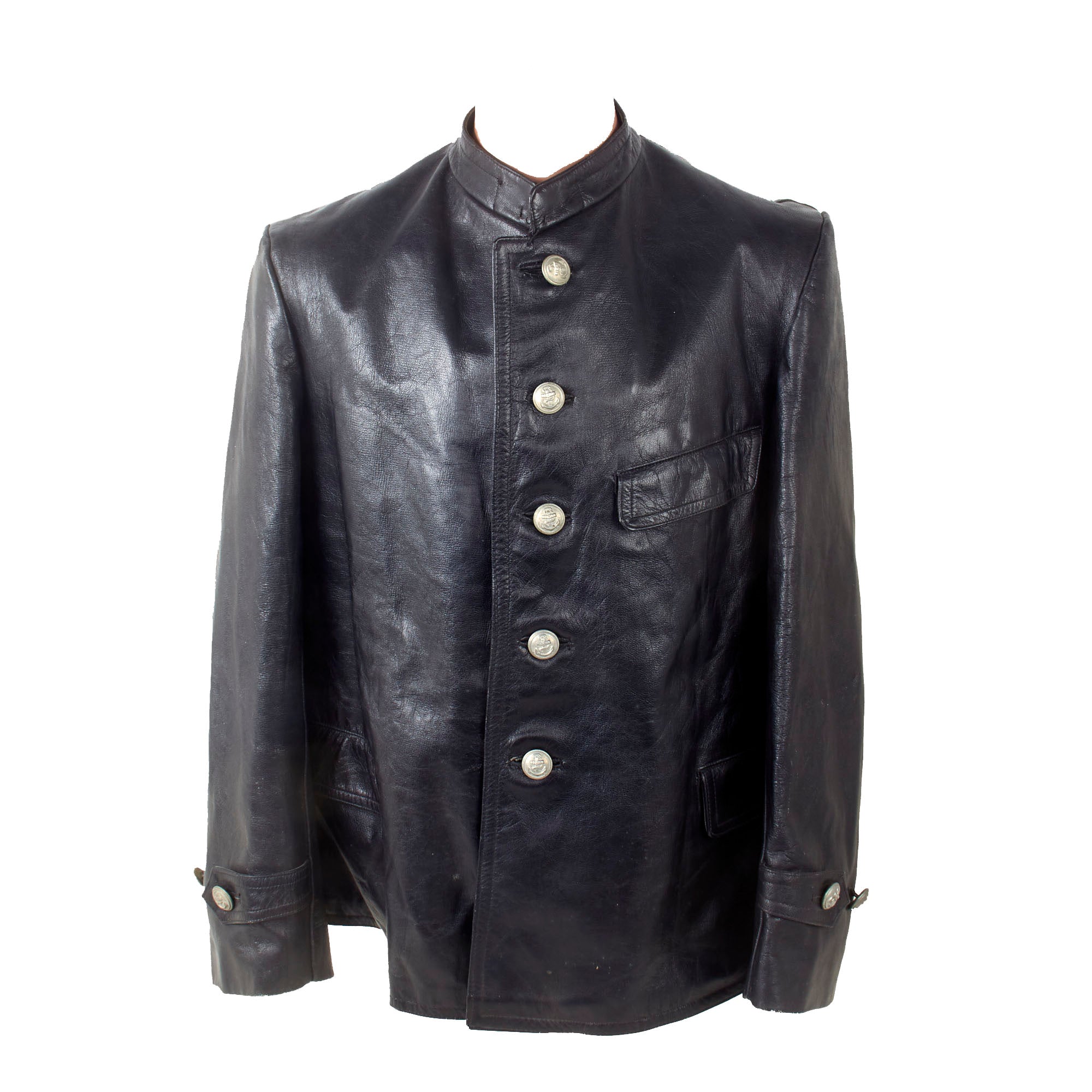 • Original Items: Only One Set Available. This is an outstanding private purchase two piece, black leather deck uniform in a variant pattern as worn by NCO Kriegsmarine personnel. The jacket, of heavy black leather with five button front closure furnished with classic German Kriegsmarine Naval buttons, all marked on the back by Overhoff & Cie, a known maker of buttons during the war. There is an additional hook and loop closure for the "Mandarin" style collar, which would definitely make putting on a hood easier. It features waist pockets with flaps, as well as a pocket on the left breast as well, so this was definitely an upmarket example, possibly used by an officer.