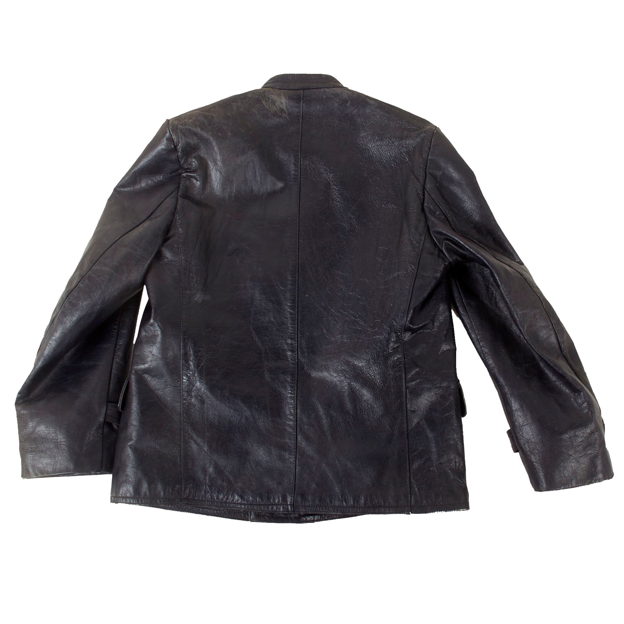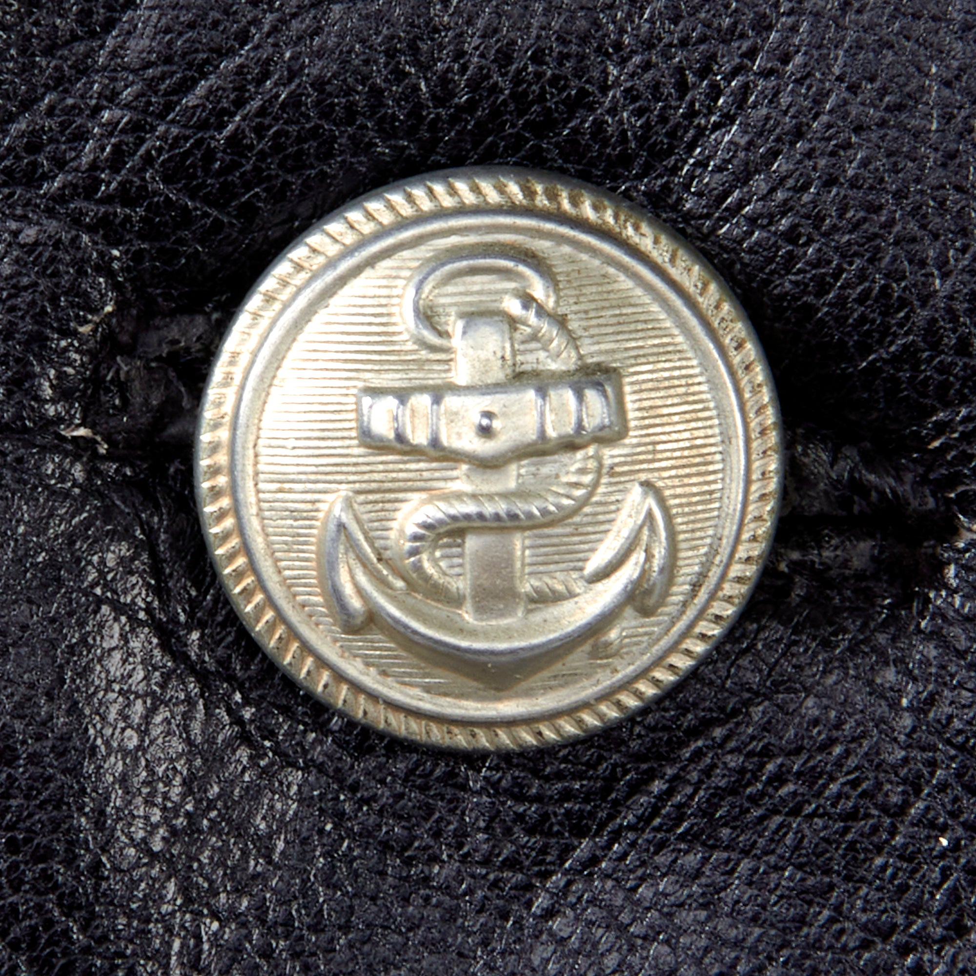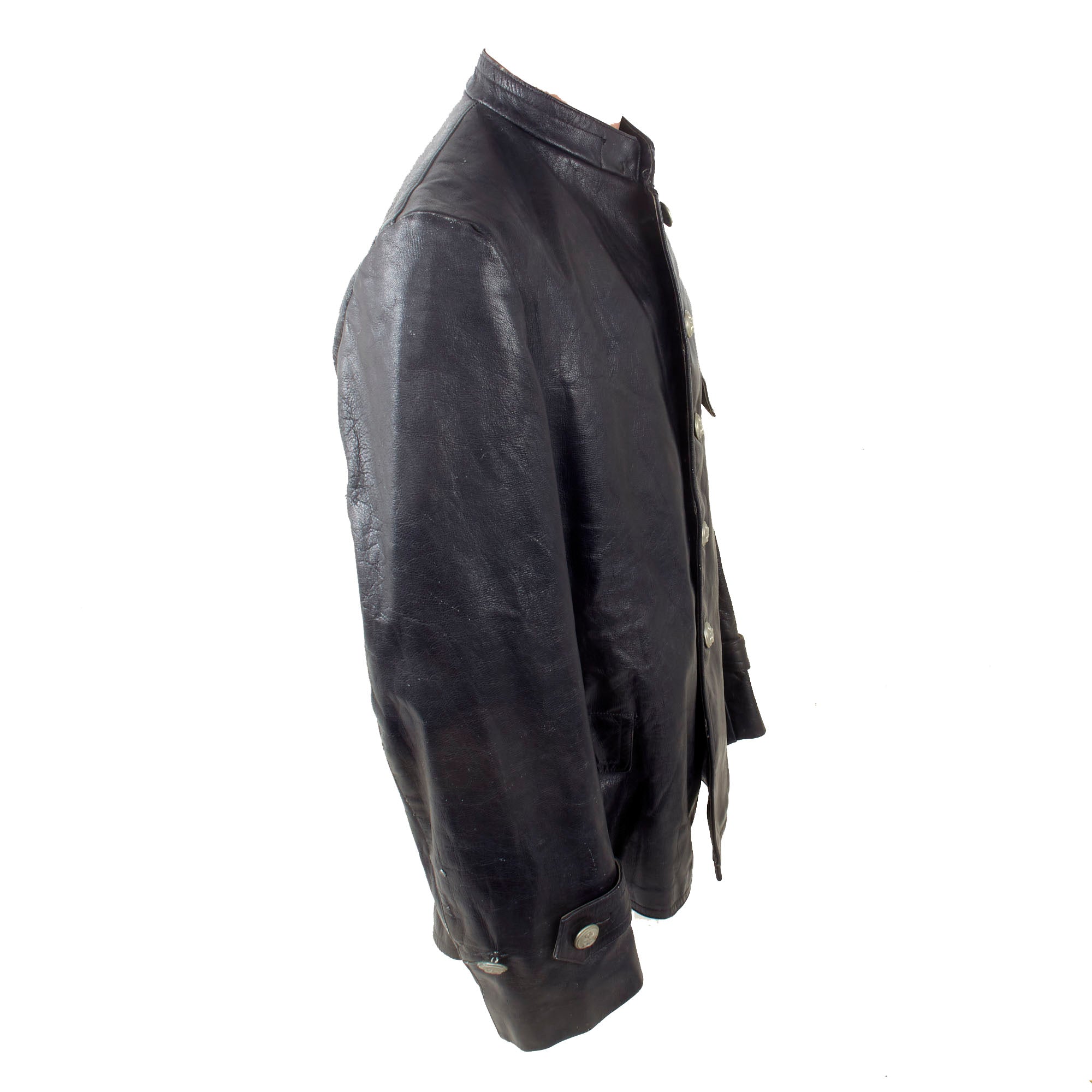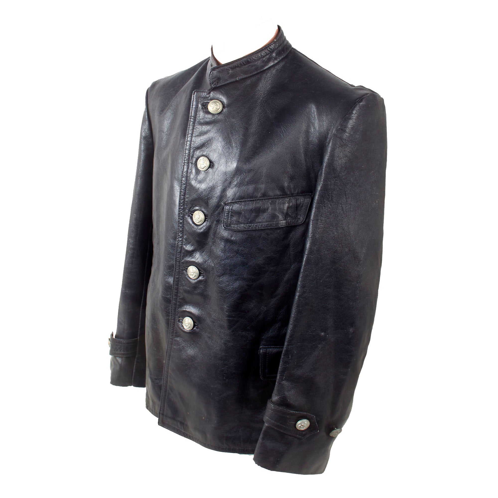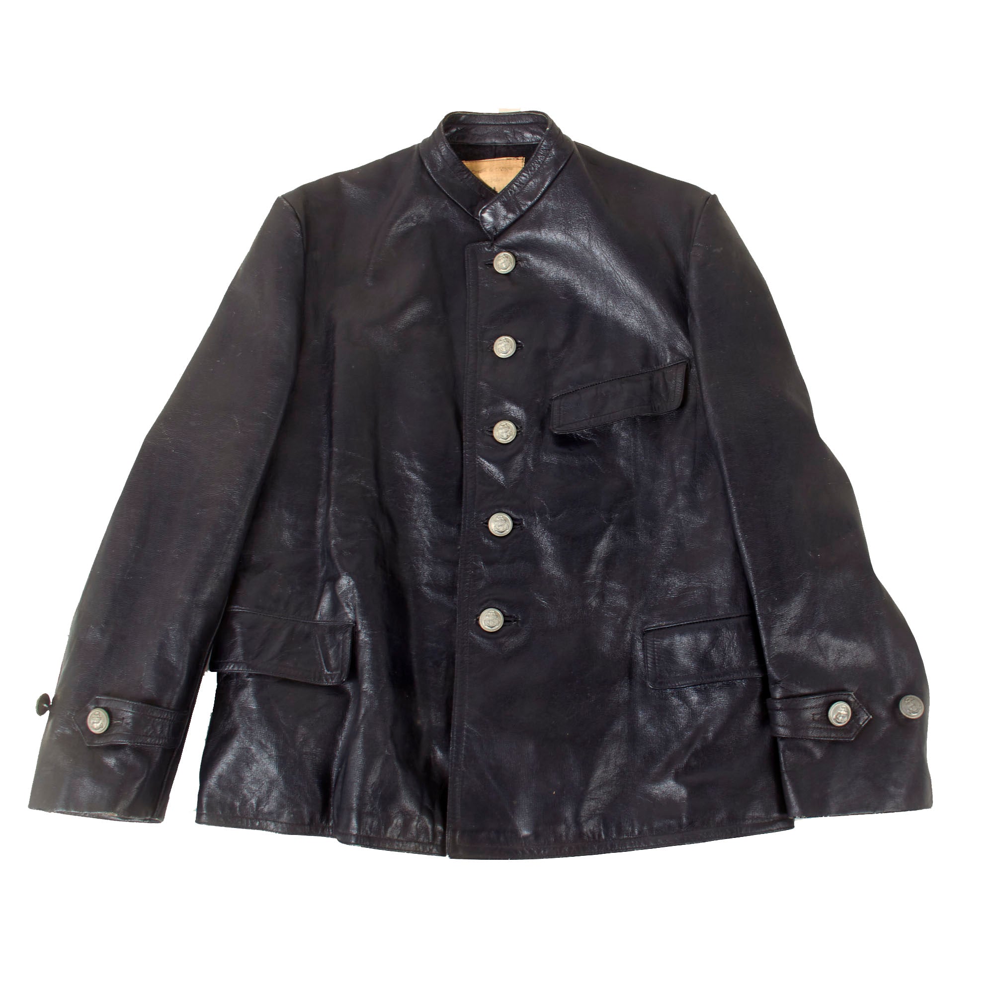 • Original Items: Only One Set Available. This is an outstanding private purchase two piece, black leather deck uniform in a variant pattern as worn by NCO Kriegsmarine personnel. The jacket, of heavy black leather with five button front closure furnished with classic German Kriegsmarine Naval buttons, all marked on the back by Overhoff & Cie, a known maker of buttons during the war. There is an additional hook and loop closure for the "Mandarin" style collar, which would definitely make putting on a hood easier. It features waist pockets with flaps, as well as a pocket on the left breast as well, so this was definitely an upmarket example, possibly used by an officer.