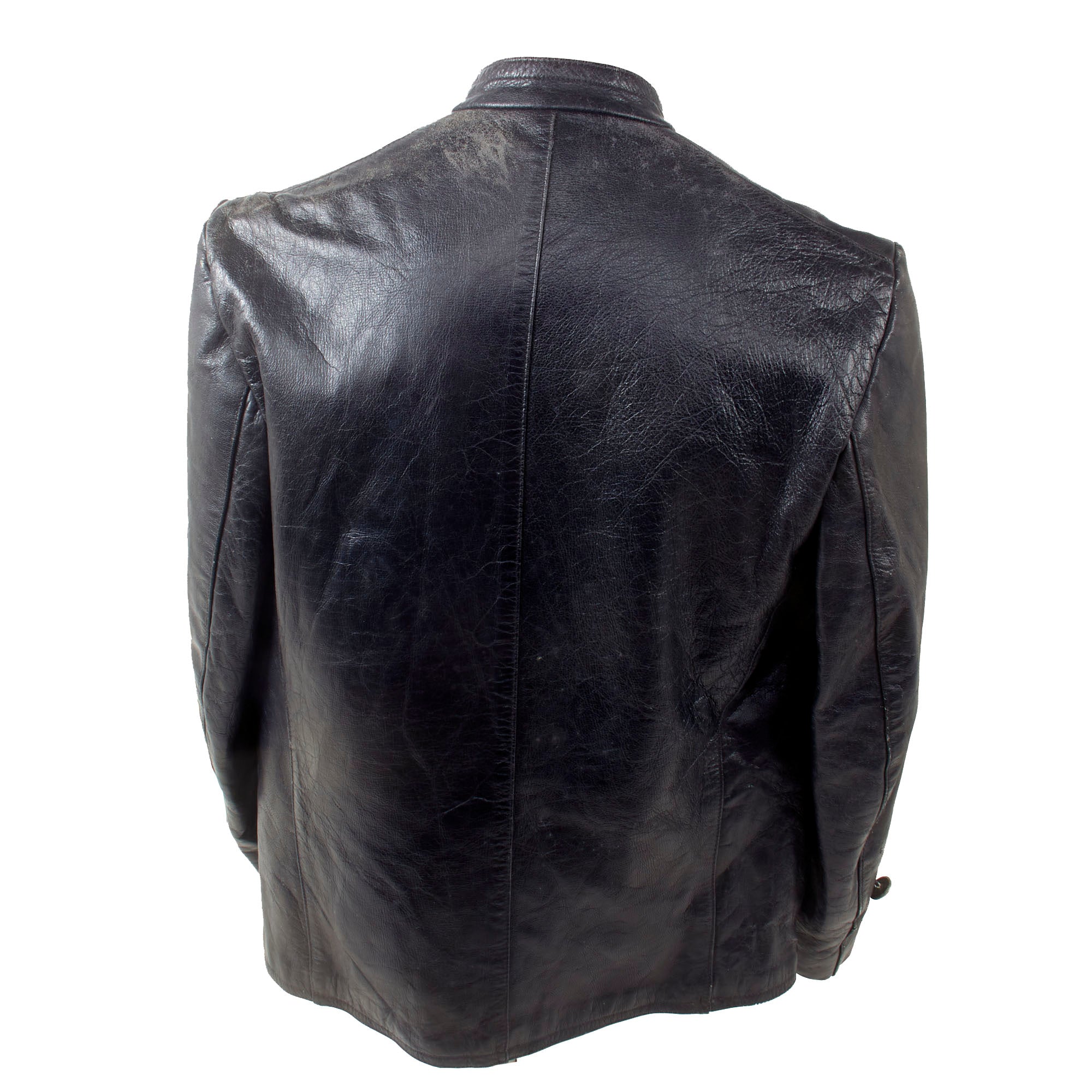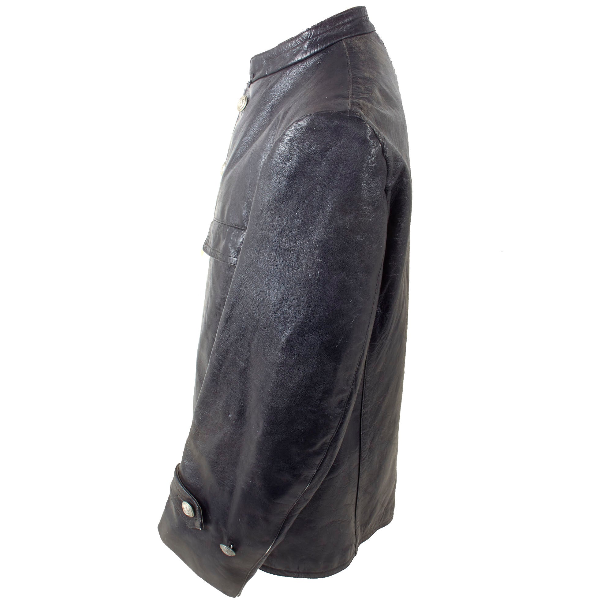 The interior is fully lined with charcoal gray wool, with silver striped black rayon in the sleeves, and has a slash pocket on the right interior. The jacket shows wear from use but is still in fantastic shape with the lining remaining almost entirely intact. There is a maker’s tag on the interior faintly reading: