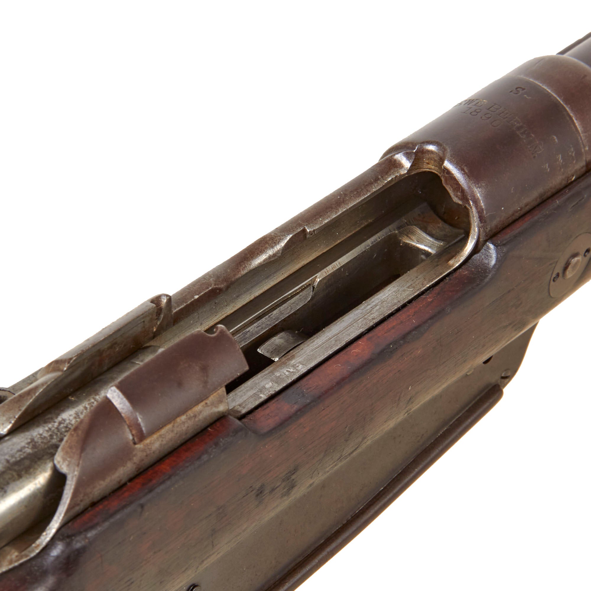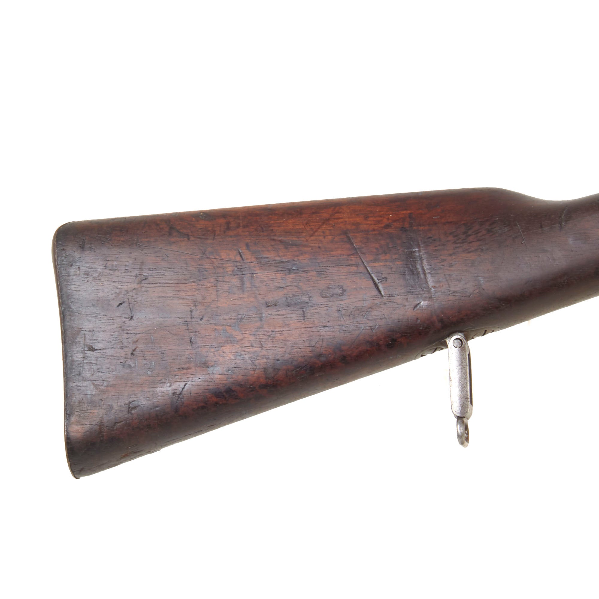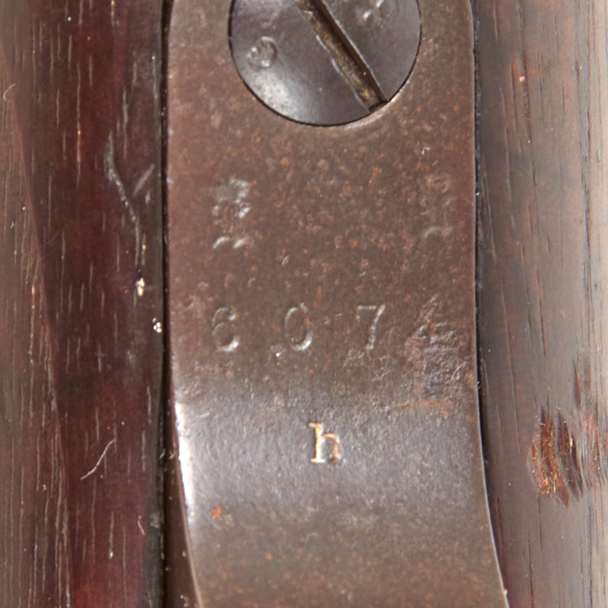 Rifle is in very good service used condition, with a lovely stock that has a great worn patina from use and long service. It definitely looks to have been arsenal reconditioned, which has unfortunately made the original proof markings very faint, but has also given it a beautiful red-brown color, with areas stained darker from exposure and gun oil. We do not see any major cracks, and the front sling swivel is still present, and a sling swivel clip attached to the rear fitting, so that a standard sling can be used.