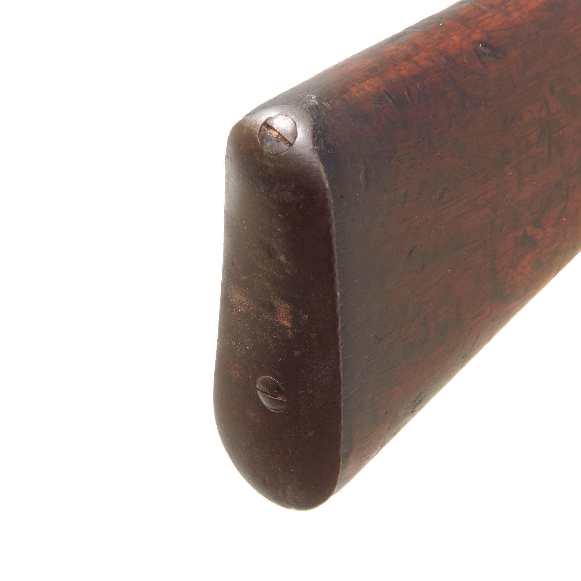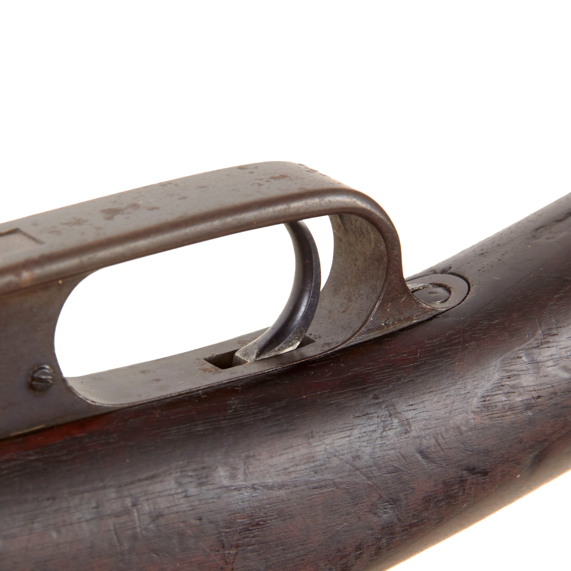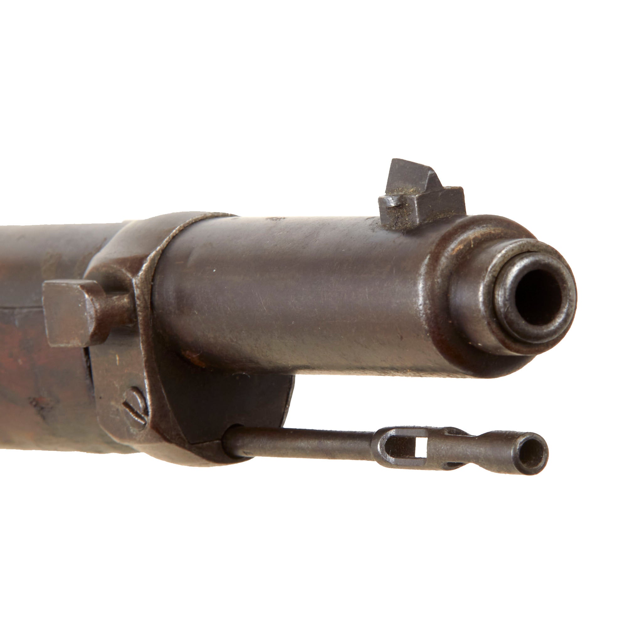 The metalwork is in good service used condition, with just a bit of the original bluing retained the barrel jacket, while the bright steel receiver is now mostly stained from surface oxidation. There is some wear on the bolt bearing surfaces, however the bore is actually in very good condition. It has clear lands and grooves with a mostly bright finish, showing just a bit of rounding on the lands. The rare double-slot cleaning rod is still present, as is the bolt extractor, which is easily lost during cleaning. The firing pin and extractor are both still present, and the action cycles nicely, with the safety fully functional. The bolt release works well, though the securing screw has the top broken off.