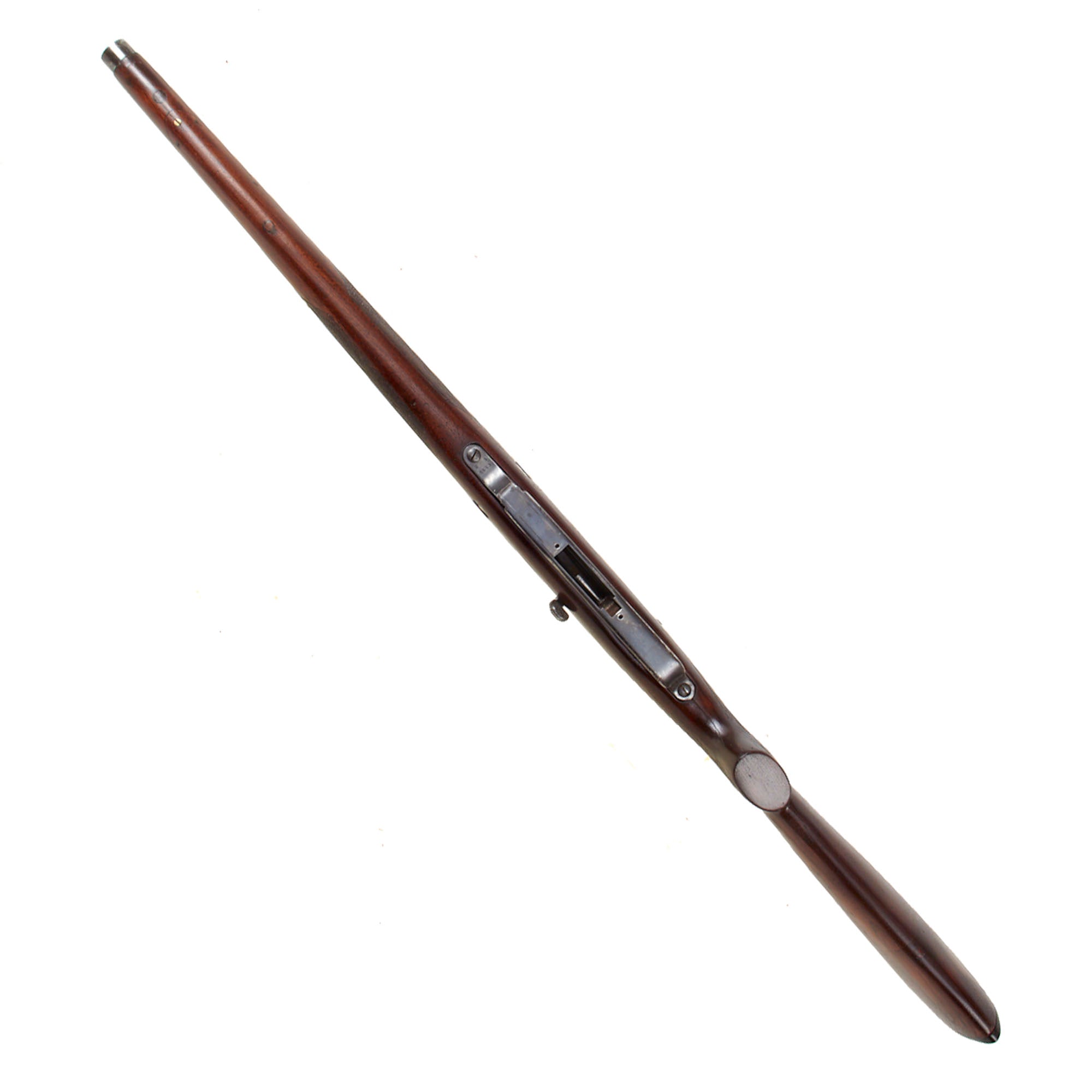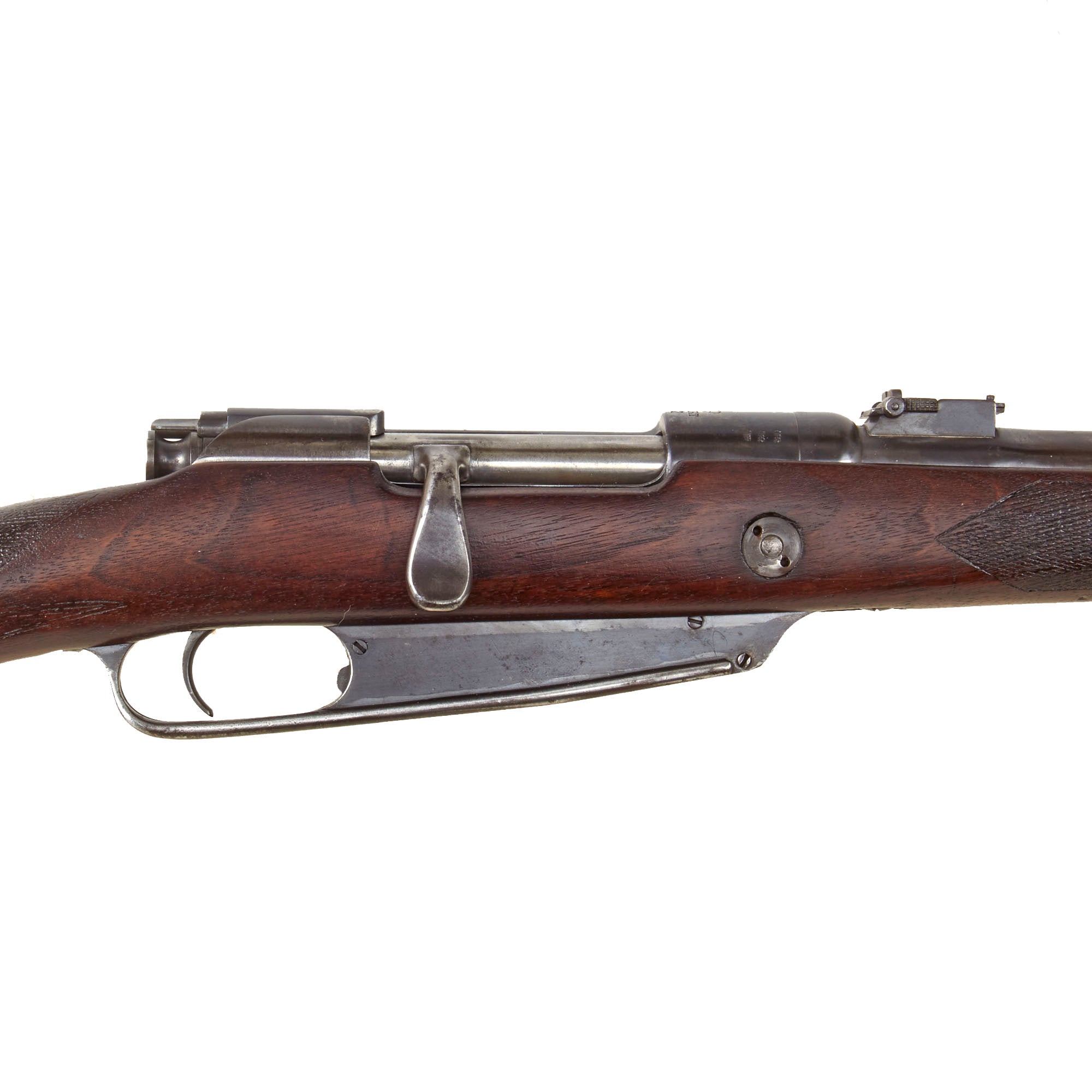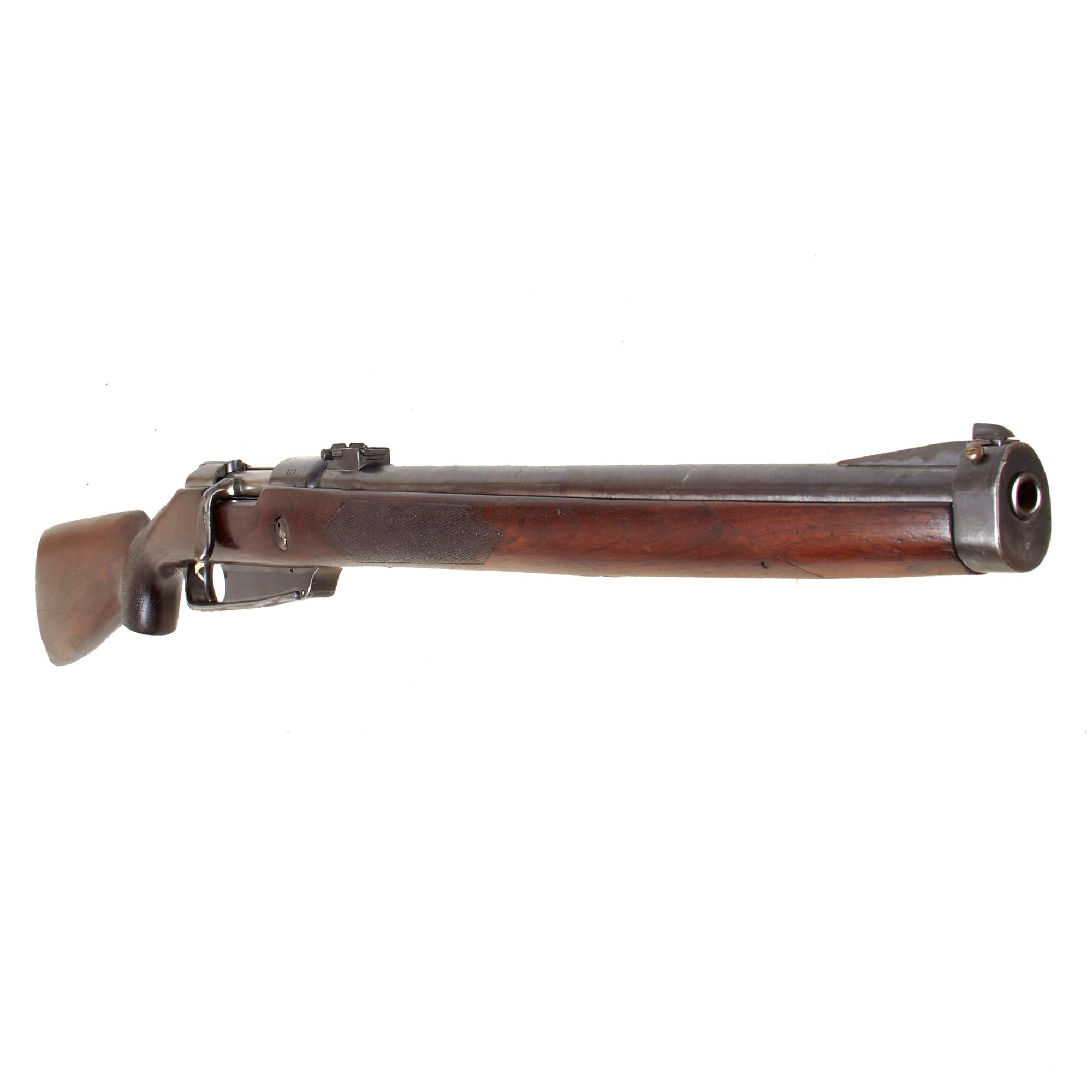 Our example is of the Artillery Carbine Gewehr 91, however this example has had the stock replaced and also had some modifications made to the other components. It was VERY well done however, and the stock has a lovely "pistol grip" as well as checkering on the wrist and fore stock. It does look like the stock was made from multiple pieces of wood, probably adapted from other stocks and re-shaped. The "ears" on the nose cap were removed, and a new front sight installed. It also has two threaded holes in the left side of the receiver, almost certainly for the attachment of a scope or scope mount, now removed. Definitely a carbine with an extensive history!