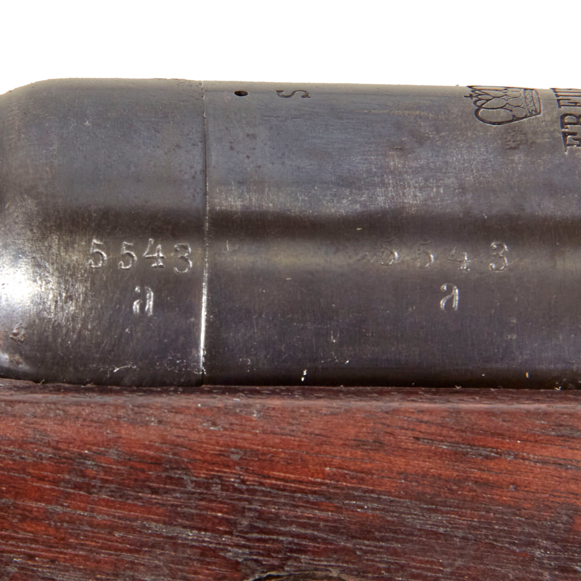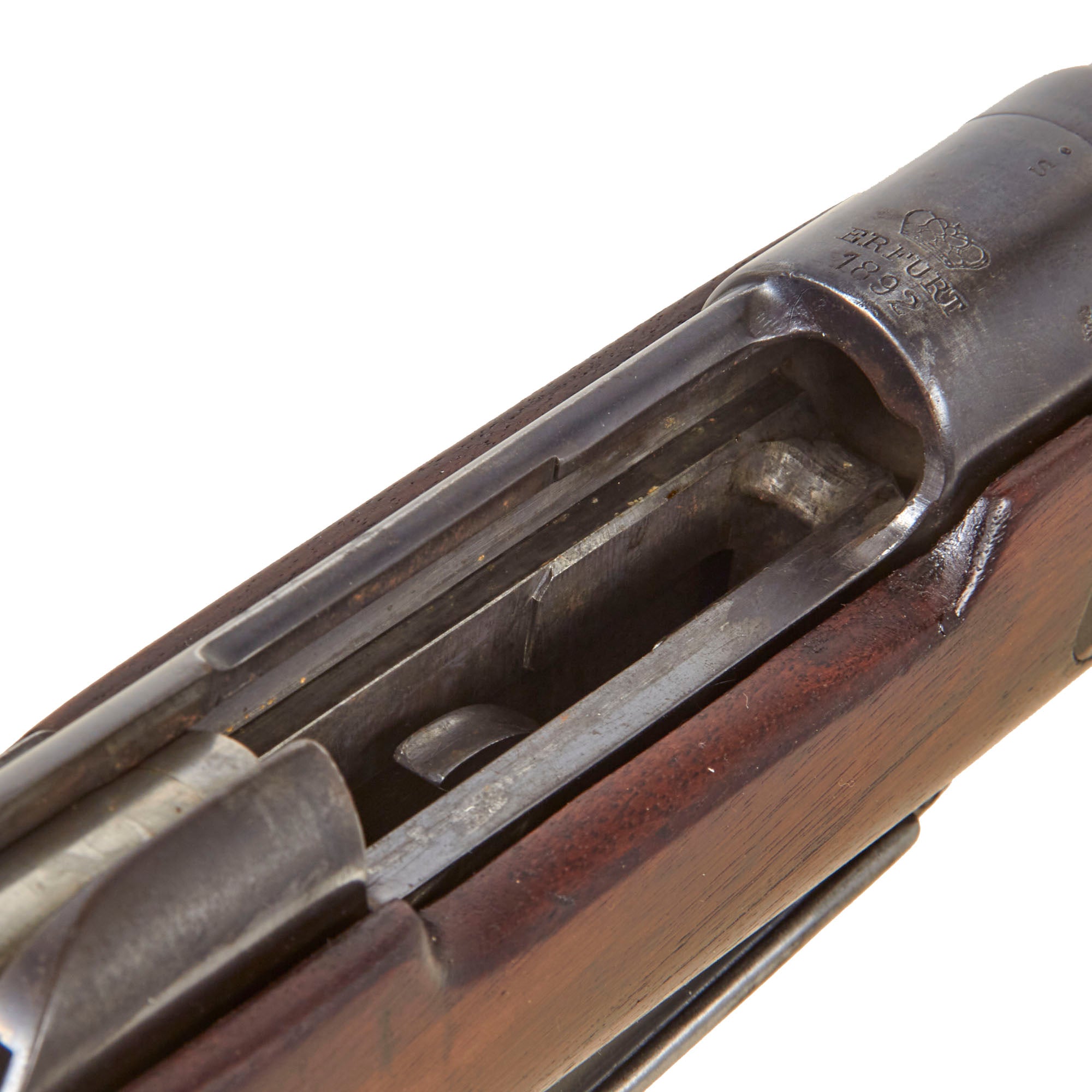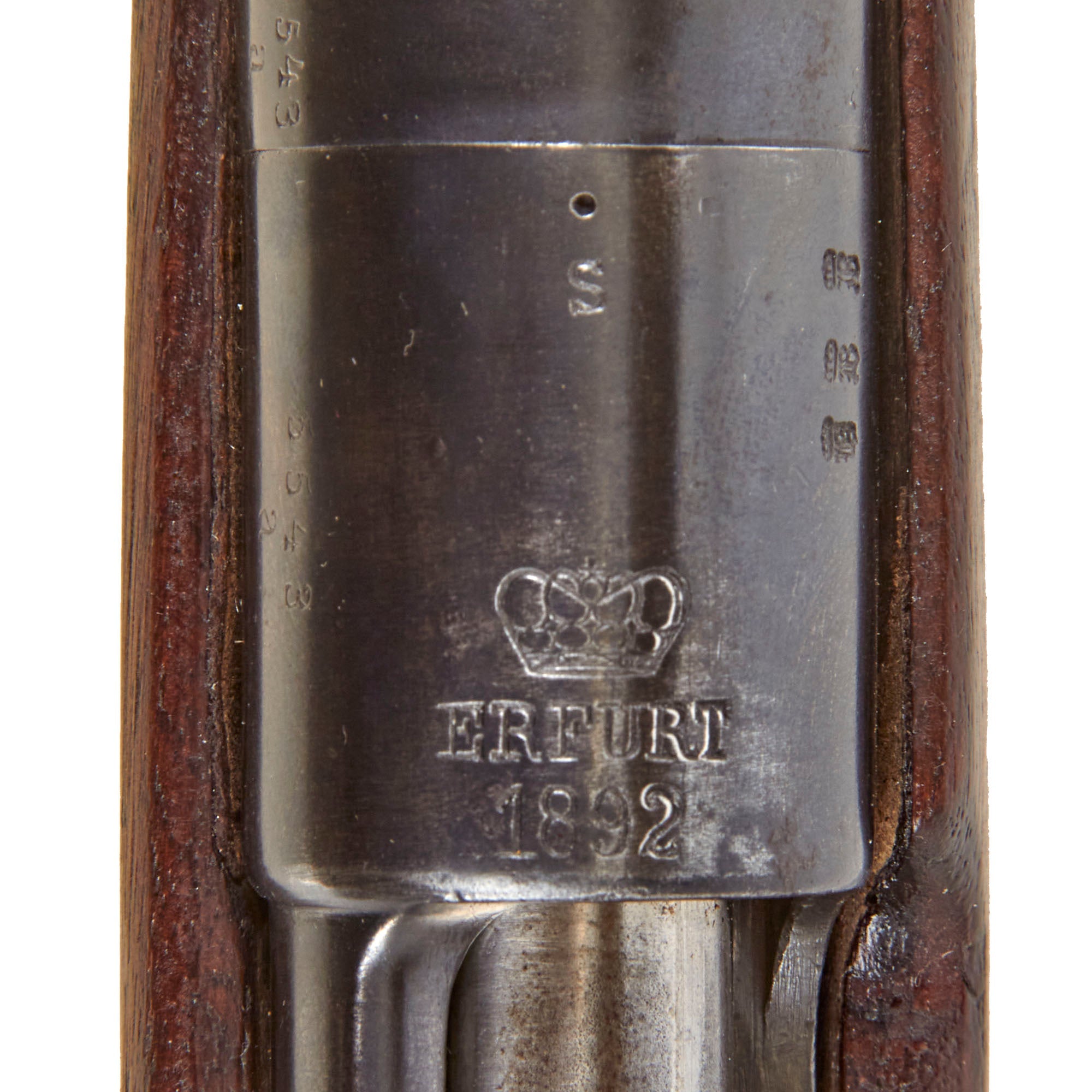 The receiver is marked over the chamber with (CROWN) / ERFURT. / 1892., for 1892 manufacture at the Imperial Erfurt Arsenal, located in Thuringia. The right side of the receiver is marked with Gew. 91. in German blackface type, and there are additional proof marks on various components of the carbine. The barrel and receiver of the are marked with serial number 5543 / a, which is also present on the main body of the bolt, while the safety, firing pin holder are marked with shortened number 43. The magazine well is also marked with 5543, and the nose cap is marked with 43, which makes this a great "ALL MATCHING" example, in spite of the stock being entirely replaced.