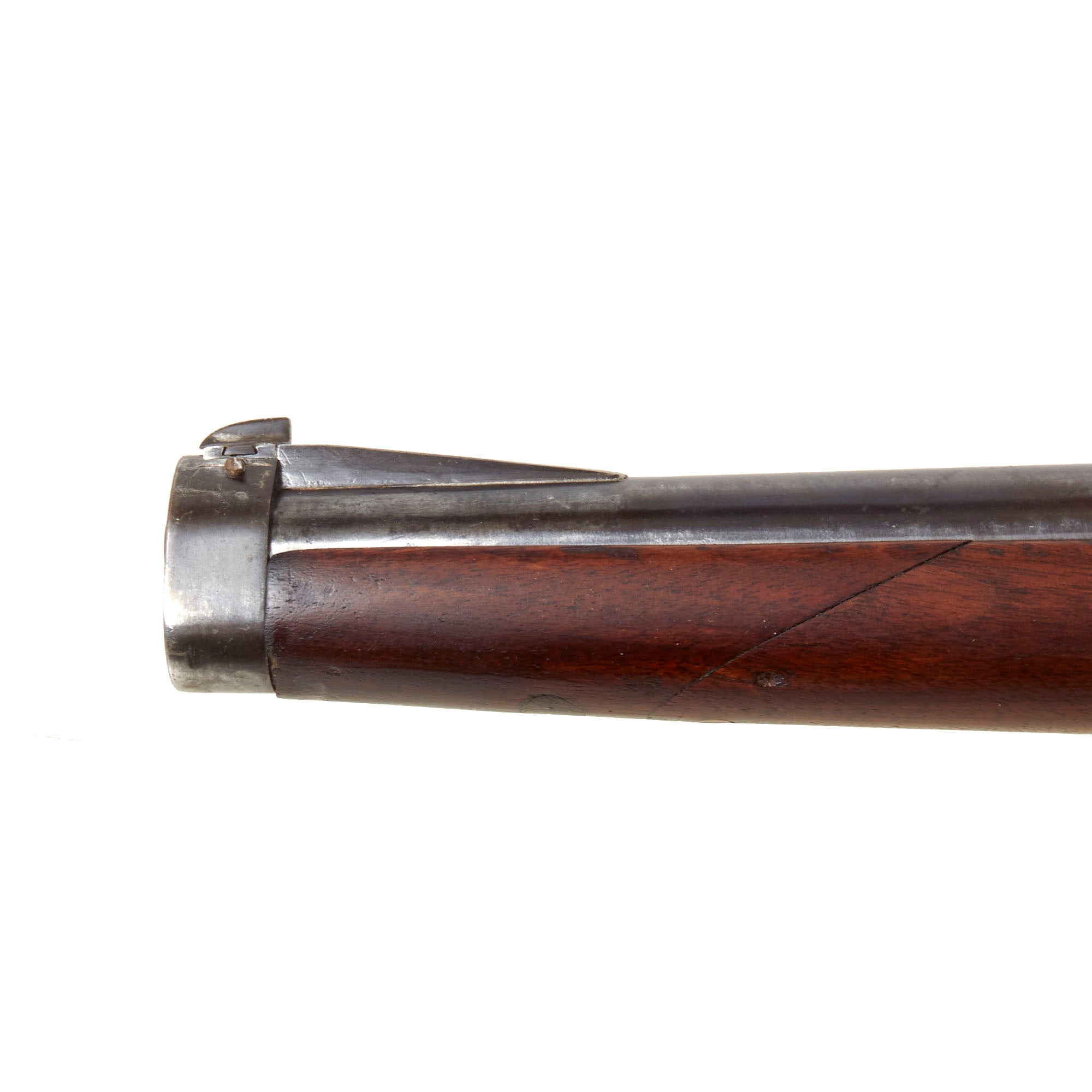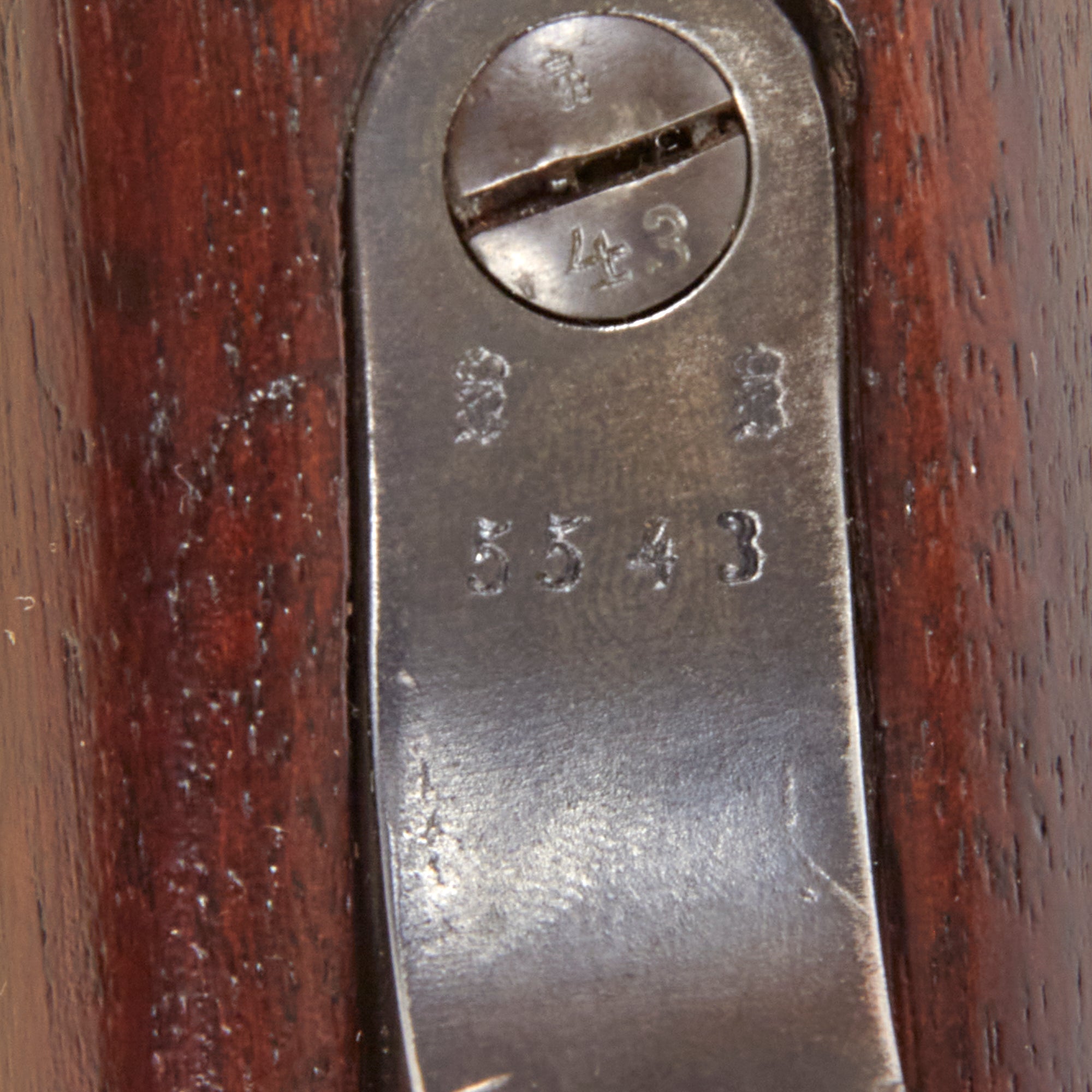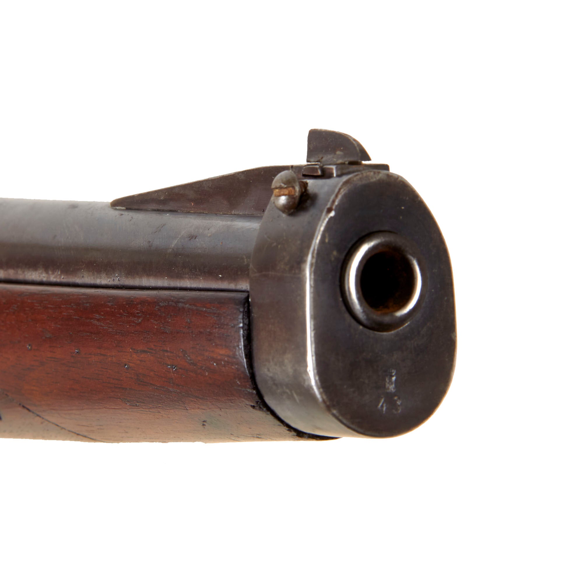 The receiver is marked over the chamber with (CROWN) / ERFURT. / 1892., for 1892 manufacture at the Imperial Erfurt Arsenal, located in Thuringia. The right side of the receiver is marked with Gew. 91. in German blackface type, and there are additional proof marks on various components of the carbine. The barrel and receiver of the are marked with serial number 5543 / a, which is also present on the main body of the bolt, while the safety, firing pin holder are marked with shortened number 43. The magazine well is also marked with 5543, and the nose cap is marked with 43, which makes this a great "ALL MATCHING" example, in spite of the stock being entirely replaced.