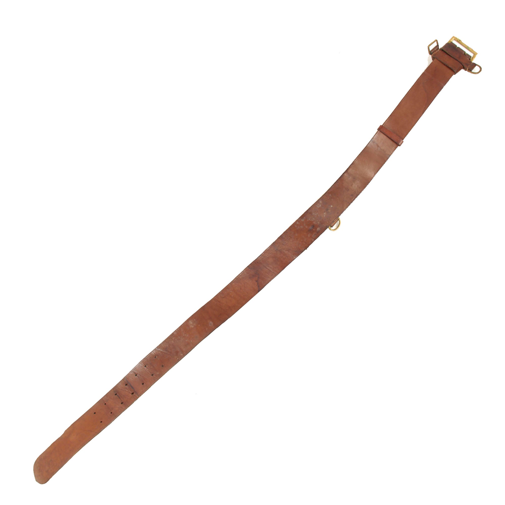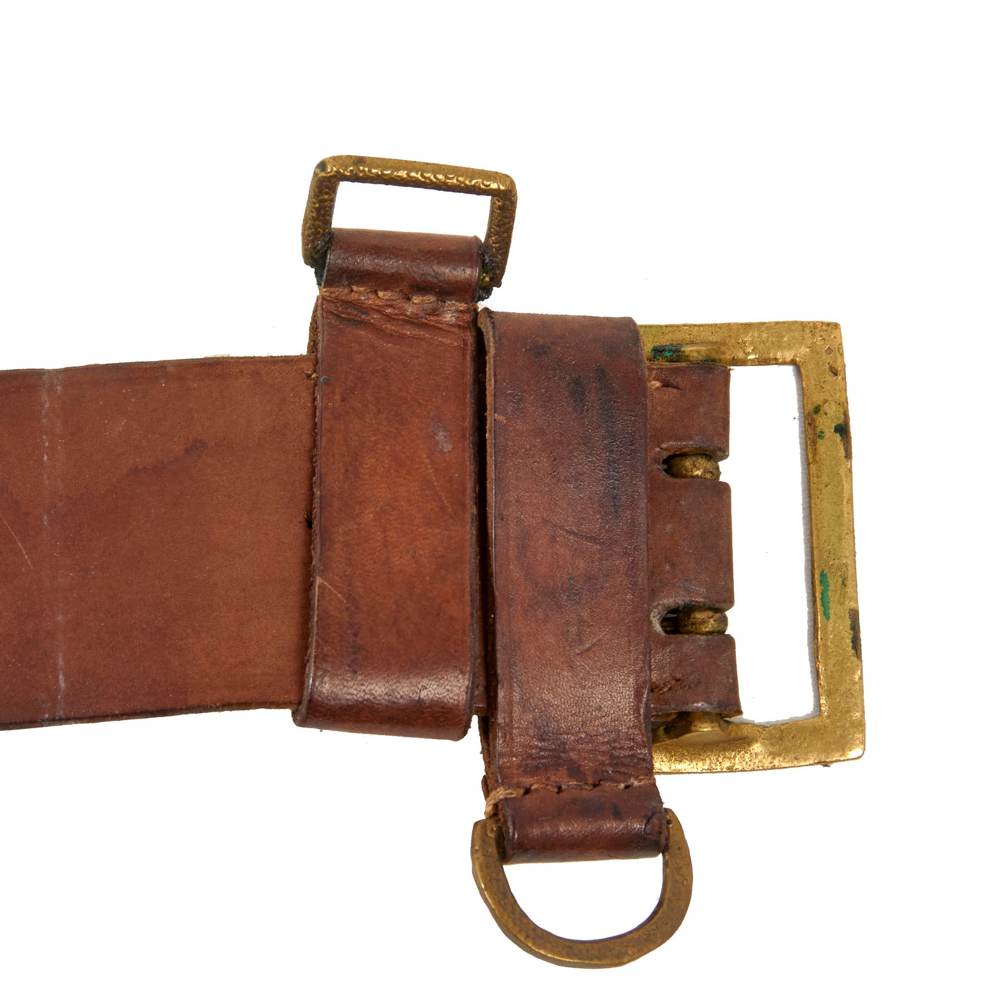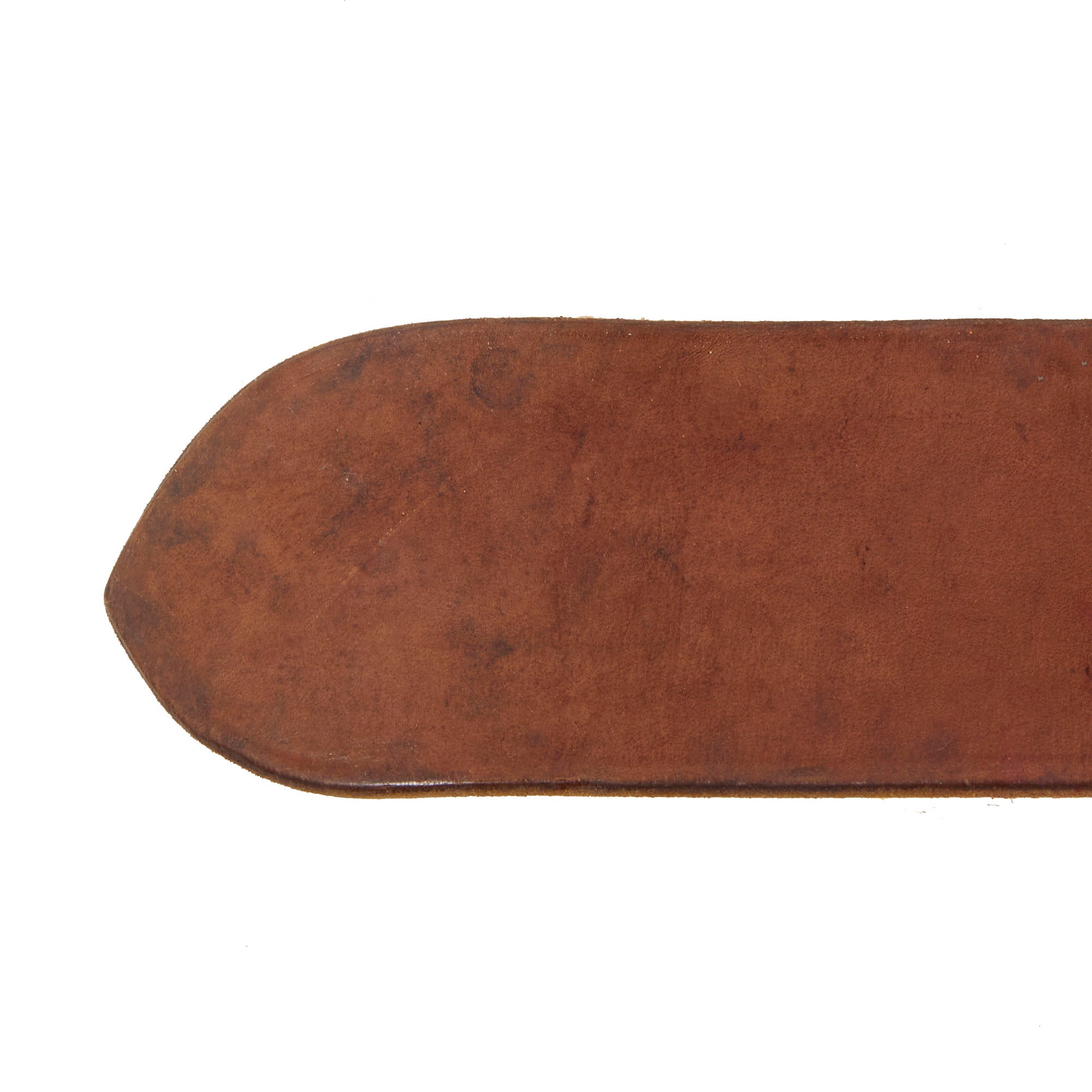 The belt is still in lovely condition, with the leather relatively supple, and it looks to have seen light to moderate use during the war. There is some staining, as well as wear and rounding to the edges of the belt. The brass buckle has a lovely mellow patina, and attaches easily to the other end of the belt.