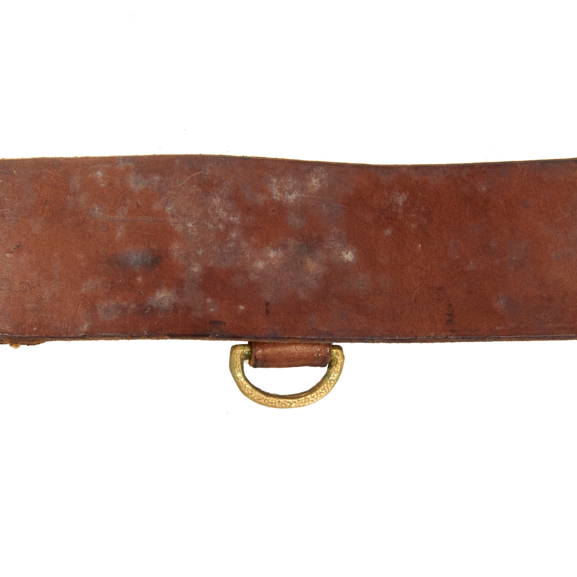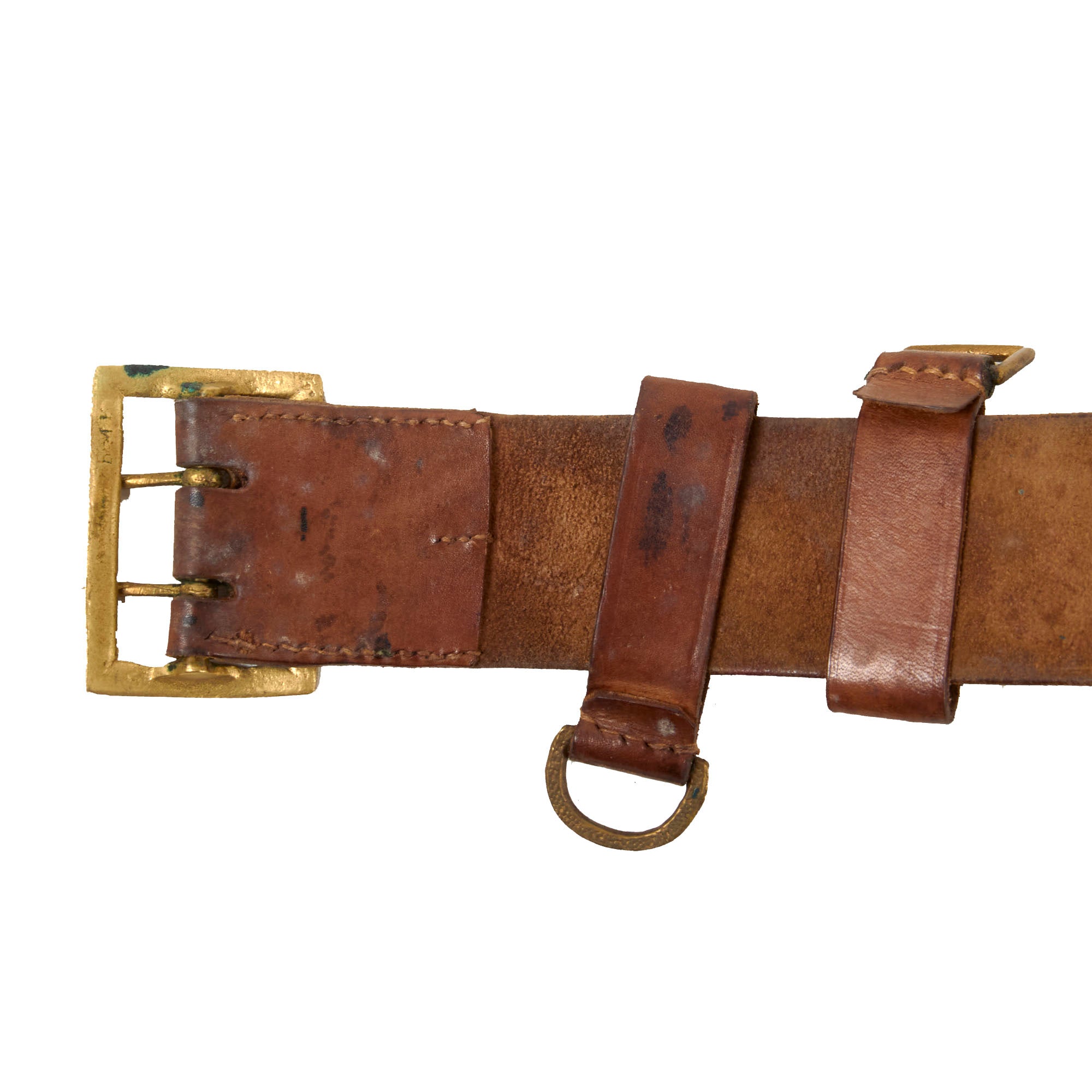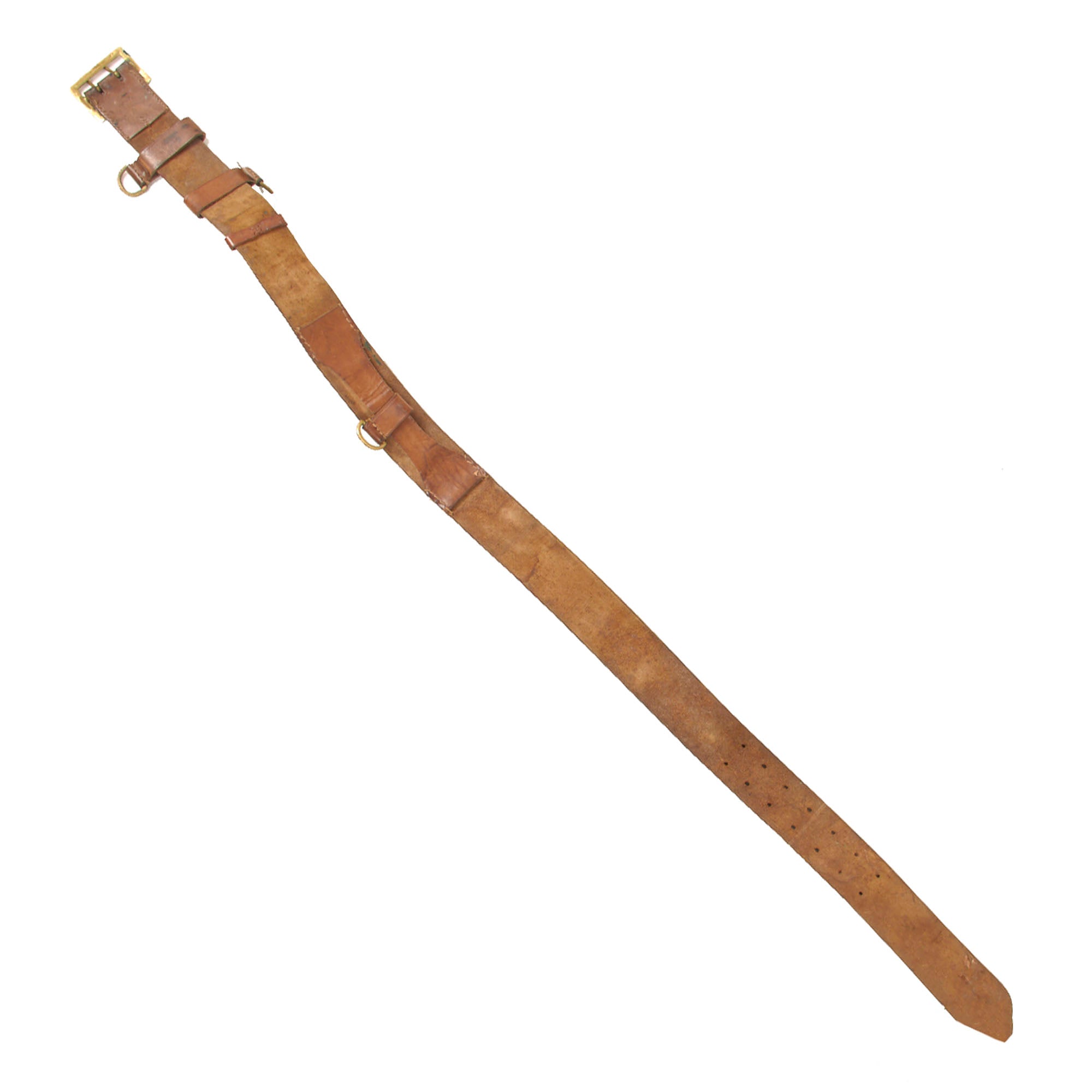The belt is still in lovely condition, with the leather relatively supple, and it looks to have seen light to moderate use during the war. There is some staining, as well as wear and rounding to the edges of the belt. The brass buckle has a lovely mellow patina, and attaches easily to the other end of the belt.