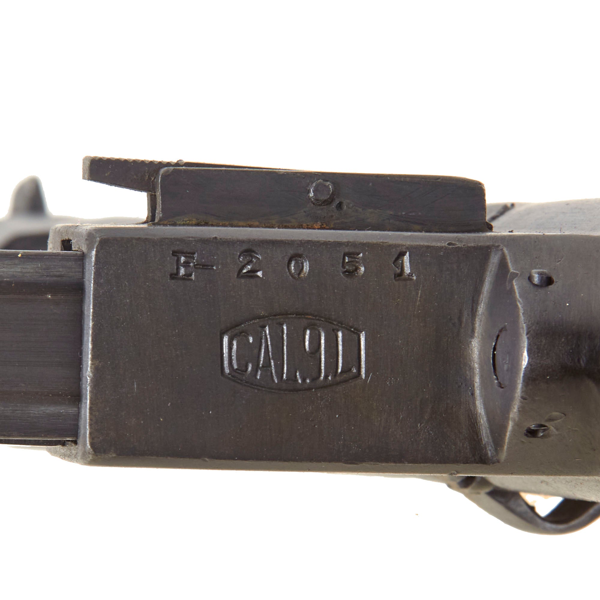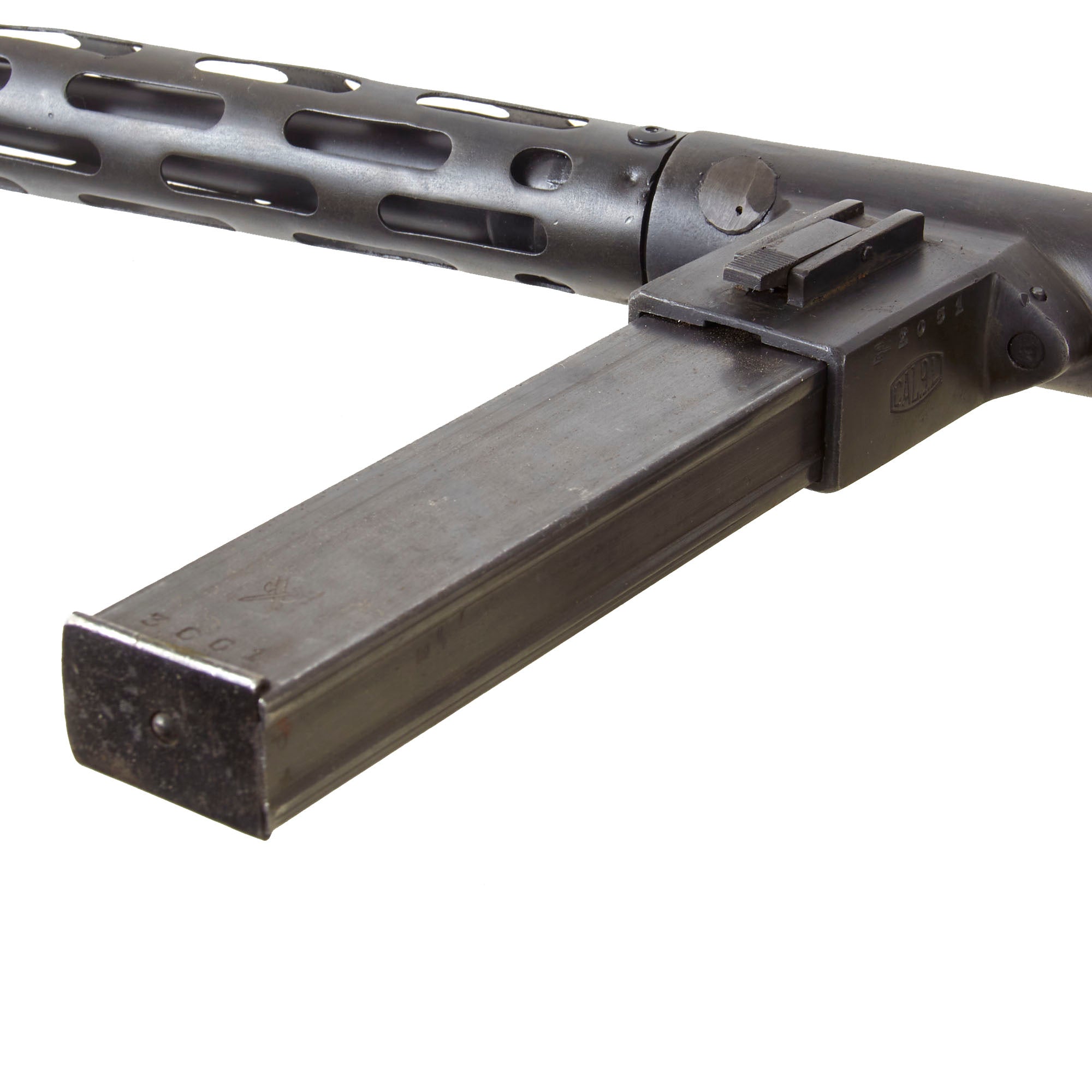 This is a very nice example of the ERMA EMP (Erma Maschinenenpistole) designed and manufactured by Erfurter Maschinenfabrik (Erfurt Machine Factory or ERMA), usually simply called ERMA Werke. The magazine well is marked with serial number E - 2051, over a CAL.9.L. marking, indicating chambering in 9mm Largo, the standard round used for guns supplied to Spain. It comes with an original magazine, marked with 3001 as well as the crossed Sword and Fasces, the insignia of the Spanish Guardia Civil (Civil Guard). The same marking is stamped into the left side of the butt stock. We do not know when these markings were added, but we assume during the Francoist era, when the Civil Guard was utilized extensively.