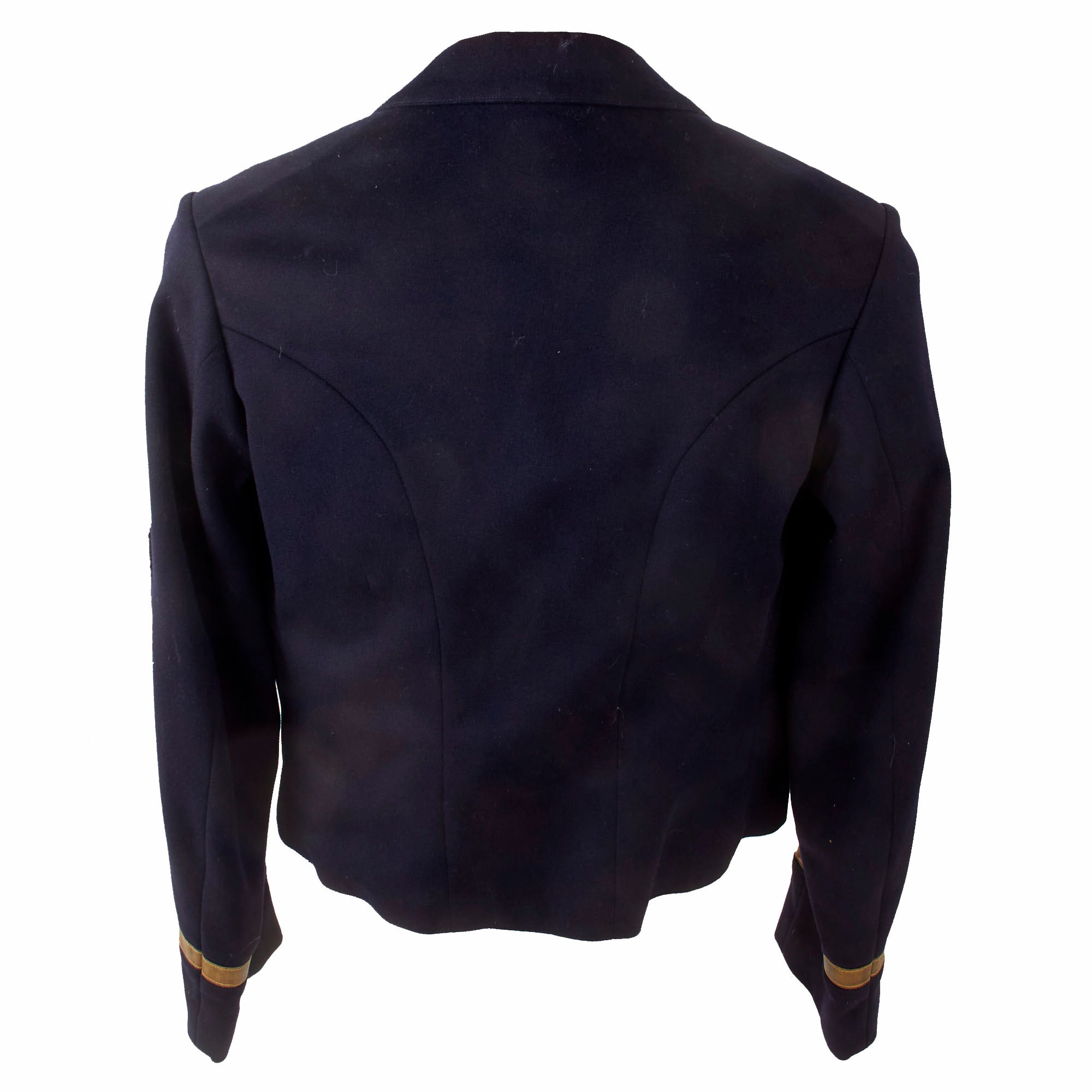 This is a tailor made German WWII Kriegsmarine evening dress jacket for the Maate / Unteroffiziere ohne Portepee (Petty Officer or Junior NCO) rank of Oberbootsmannmaat, or a Boatswain equivalent to a U.S. Navy Petty Officer, second class. This example is of nice quality, navy blue doeskin wool construction, waist length, Bolero/Spencer style, simulated double breasted, parade jacket with opened, upswept, peak lapels and a small lay down collar. The short jacket for evening dress, often called the Affenjacke (Monkey Jacket), is constructed of fine blue wool with gold Kriegsmarine buttons, and a wonderful machine embroidered Kriegsmarine golden yellow celleon thread eagle to the right chest. The left sleeve has a metal Oberbootsmannmaat rating badge over a red embroidered Geschützführer (Flak Gun Captain) Specialist badge, which looks like a winged shell with a chevron underneath. The sleeves have a single row of of gold tresse, correct for NCO ranks. There are also thread loops on the left breast for a medal ribbon bar, which is not included.