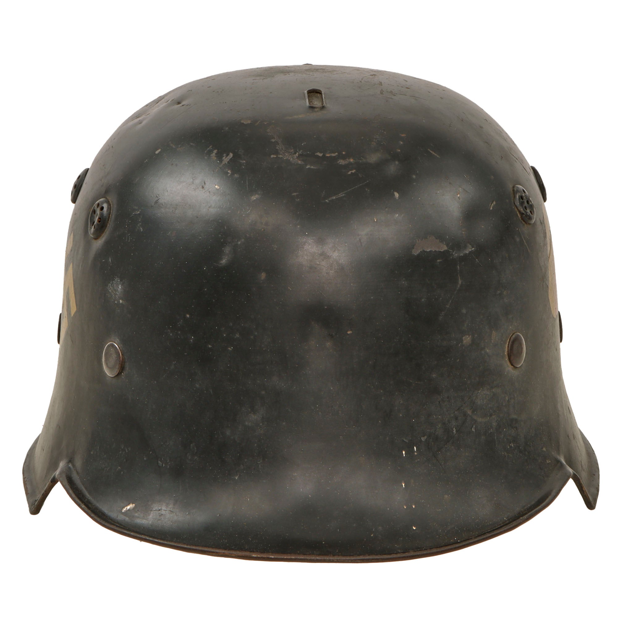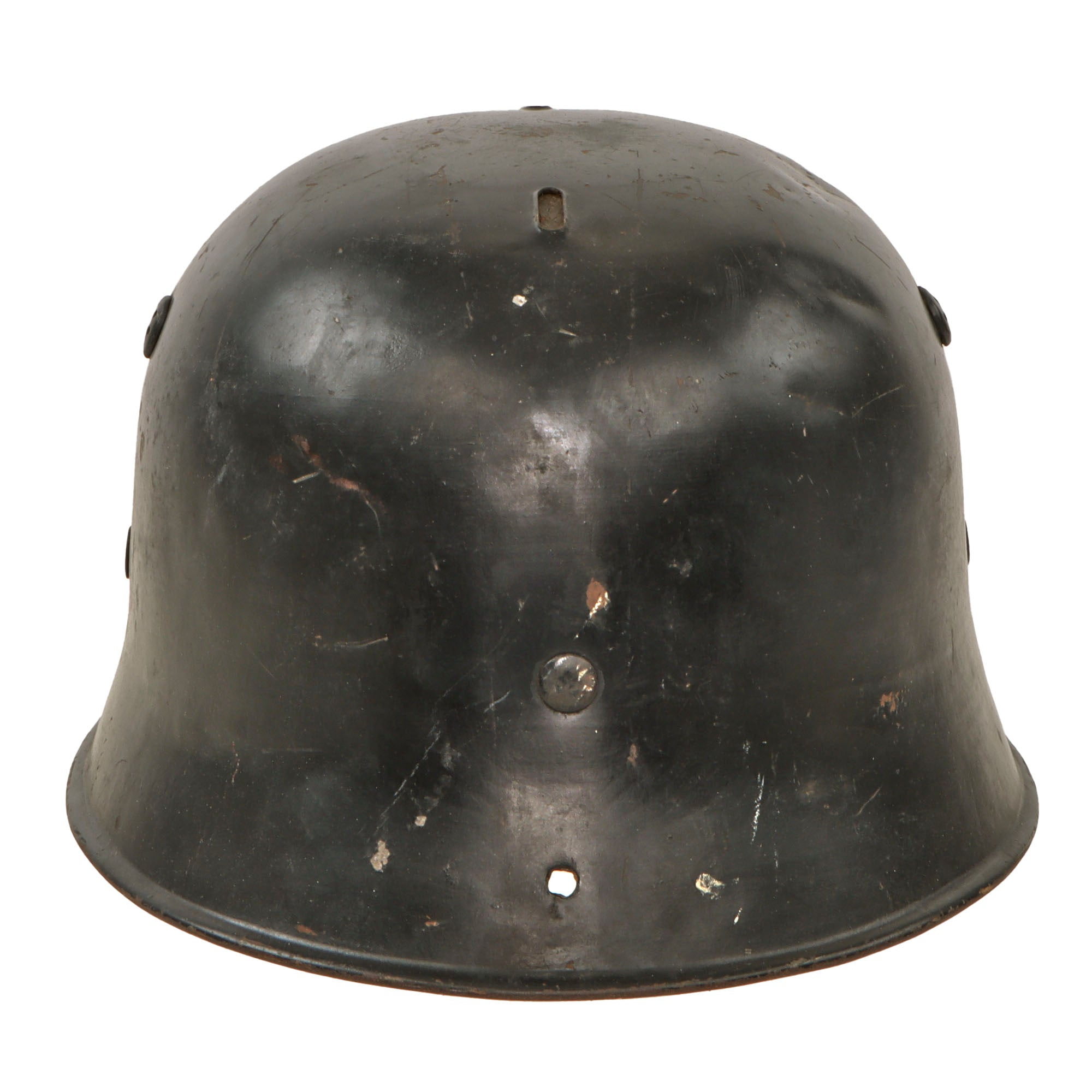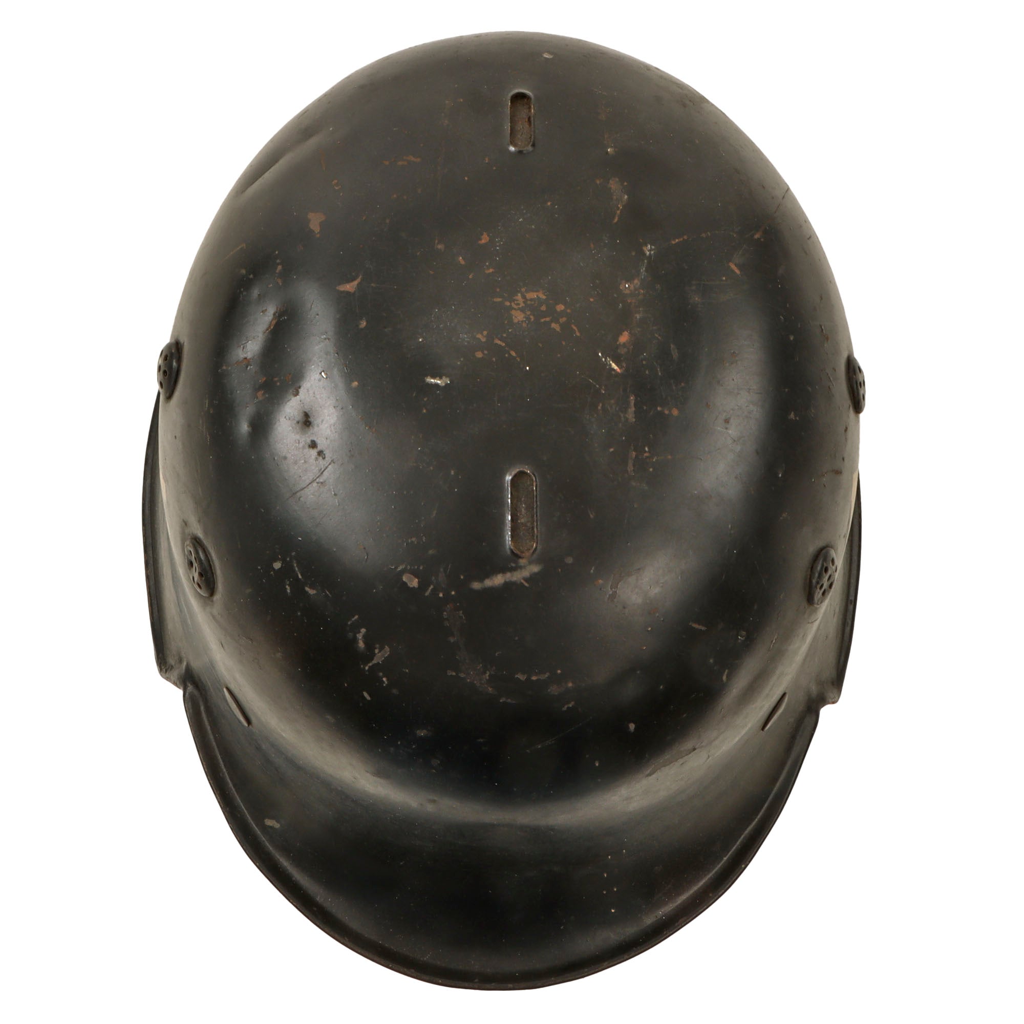 In 1929 a light-weight plastic fiber (Vulkanfiber) helmet was prototyped for general use by all fire-fighting units. The first models were issued in 1932 and proved unworthy of further consideration. As a result a second prototype was explored using light-weight steel alloy known as "Edelstahl." During this time leather fire-fighting helmets were slowly replaced with a combination of surplus World War I model steel helmets and privately manufactured versions in the “Austrian” pattern shell. These early helmets were generally painted black although some were left in their original field-gray World War I color.