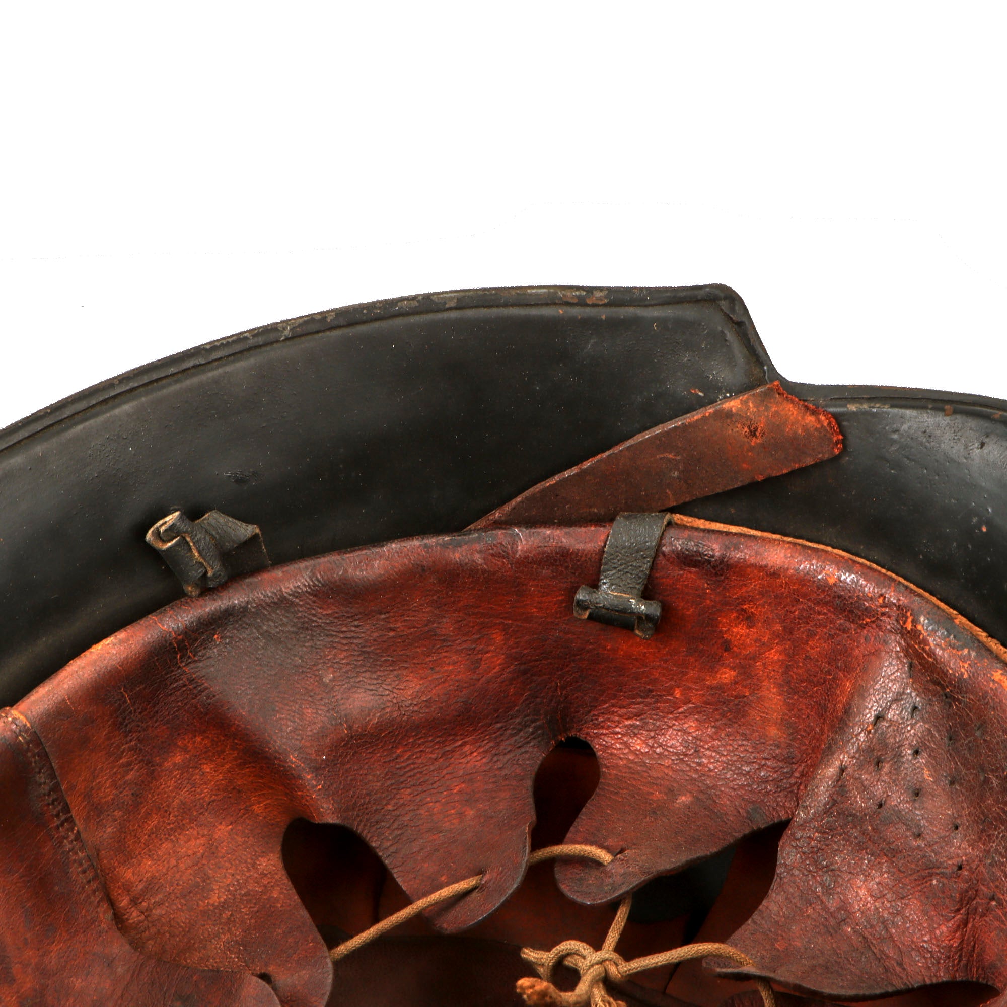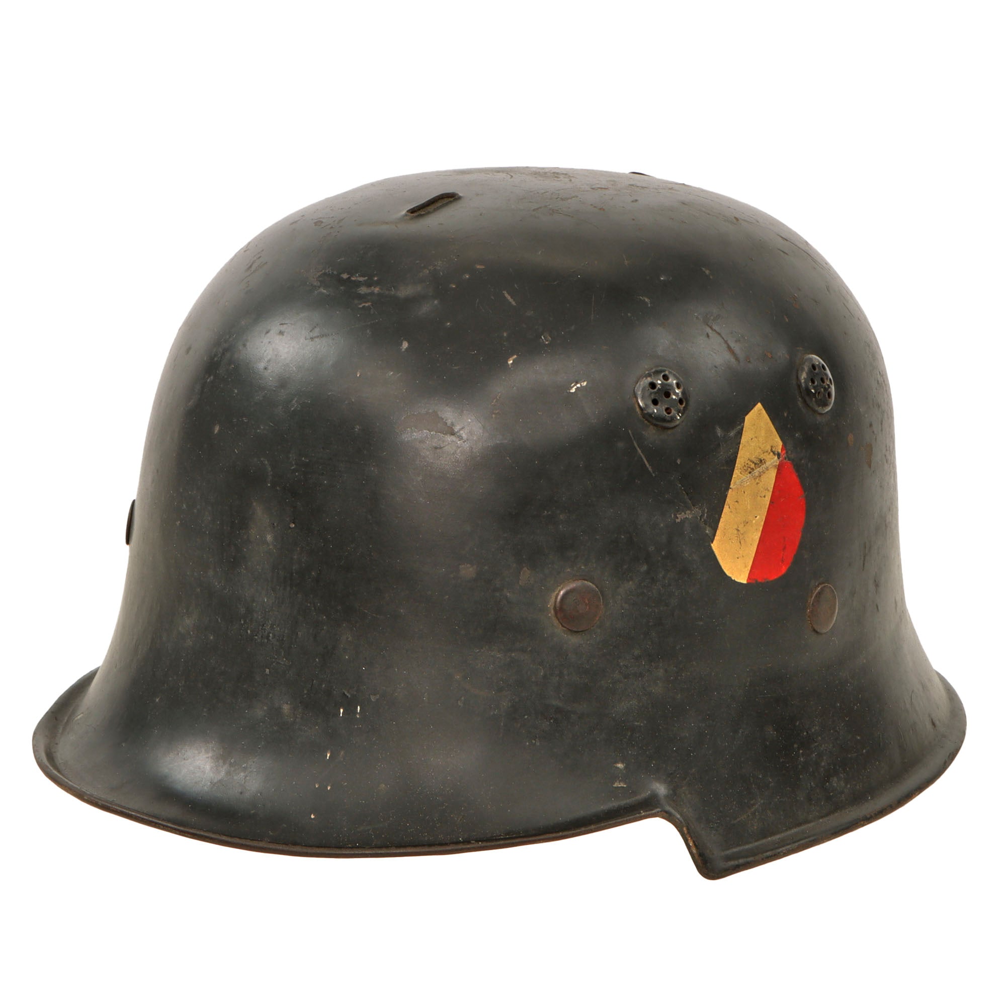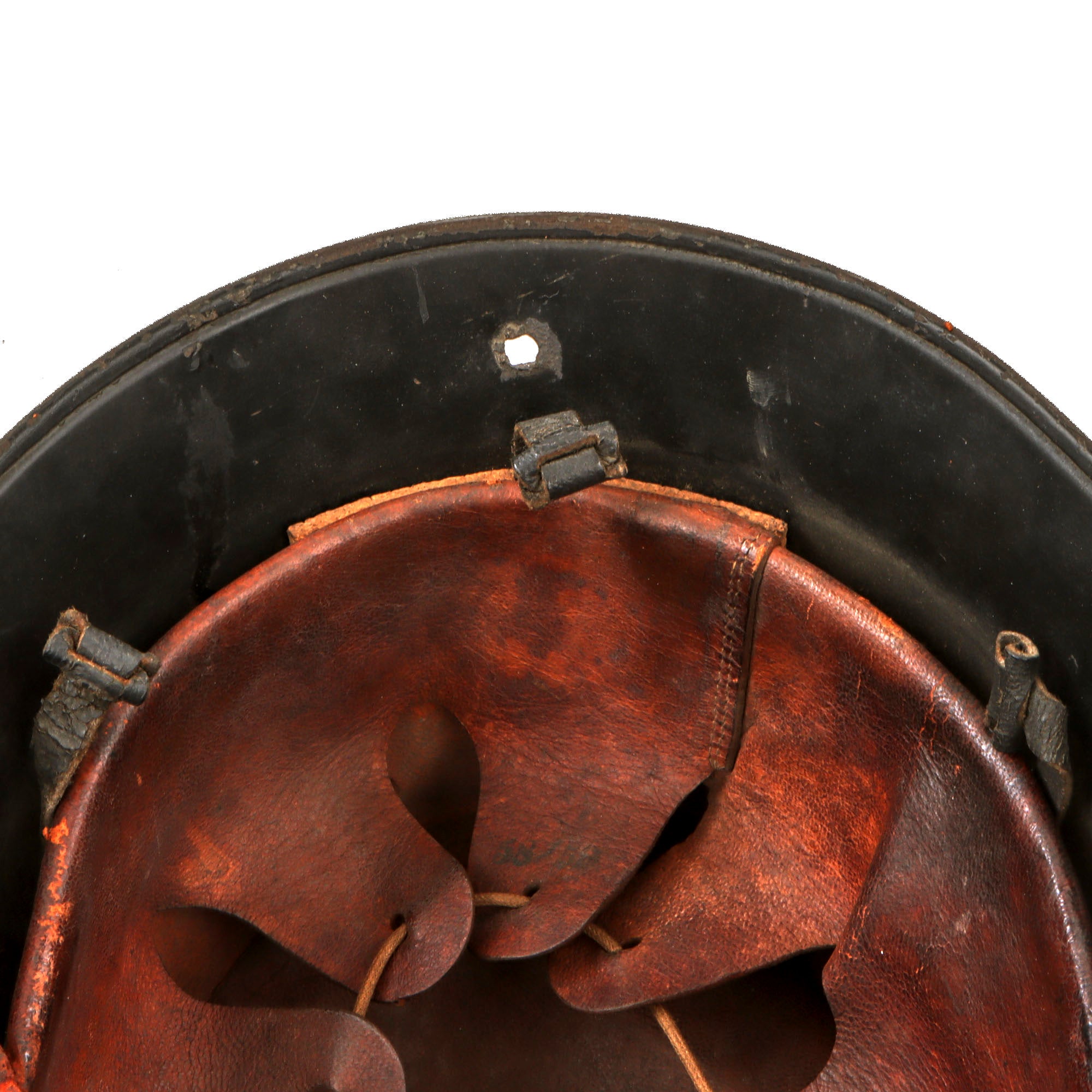 Original Item: Only One Available. This is a very nice genuine steel construction M34 "Square Dip" Third Reich helmet, outfitted for German WWII Fire protection police (Feuerschutzpolizei) issue, as they were issued very early during NSDAP rule in Germany. Features genuine double decals of of a Swas (hook cross) on the right, and a tilted national colors decal on the left. Comes with complete leather liner with all all three hollow rivets still intact, with very good exterior paint.