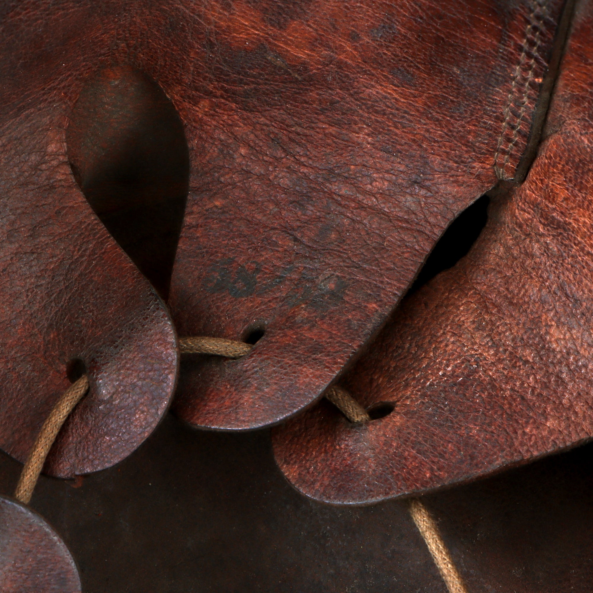 The civic issue leather liner is in very good condition, and still has all 8 fingers, along with the top tie string. It has perforations on the forehead area of the leather, which is attached over a felt padded fiber band. There are also the usual flat cork "spacers" around the three attachment points, which are still intact, and the liner still retains the five leather "tabs" that would allow attachment of the rear skirt. The chinstrap is only partly present, having torn off on both sides just below the level of the liner.