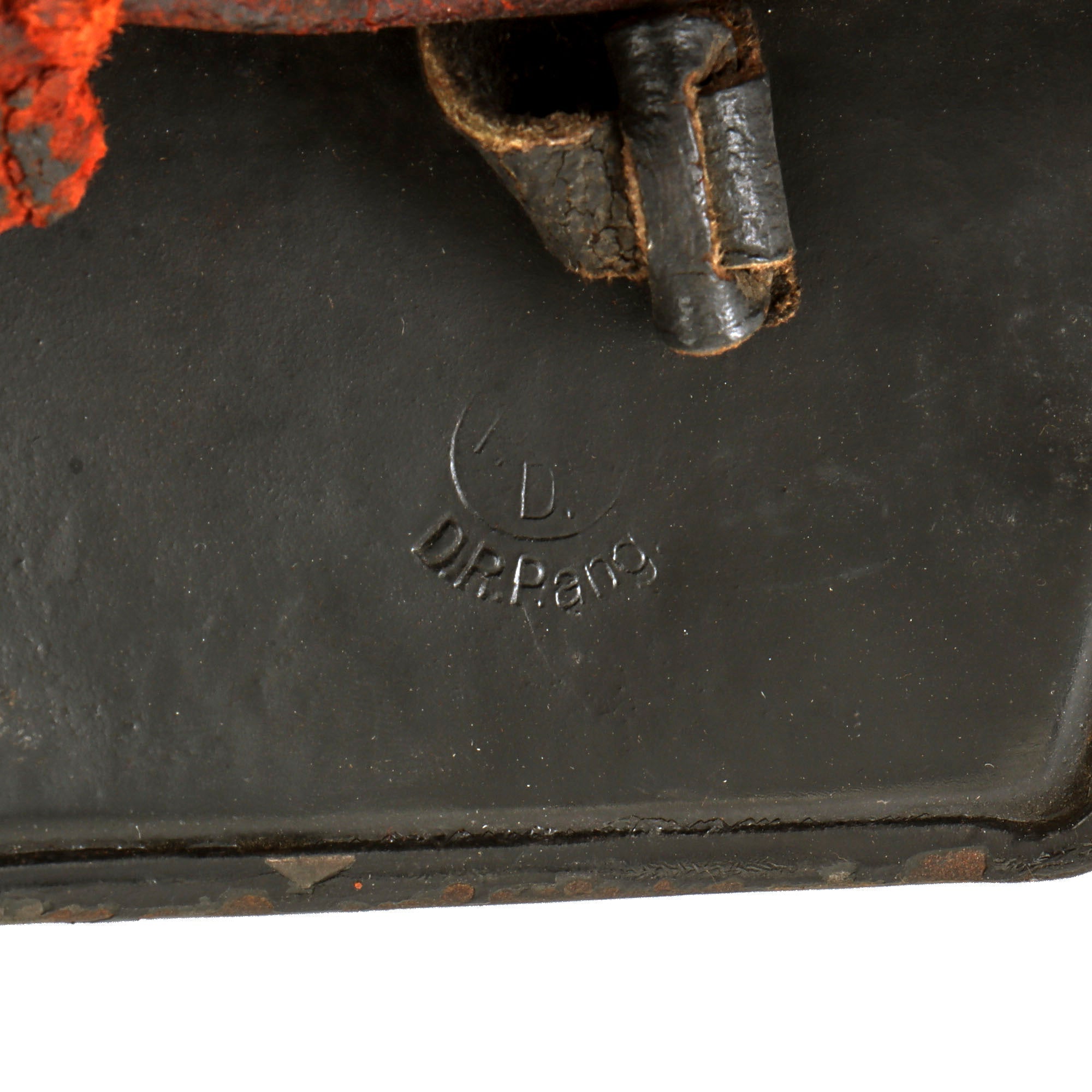 The exterior of this German helmet retains about 90% of the original paint, showing small dents, chips, and scratches consistent with service. The Swas decal is retained at about 95% complete, and the National Colors is about 90% complete, with a bit of scuffing. Both have a nice matured yellow tinge to the enamel top layer, giving them a great worn look. Over the right ear is a partial maker logo over D.R.P.ang., a known marking on early M34 Civic Square Dip helmets, which we unfortunately have not been able to identify. The helmet has the holes on the top for attachment of an aluminum comb, and we can see from marks in the paint that it did at one time have one, but was later removed. There are also some dents on the upper right side.