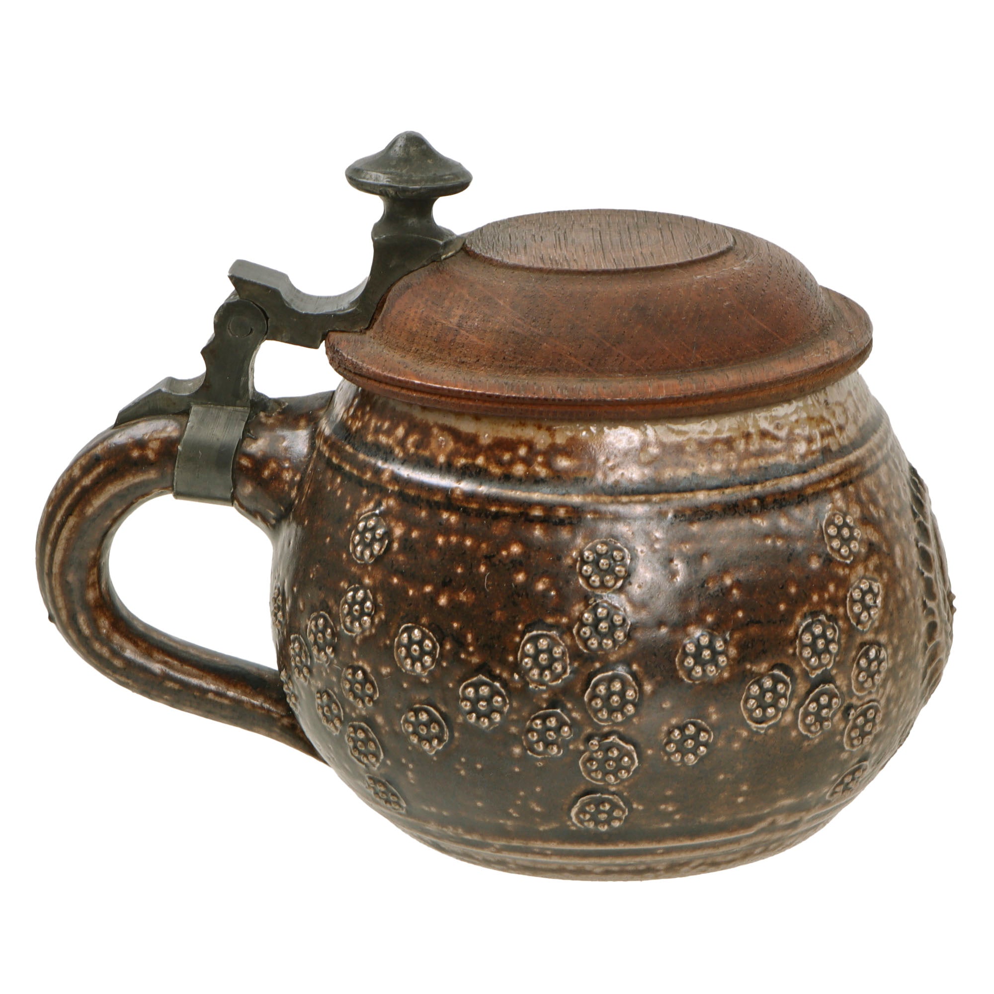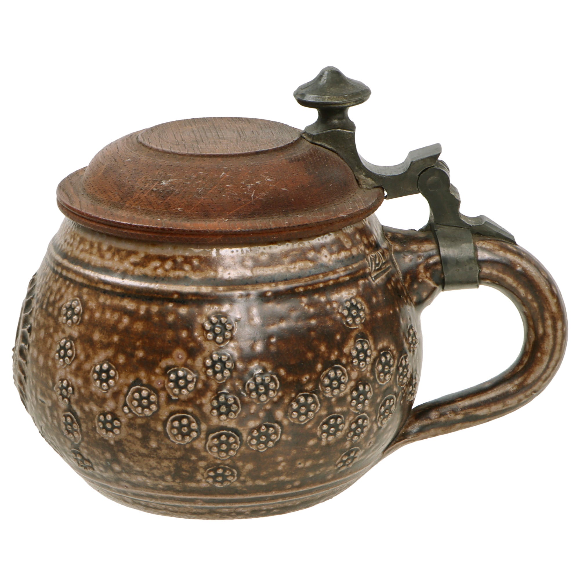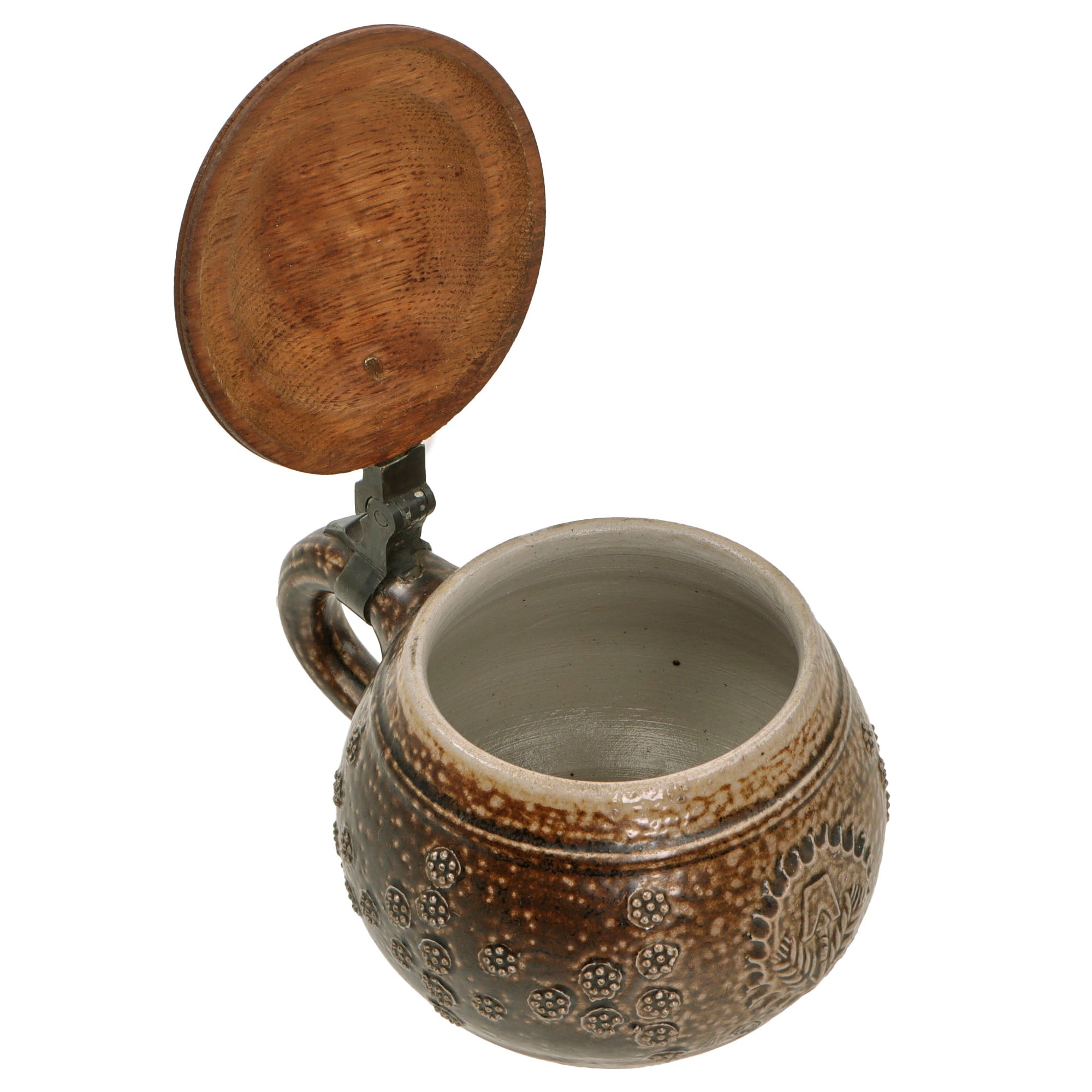 The lid of this example is wood, the first wooden-lidded stein we’ve seen. The side of the stein is stamped 1/2L for half of a liter, the standard capacity for these. The stein measures roughly 5” tall with a 3 ¼” base diameter.