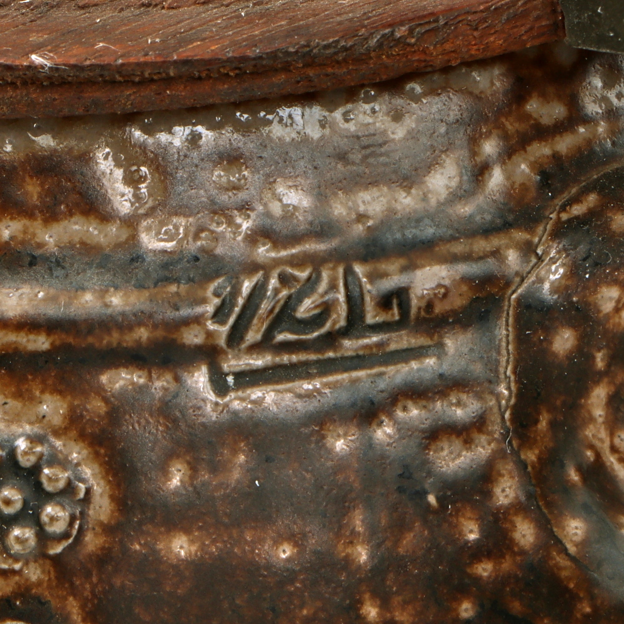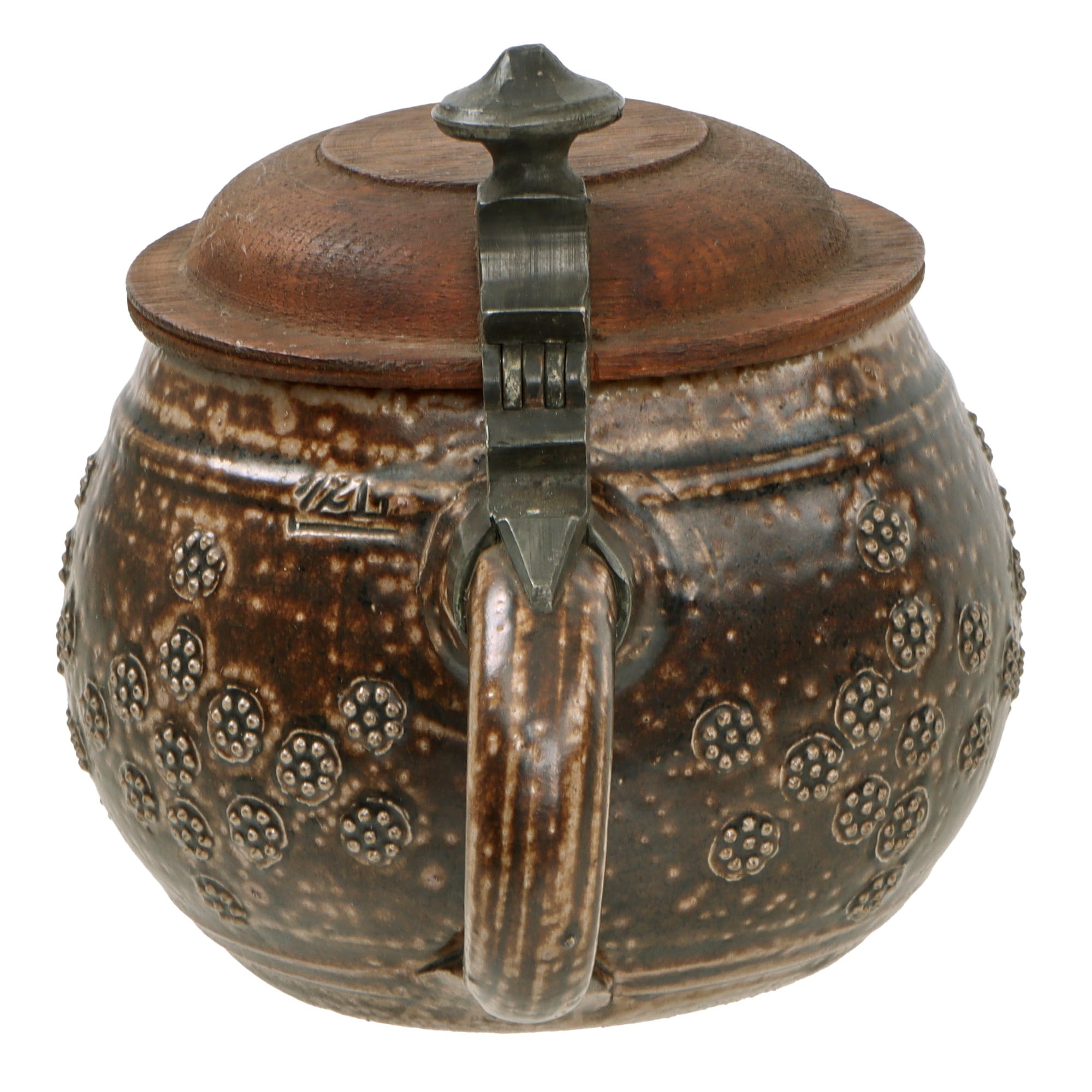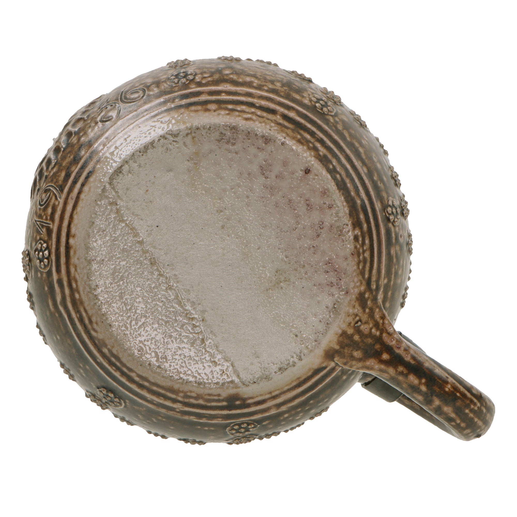 The lid of this example is wood, the first wooden-lidded stein we’ve seen. The side of the stein is stamped 1/2L for half of a liter, the standard capacity for these. The stein measures roughly 5” tall with a 3 ¼” base diameter.