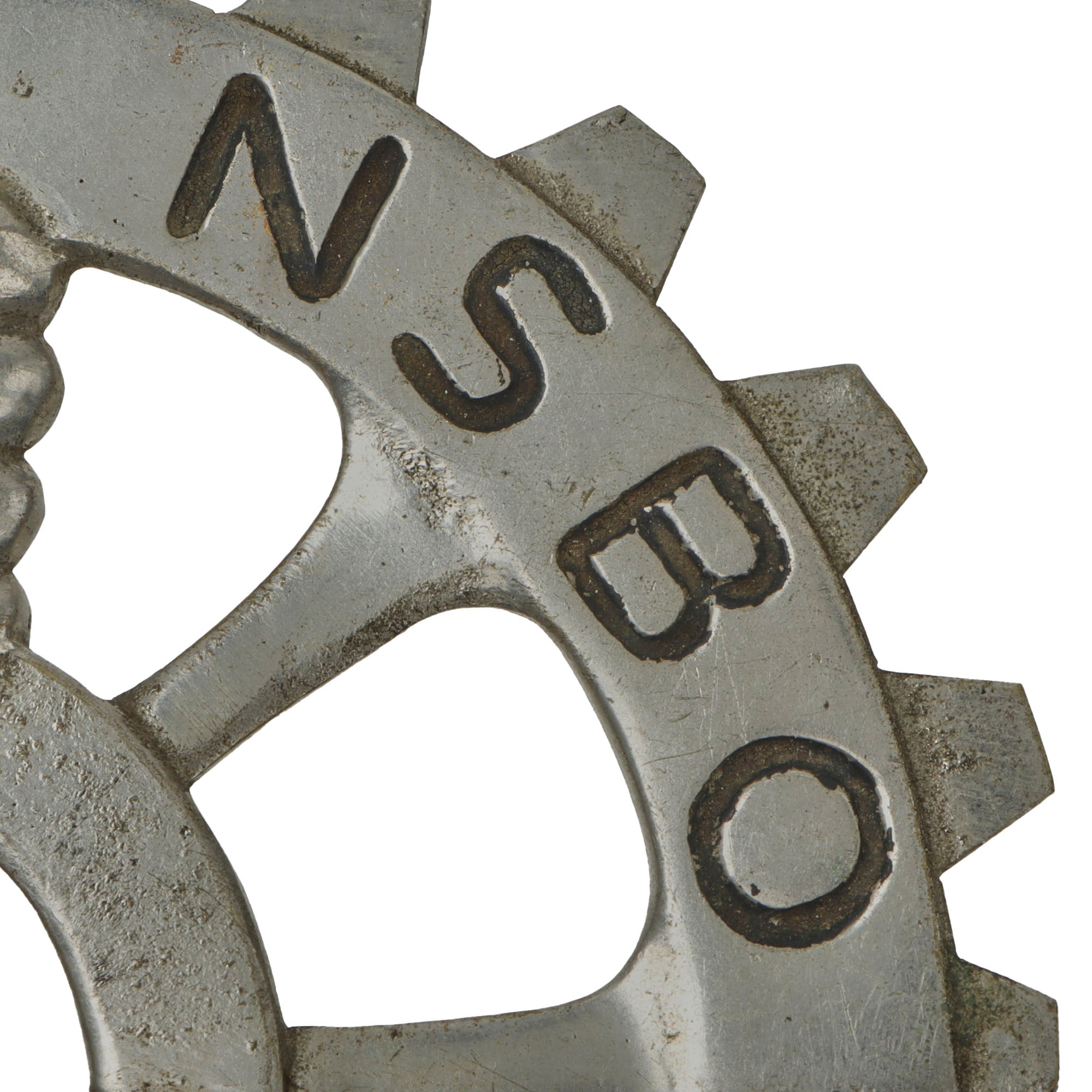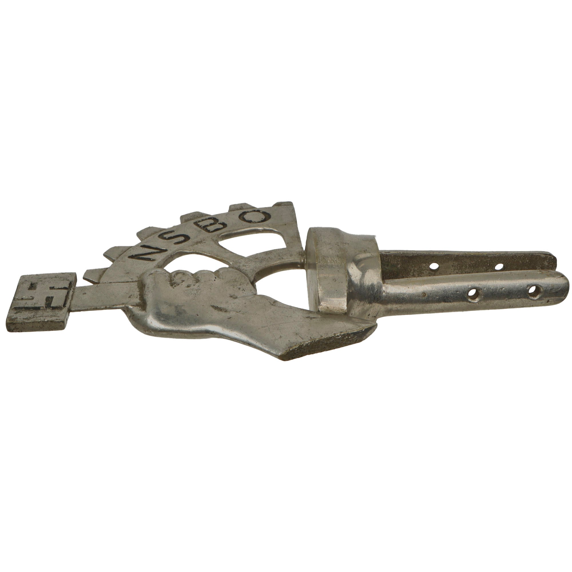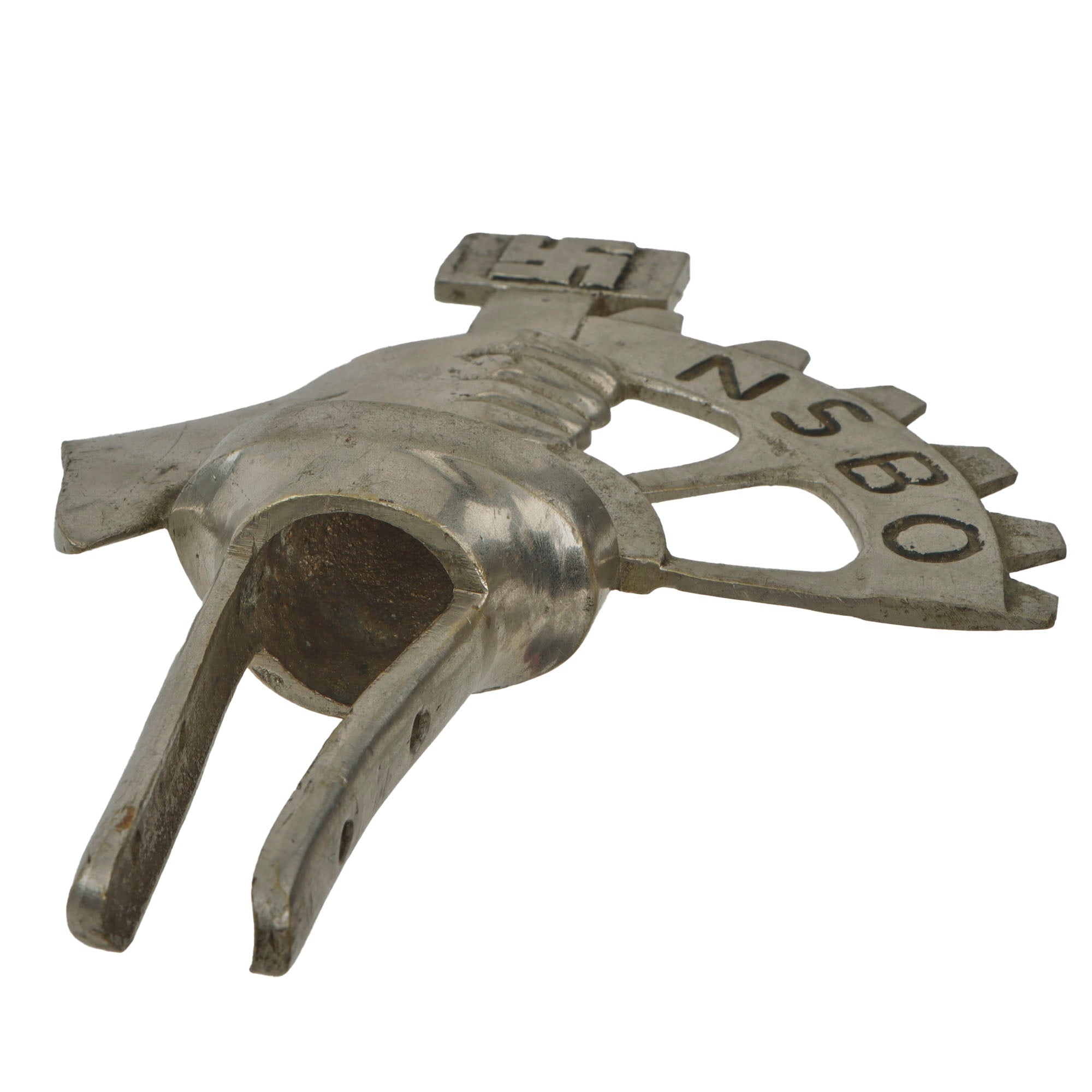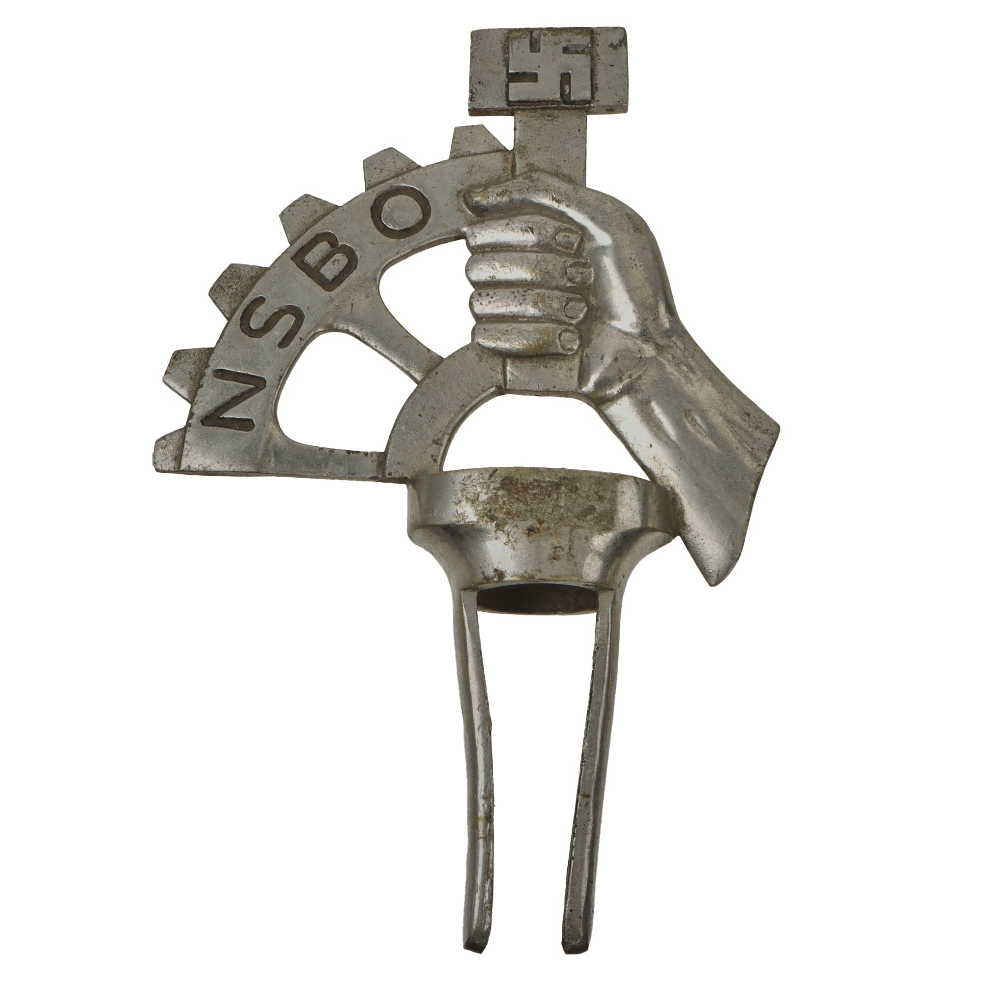 • Original Item: Only One Available. This is a very nice WWII German National Socialist Factory Cell Organization (Nationalsozialistische Betriebszellenorganisation - NSBO) nickel plated brass Flag Pole Finial or Topper (Fahnenstange Endstück). The NSBO logo is a hand holding a rectangular headed hammer, which has a Swas (hook cross) in the middle. This is joined to a large gear or wheel with NSBO marked on it. The letters as well as the hammer head are highlighted with black paint, which is worn.. There are no markings on the finial indicating the manufacturer.
