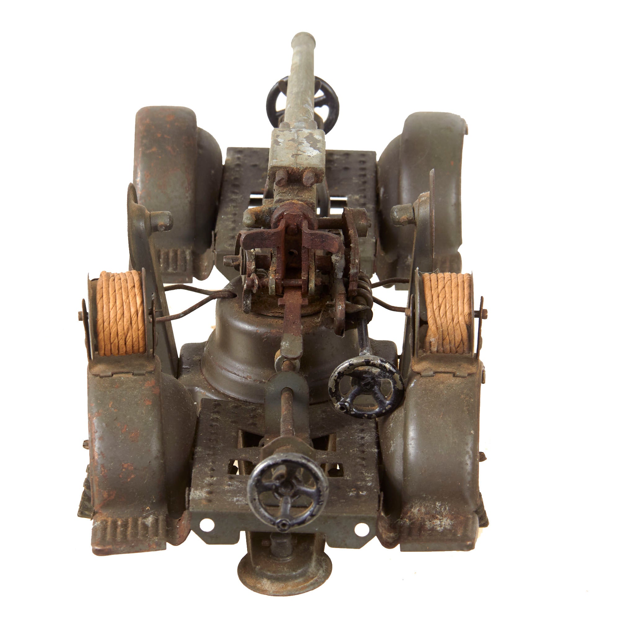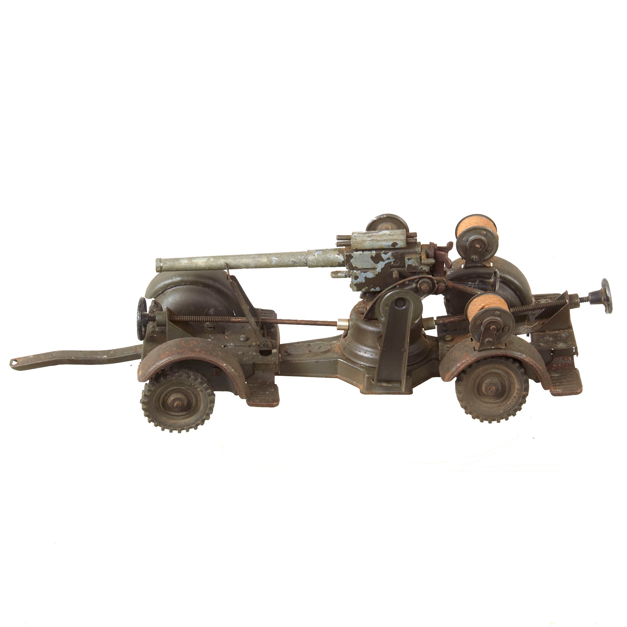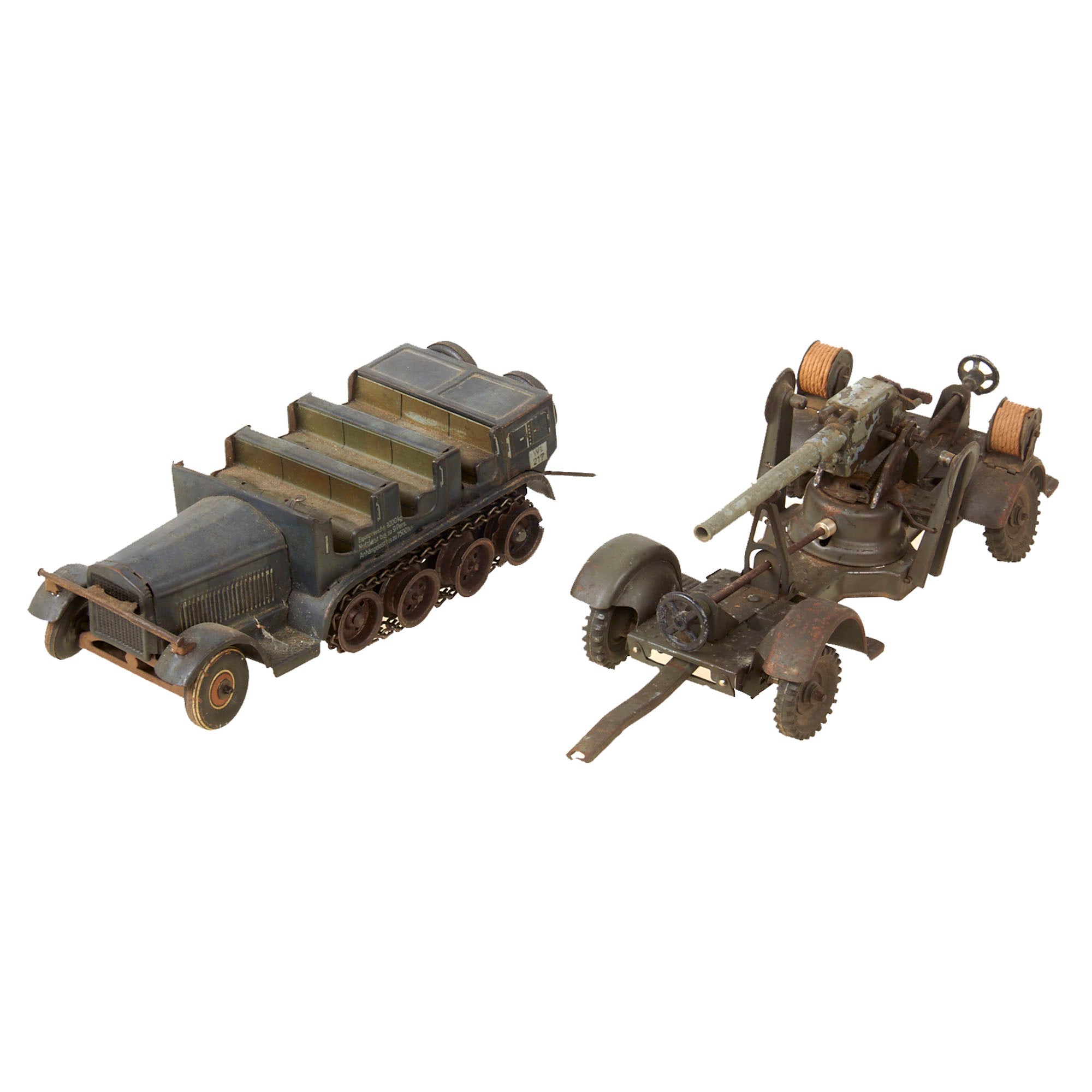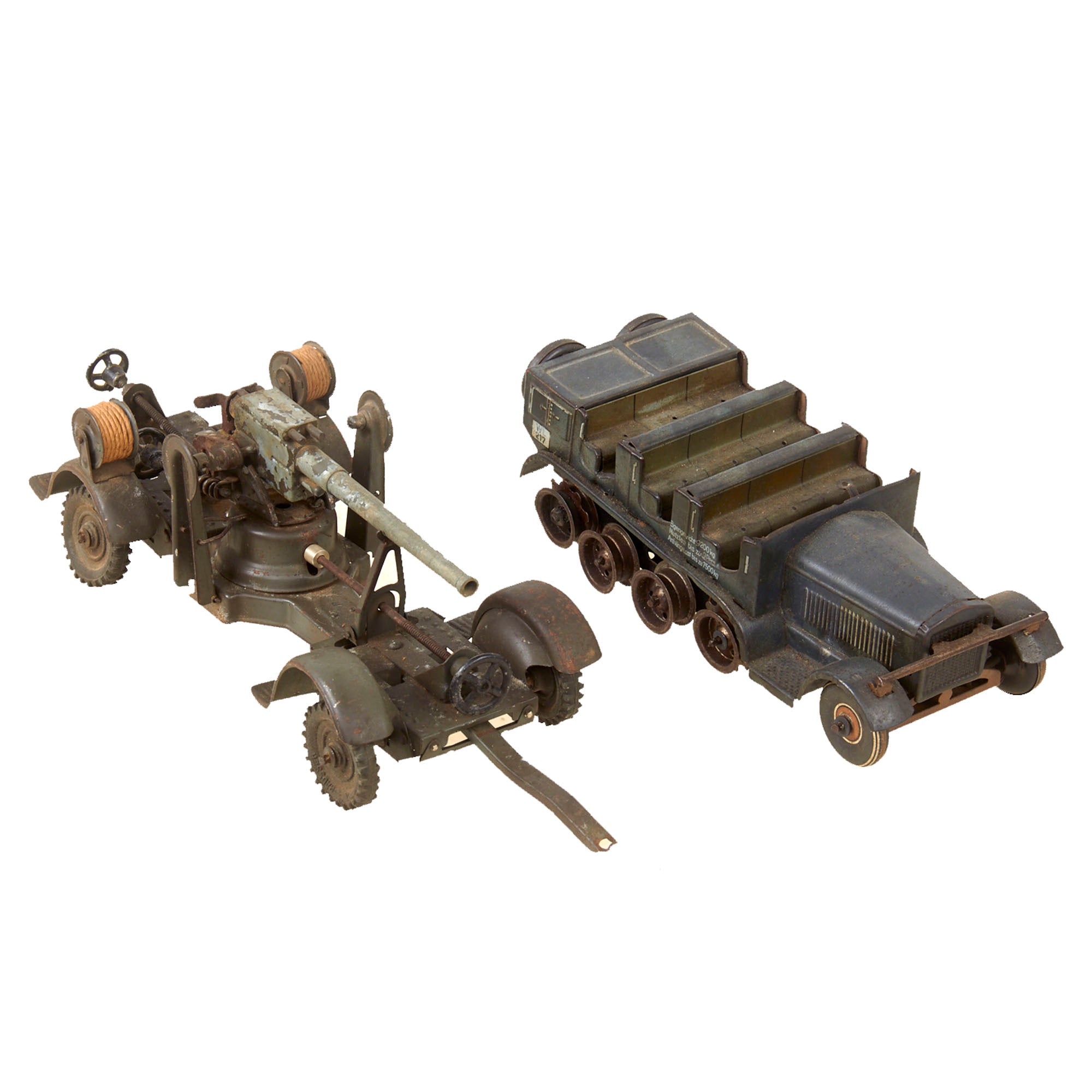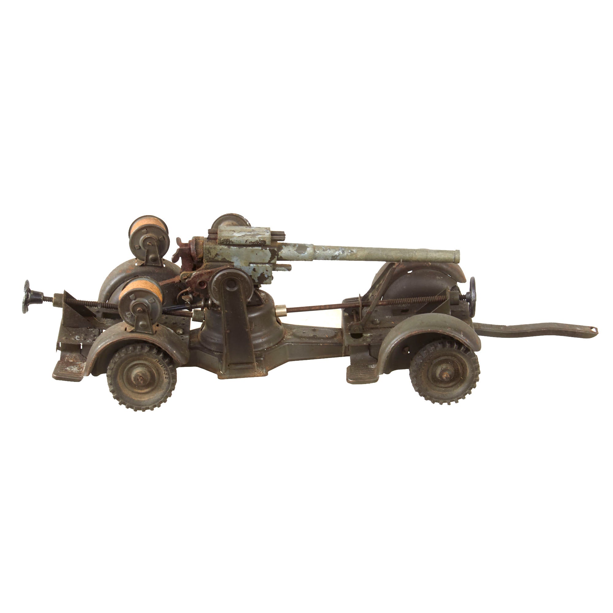 Original Item: Only One Available. This is a lovely German toy Wehrmacht Sd.Kfz. 11 Prime Mover with a towed Flak 88 gun from the WWII period, made by O&M Haußer from tinplate steel. They made a whole variety of these well made trucks. The car with the flak gun attached measures 20 3/4" x 7 3/4" x 7" with the gun barrel extended upwards, and features 14 wheels, with a Flak 88 gun mounted to the towed vehicle.