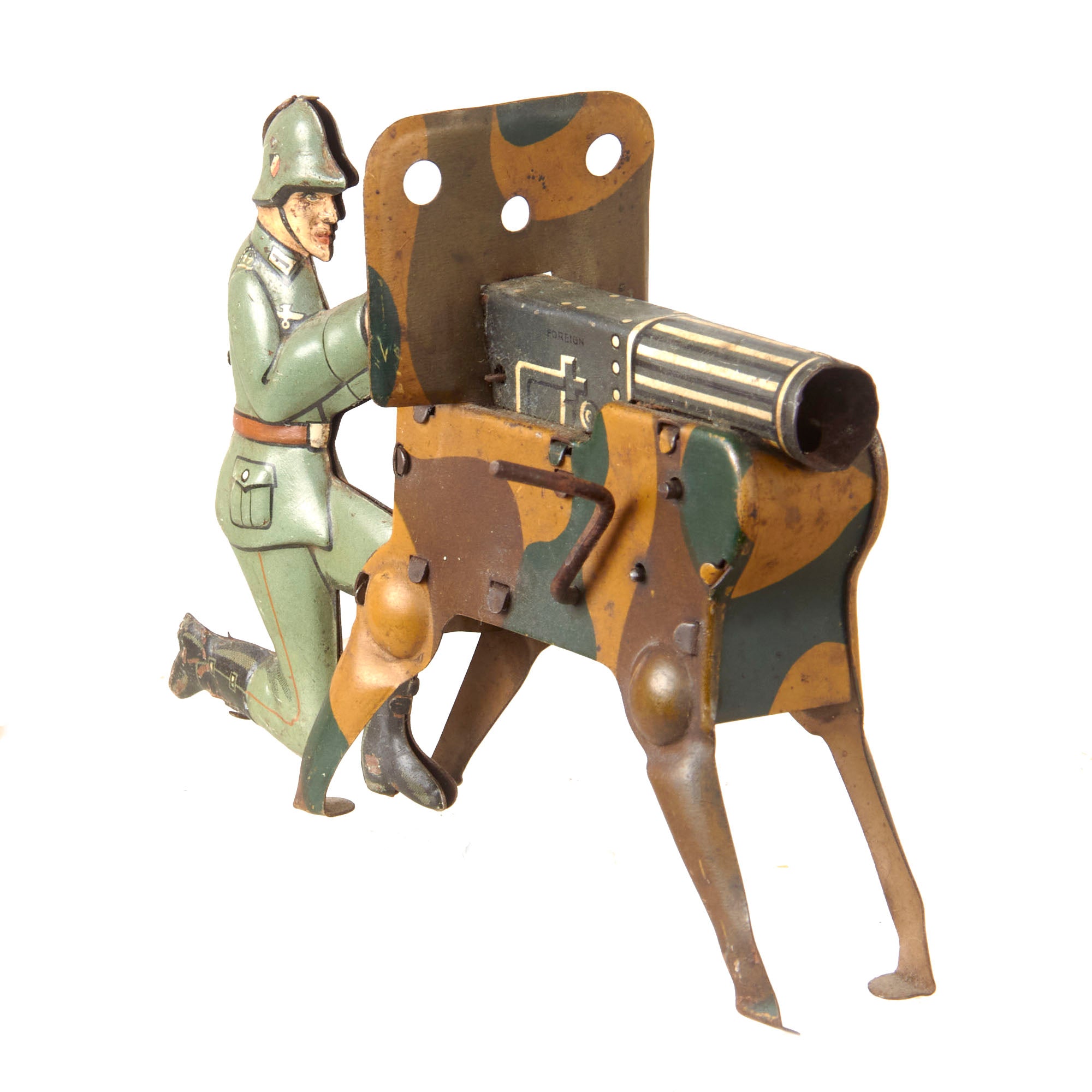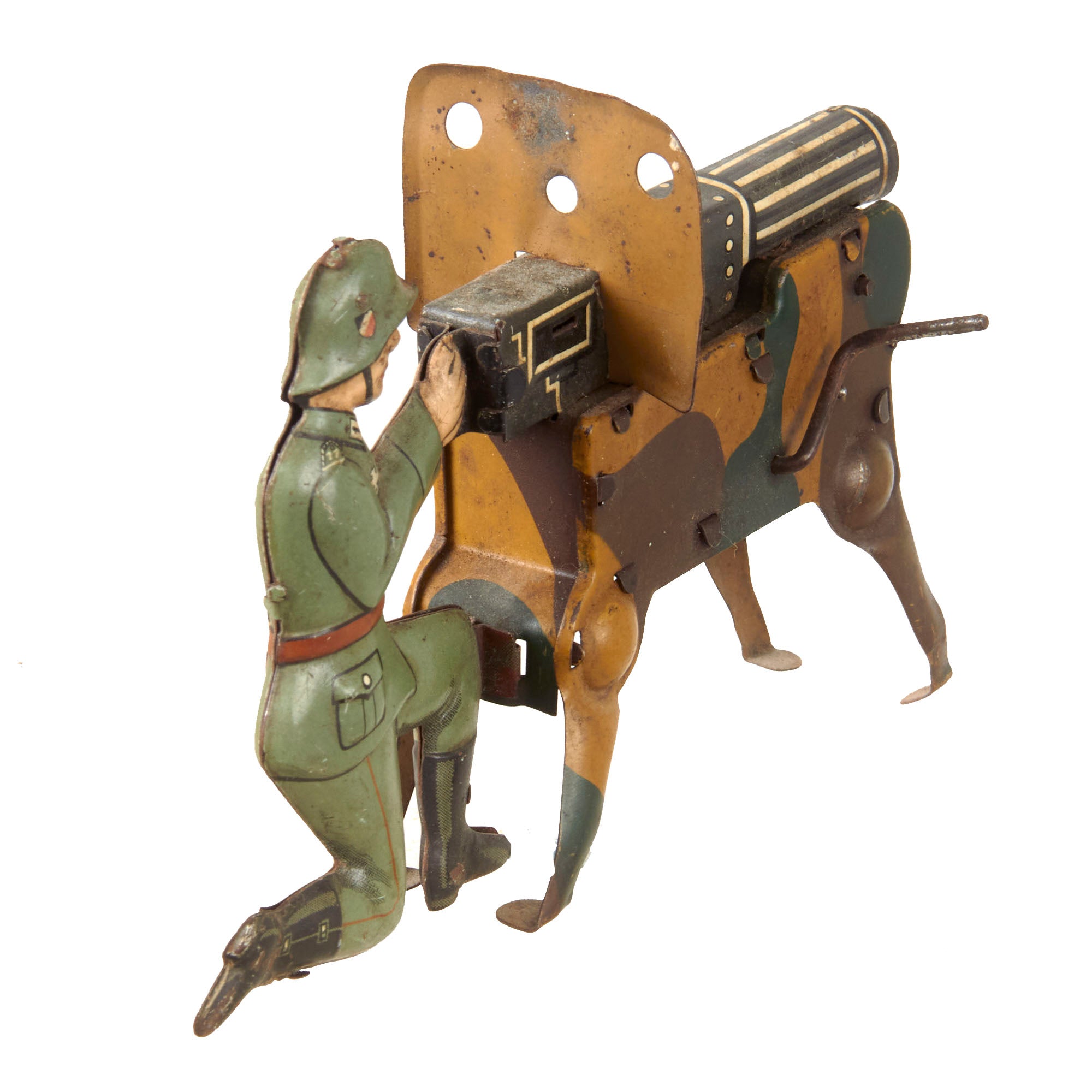 - Tin soldier mounting Machine gun with crank handle that makes noise, the MG is missing the front piece but it still makes noise. 5 ¼ x 1 ½ x 3 ½”.
