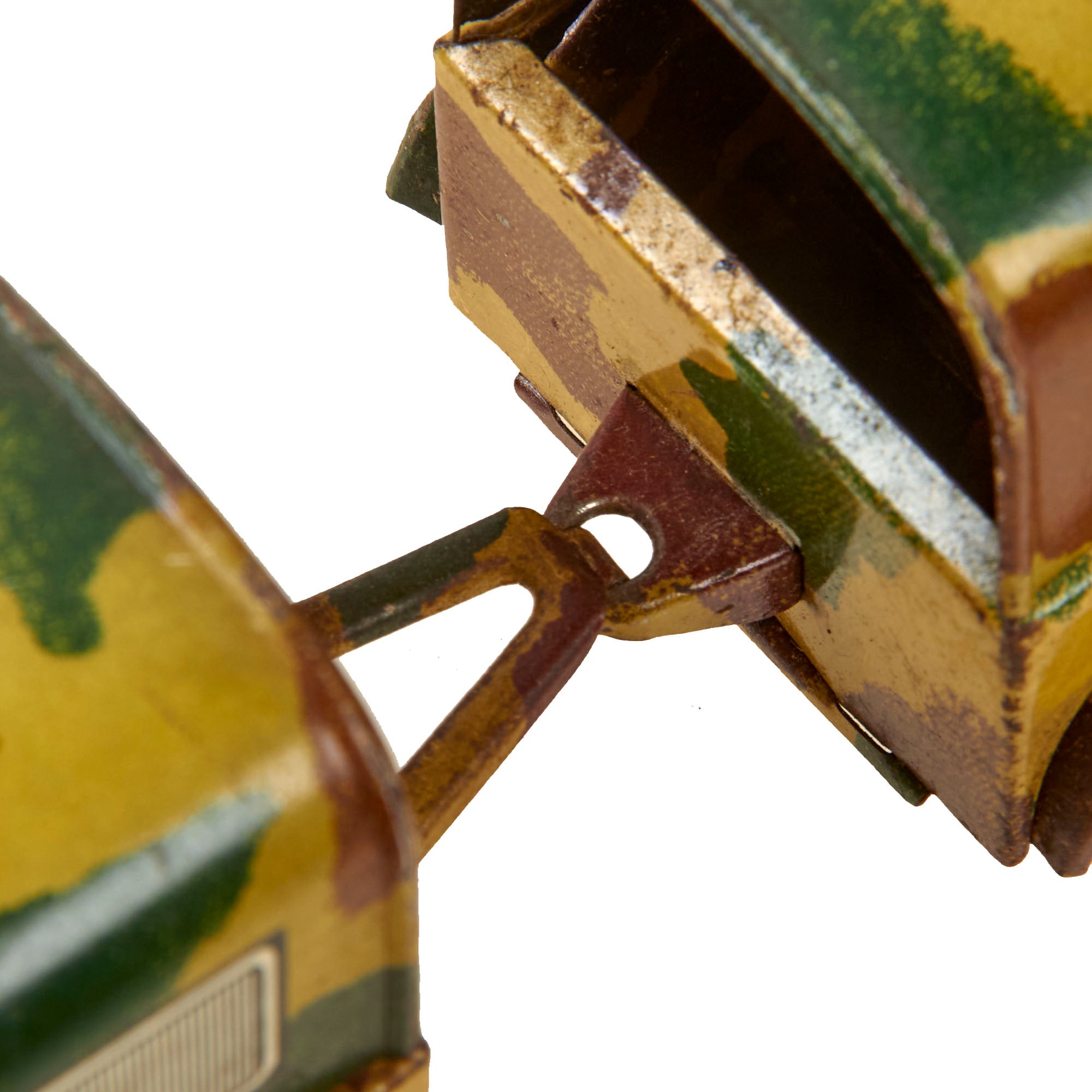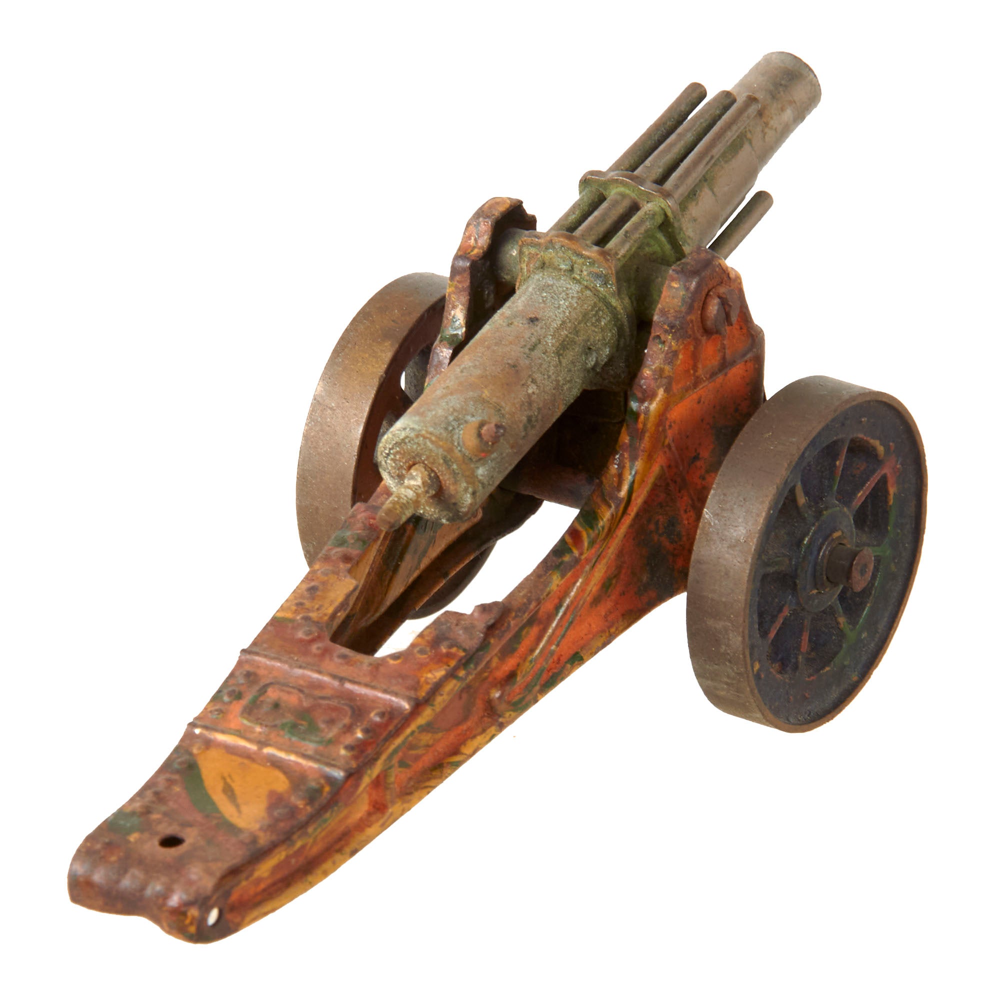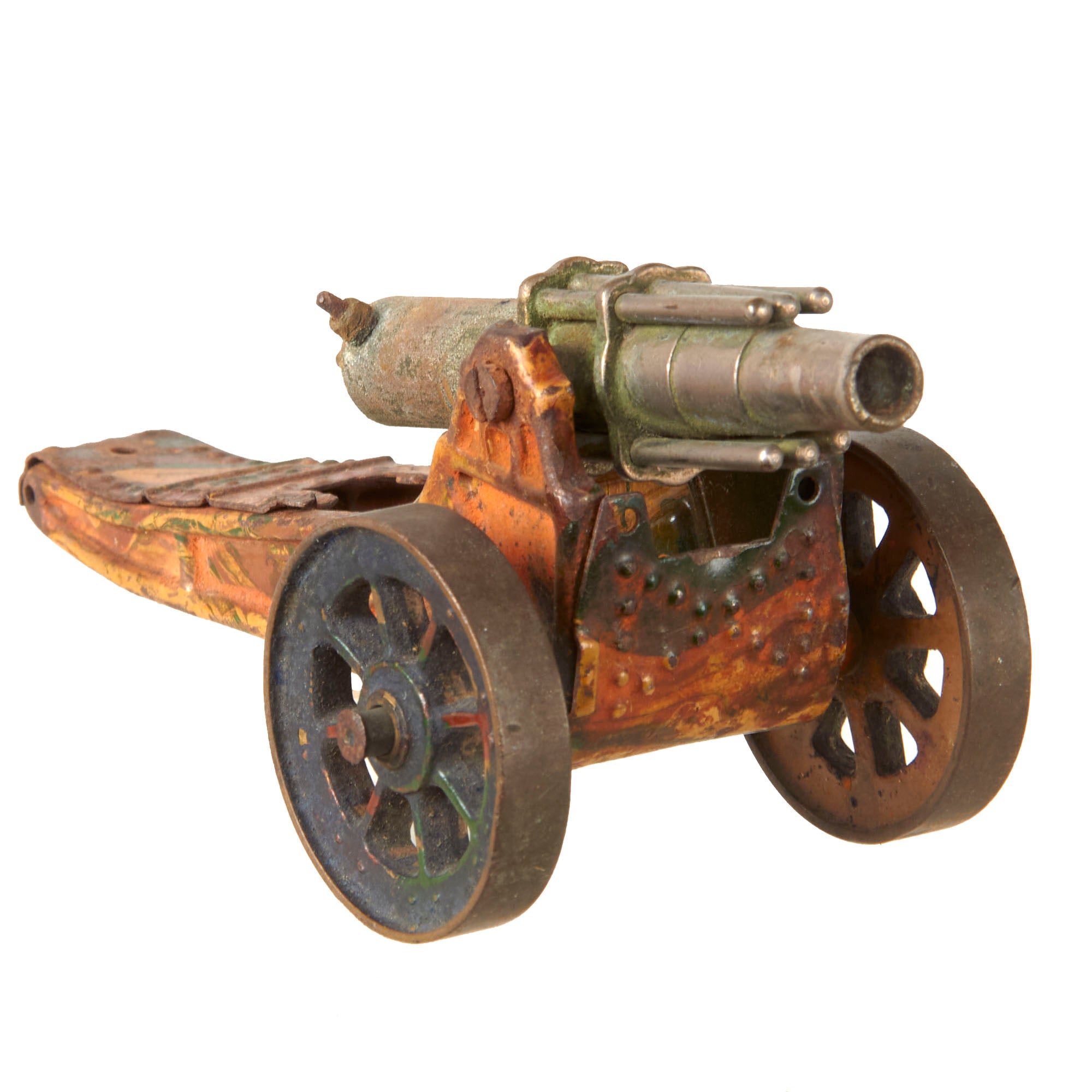 - Artillery piece on camouflage mount, heavy wear. 4 ¾ x 2 ¼ x 3”.
