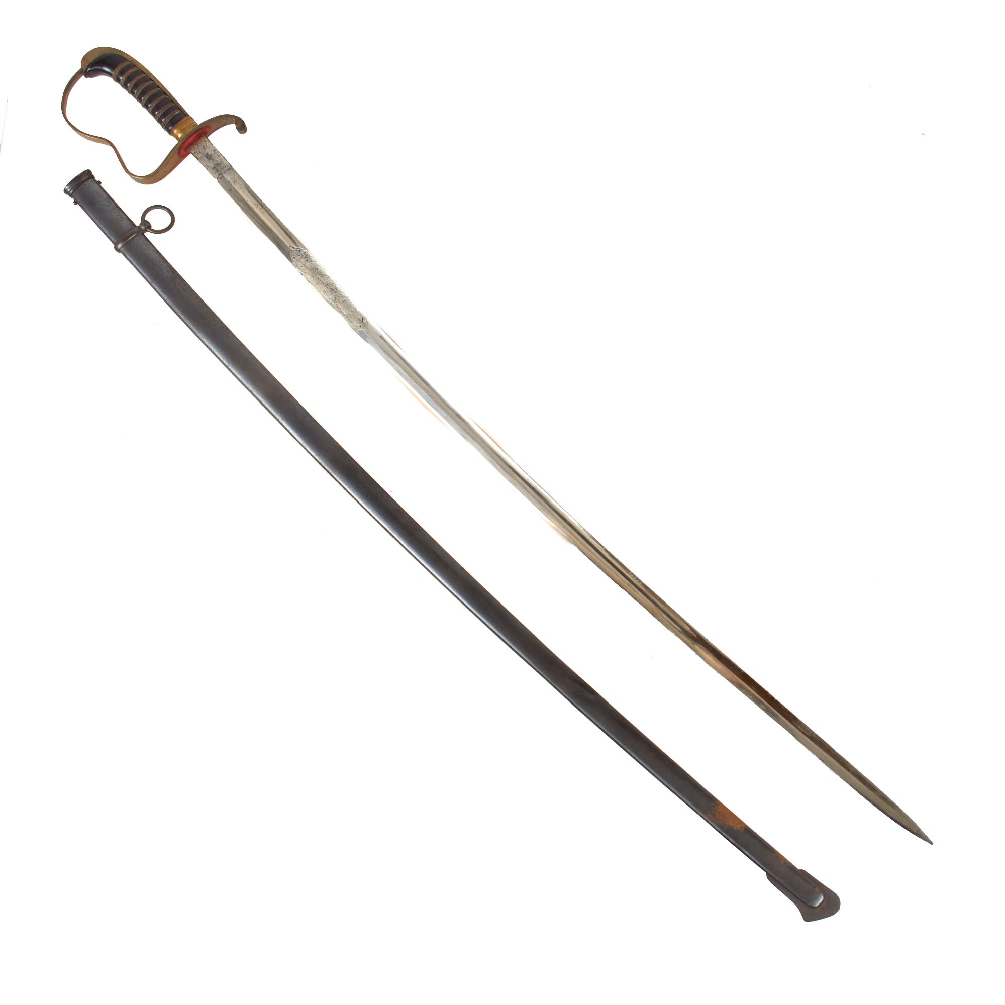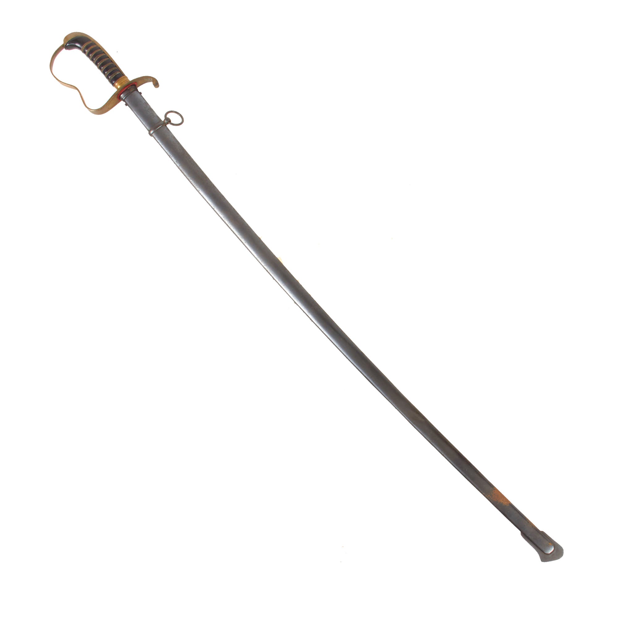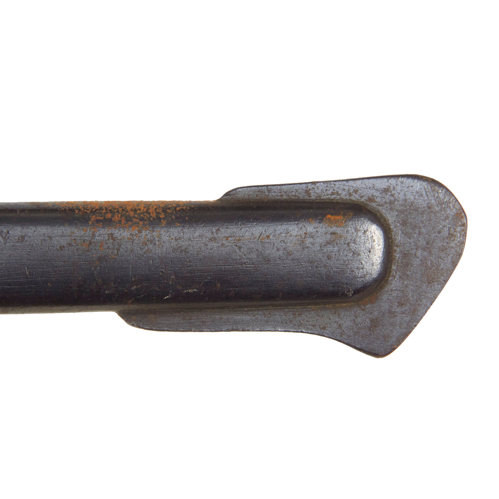 The steel scabbard has a single hanging ring, as the second fitting was for a hook on the hanger. It has the standard black enamel finish, which has worn off in some areas, and the underlying steel has oxidized, but thankfully this is only noticeable near the drag. The scabbard is still straight with very minor denting in spots.