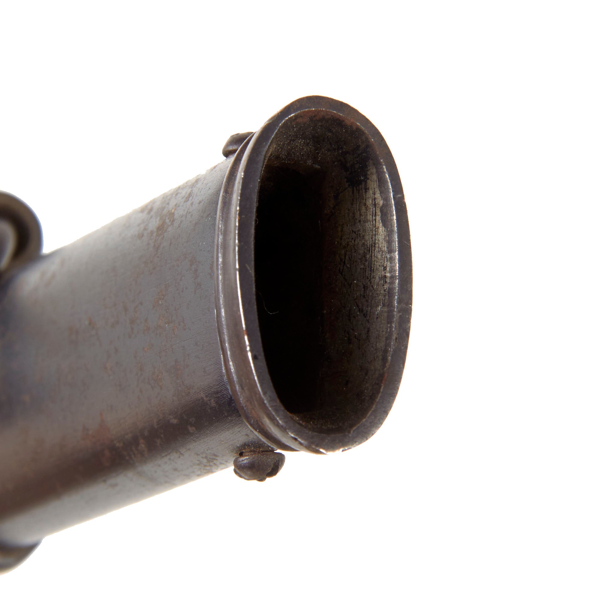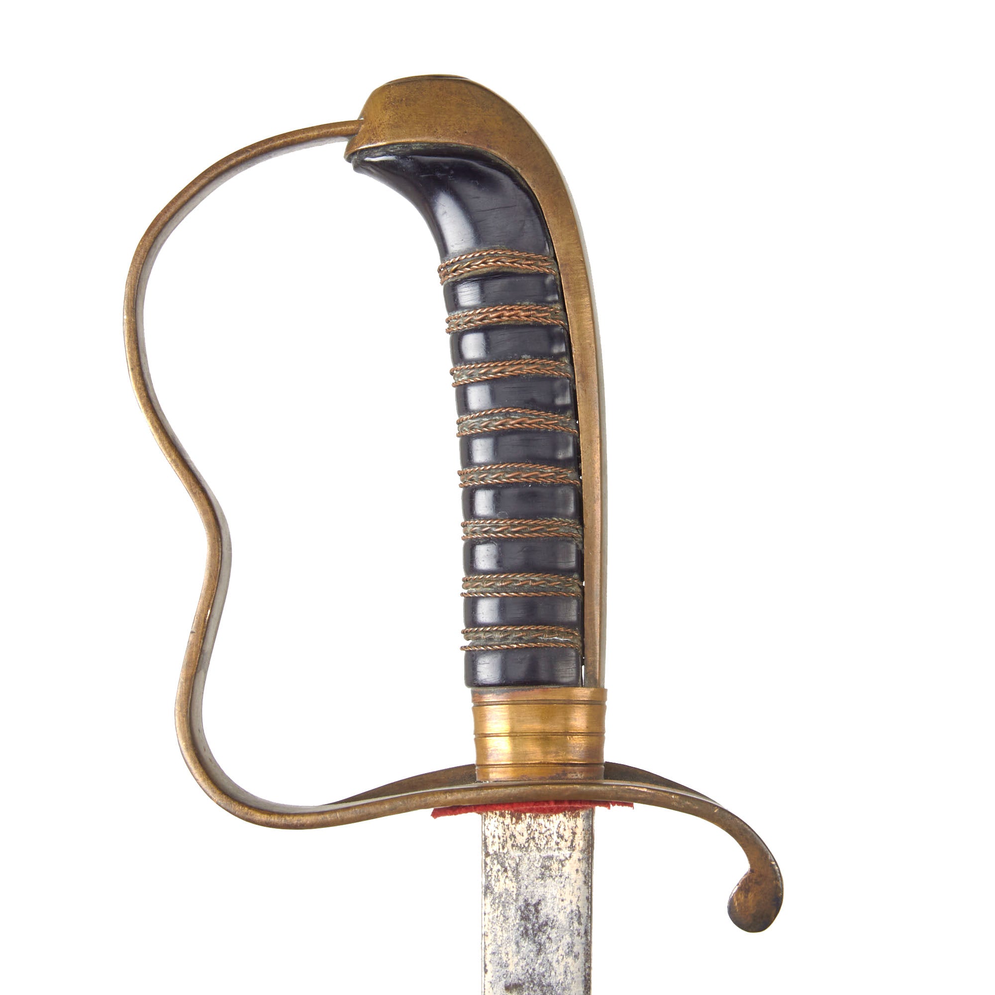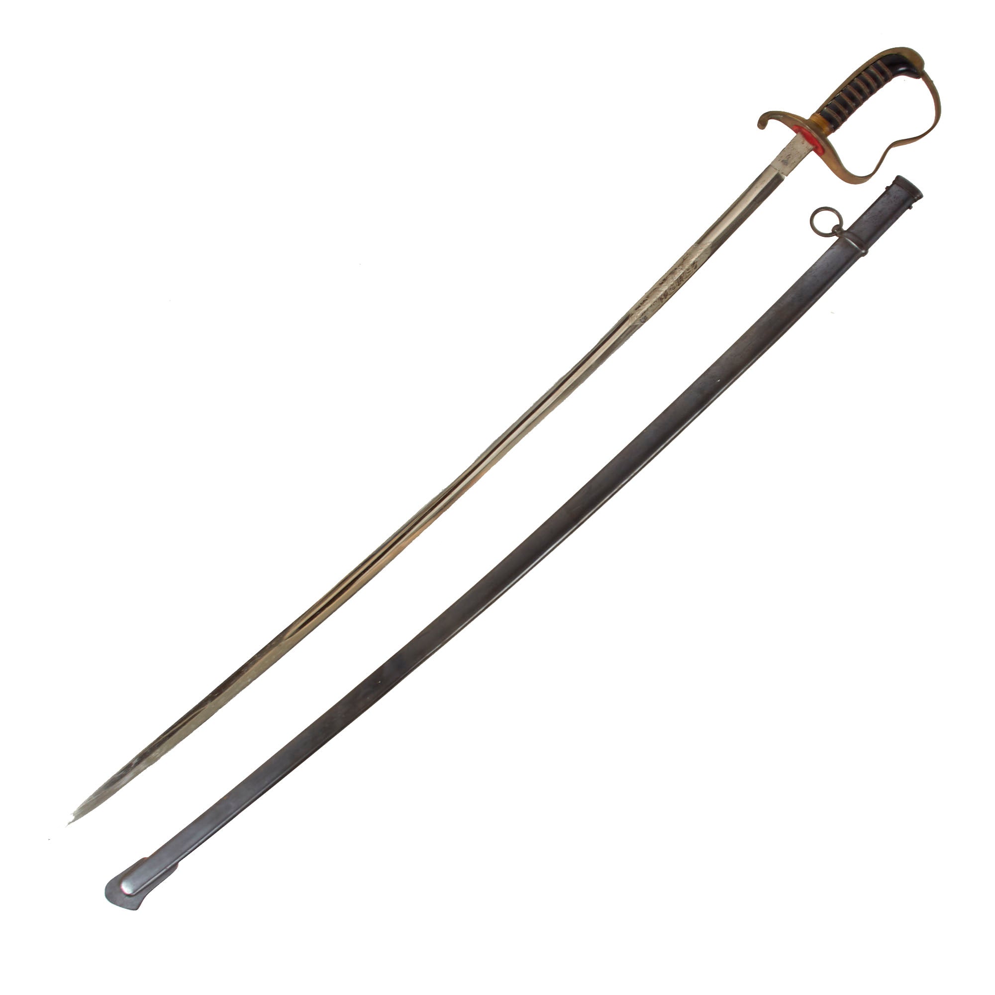 The steel scabbard has a single hanging ring, as the second fitting was for a hook on the hanger. It has the standard black enamel finish, which has worn off in some areas, and the underlying steel has oxidized, but thankfully this is only noticeable near the drag. The scabbard is still straight with very minor denting in spots.