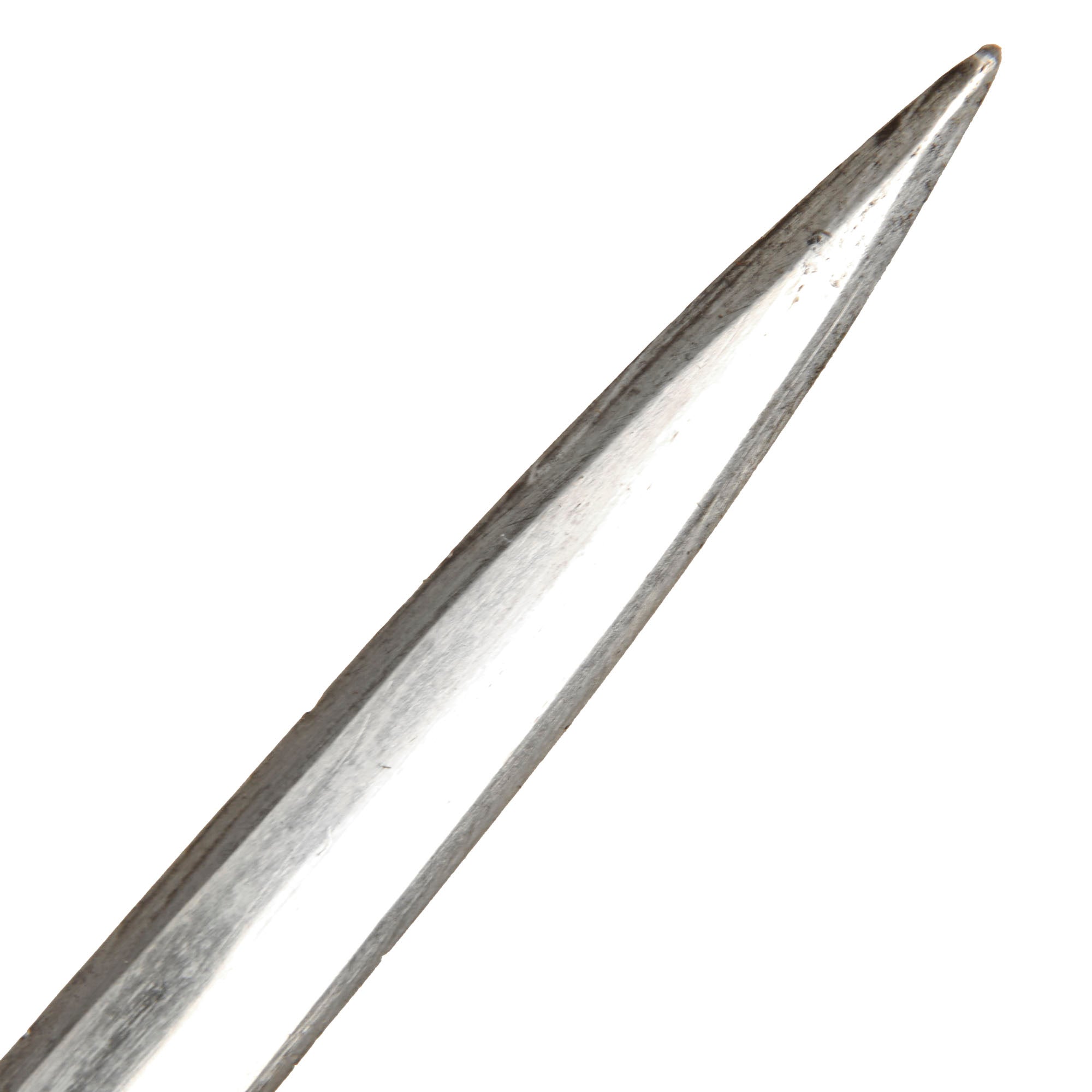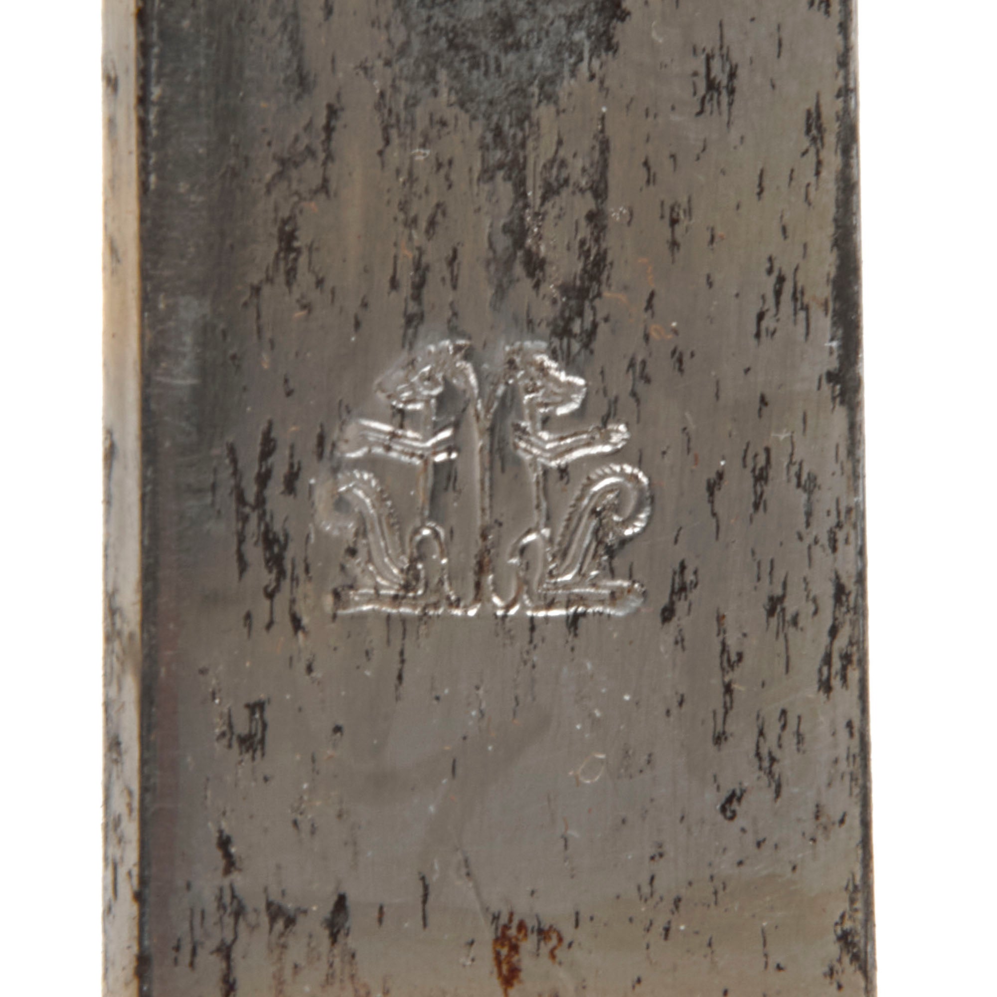 The reverse ricasso is stamped with the Carl Eickhorn "Two Squirrel" trademark, for manufacture by the legendary firm of Carl Eickhorn, located in Solingen, the "City of Blades" in Western Germany. Per J. Anthony Carter's book GERMAN KNIFE AND SWORD MAKERS, this specific version of the mark was used on swords, "walking out" bayonets, and other similar items after 1906. This exact mark is also found on Hessian cavalry sabers.