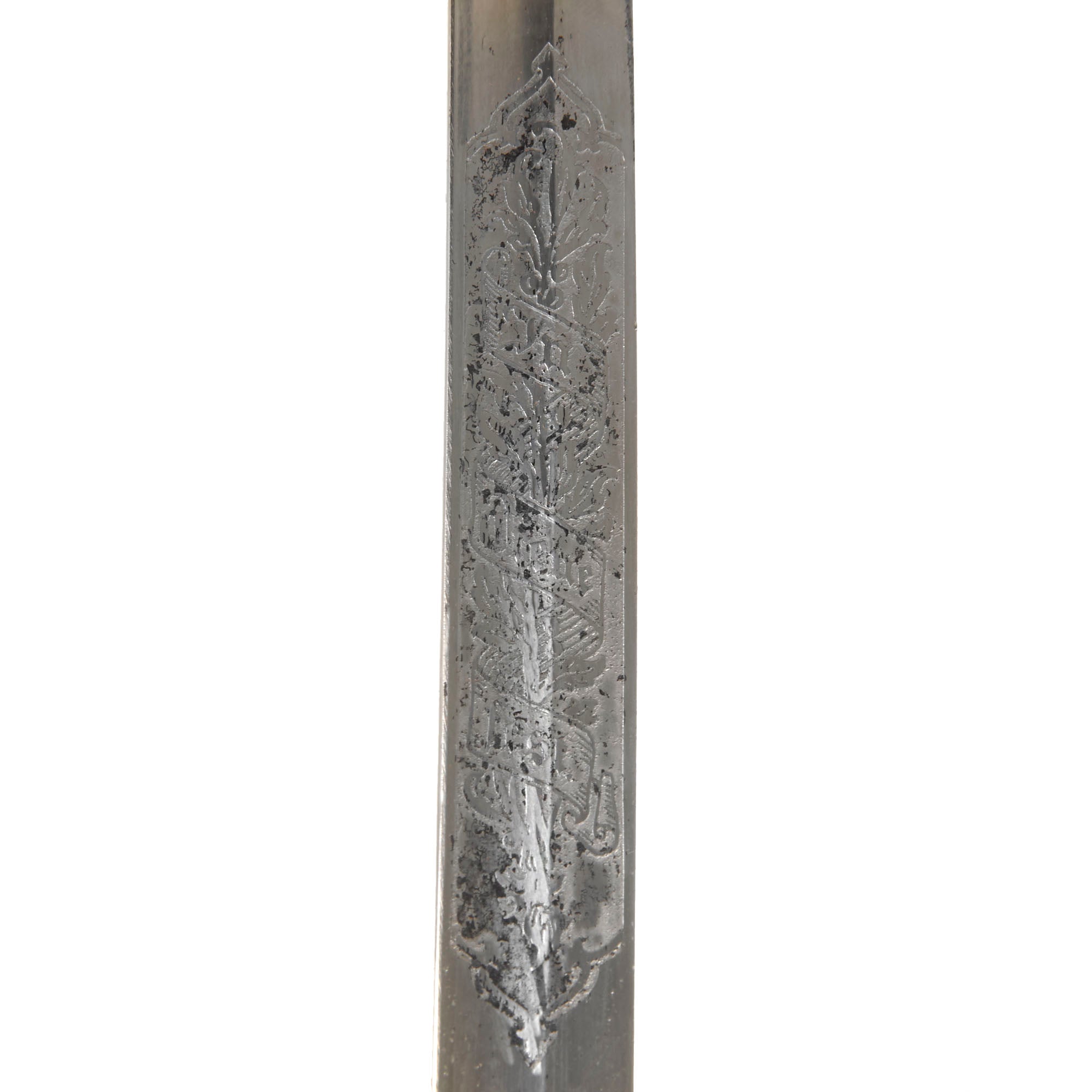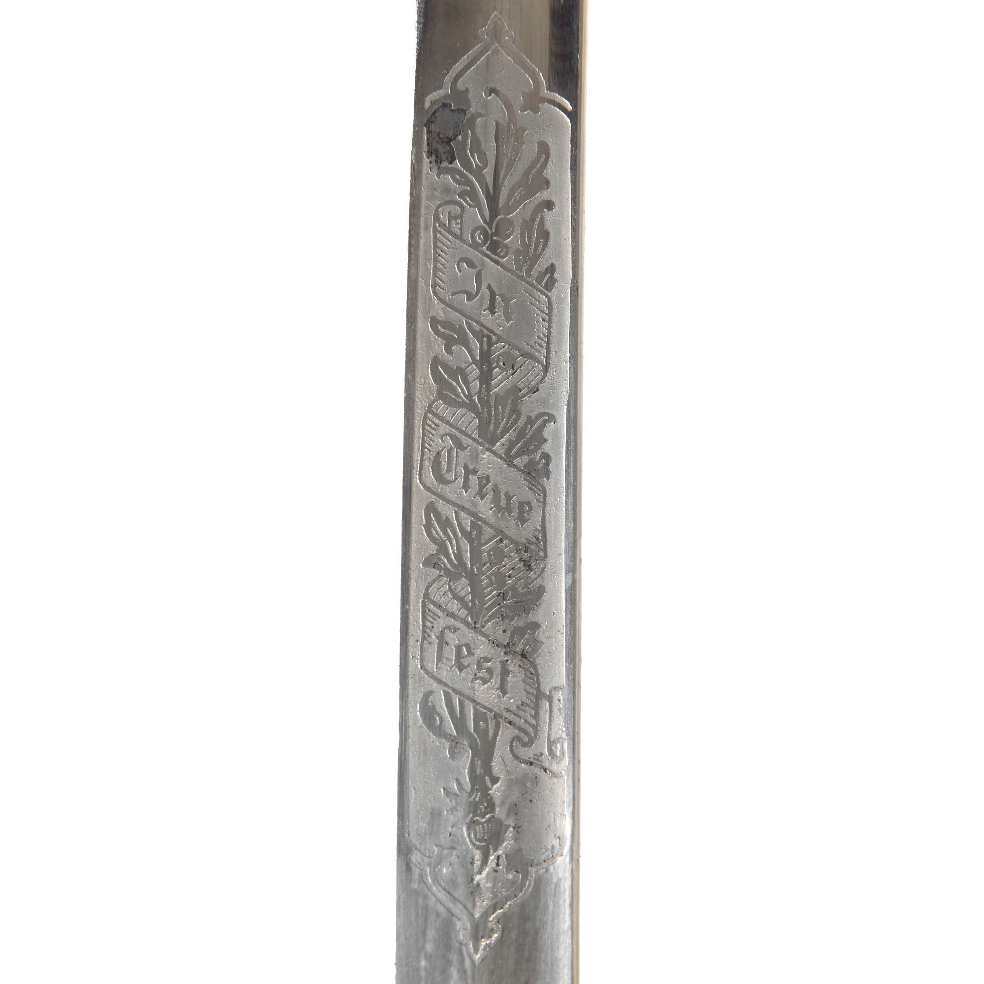 This is a nice example of the plain nickel plated Dove Head sword worn by Bavarian Army NCOs, with a lovely "Double-Etched" bright steel blade. This sword design is a simplified version of the Officer's dove's head sword, without the decorative designs and engraving usually seen on the hilt. It has the standard "P" guard used on Imperial German dress swords, with a simple cross guard. The hilt is black painted steel from what we can tell, and retains most of the finish, with a lovely patina of age on the exposed metal.