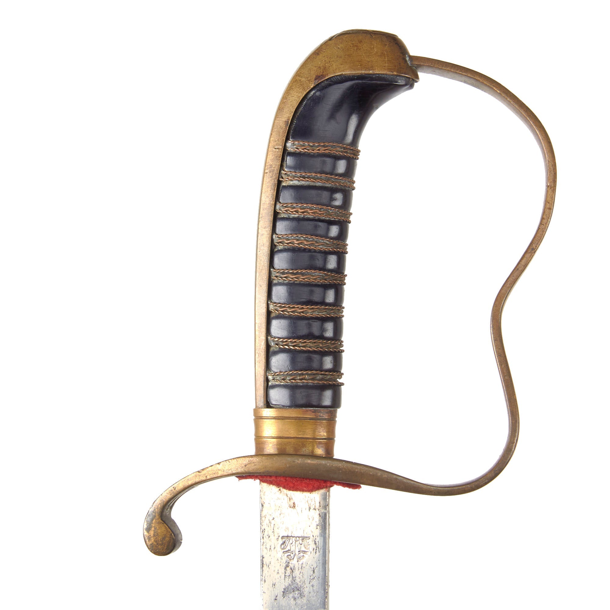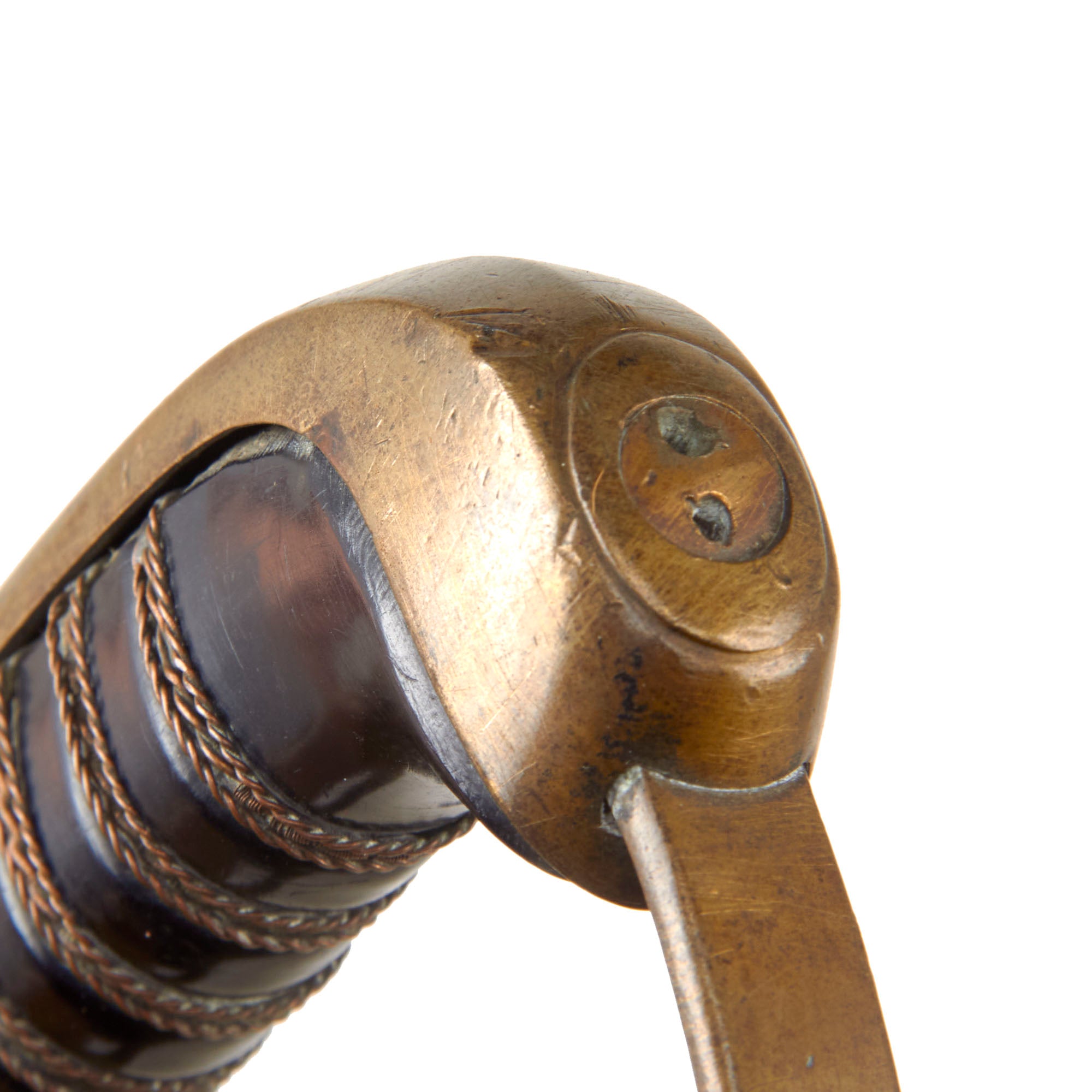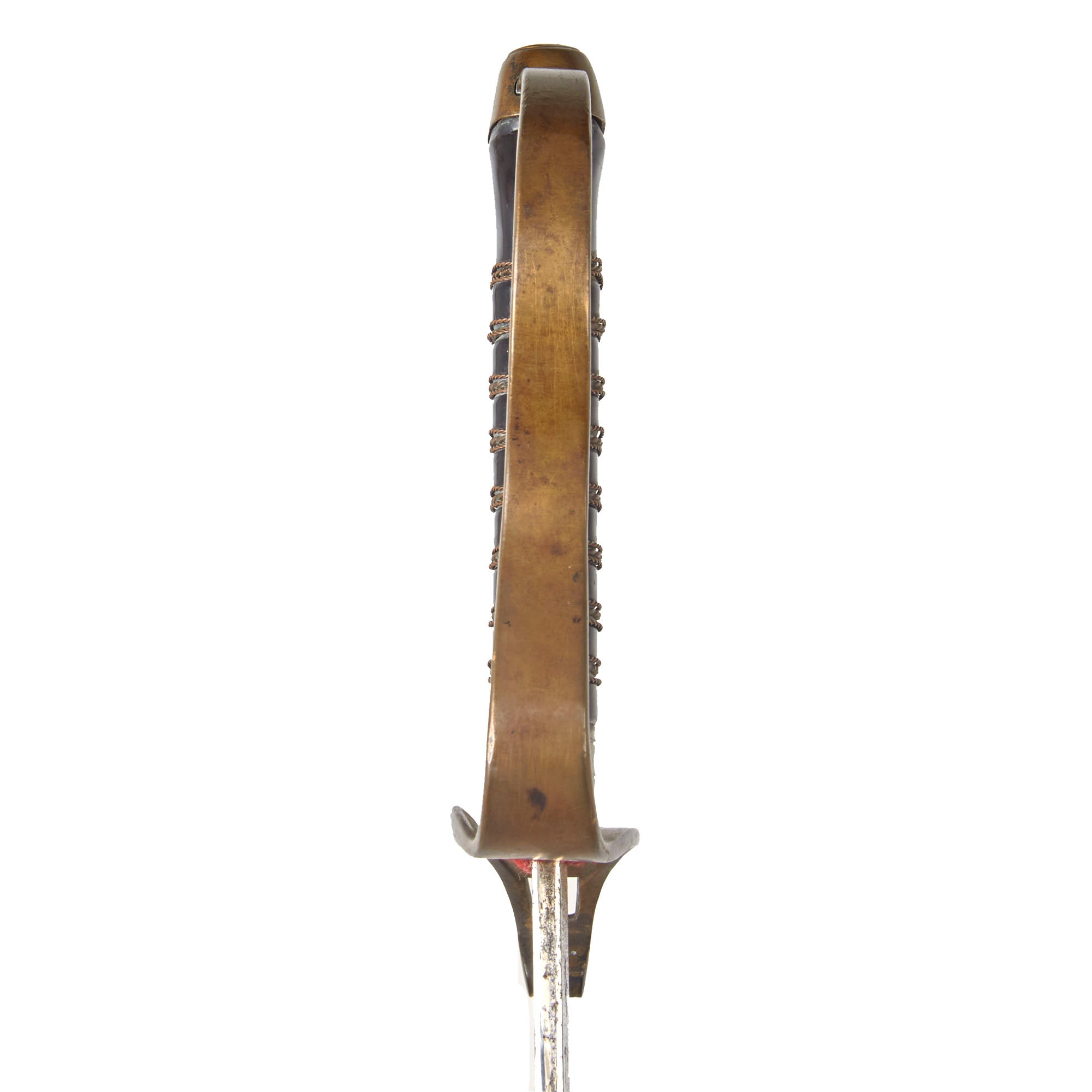 The grip is a very nice example of black bakelite. It is wrapped with three strands of twisted brass wire, with the central strand being much thicker than the outer two. There is some looseness in the wrappings, probably from the bakelite shrinking a bit. The original felt blade buffer is present but very worn and tattered. The curved single-edged 32 3/4” blade with broad 3/4-length fuller, decorated on each side with the Bavarian motto “In Treue Fest” surrounded by decorative border and foliage. The blade is in good condition with bubbling and wear to the plating.