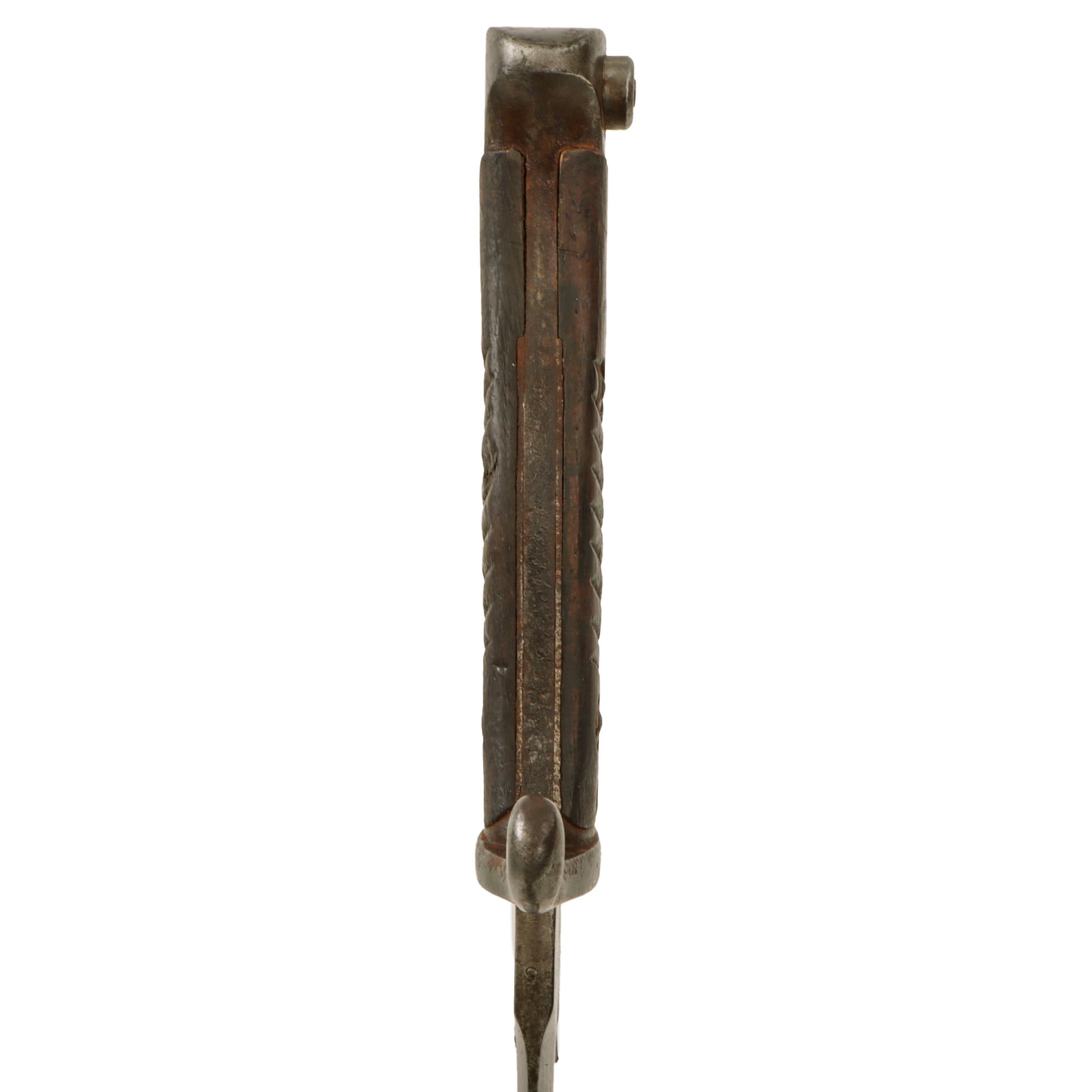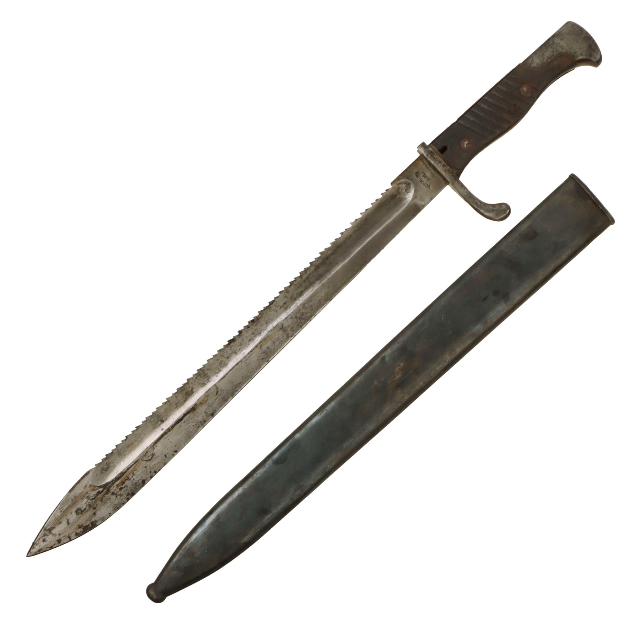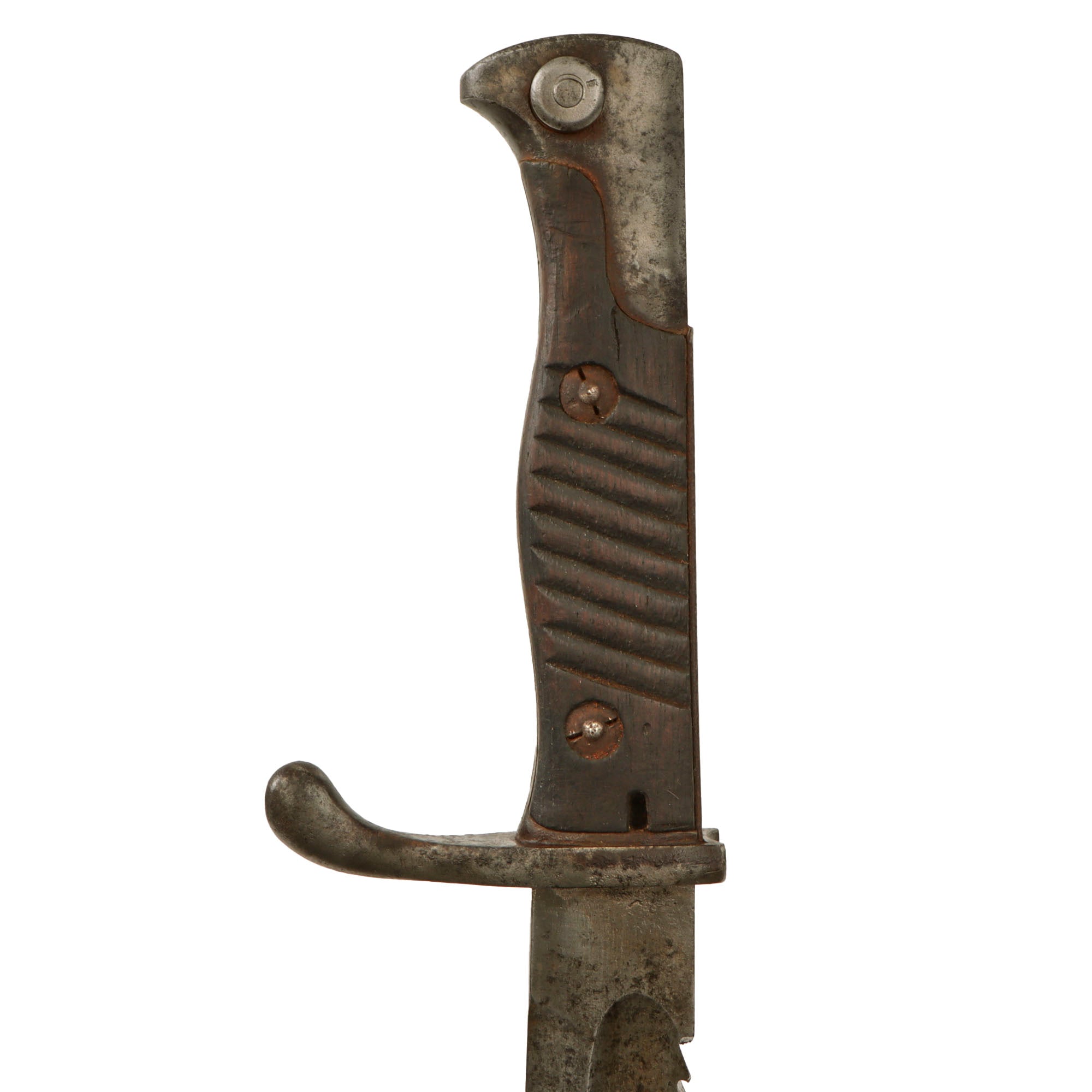This example has a very desirable "sawback" blade, which was intended for use by pioneers to saw through brush and obstacles. Unfortunately a rumor got out that it was intended to inflict grievous harm on enemies, so a lot of the sawback bayonets had this feature removed, making them hard to find. This example has a blade in very good condition. There is a bit of light staining, and oxidation which has been cleaned away. It does not appear to have been sharpened much, and the sawback itself is in good condition.