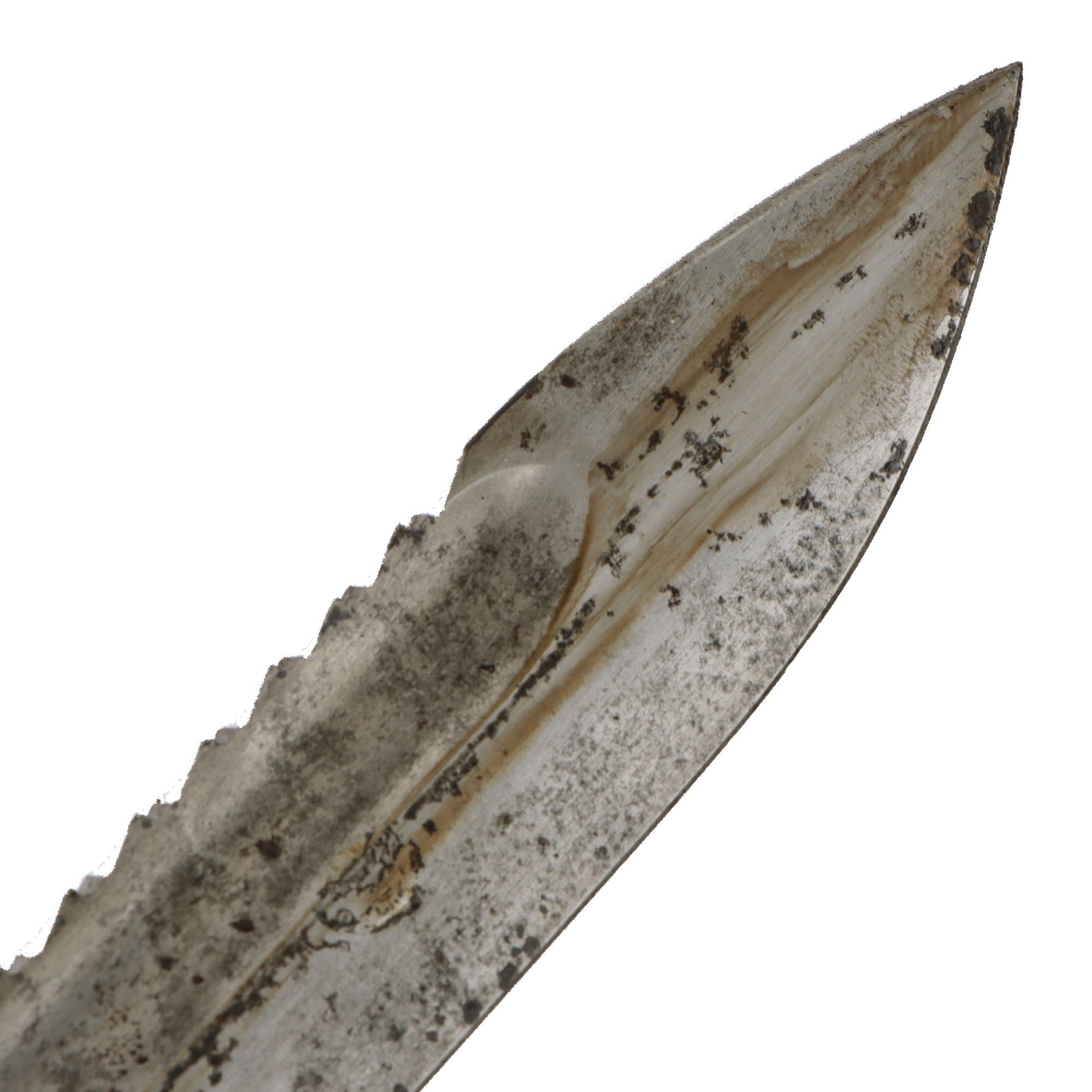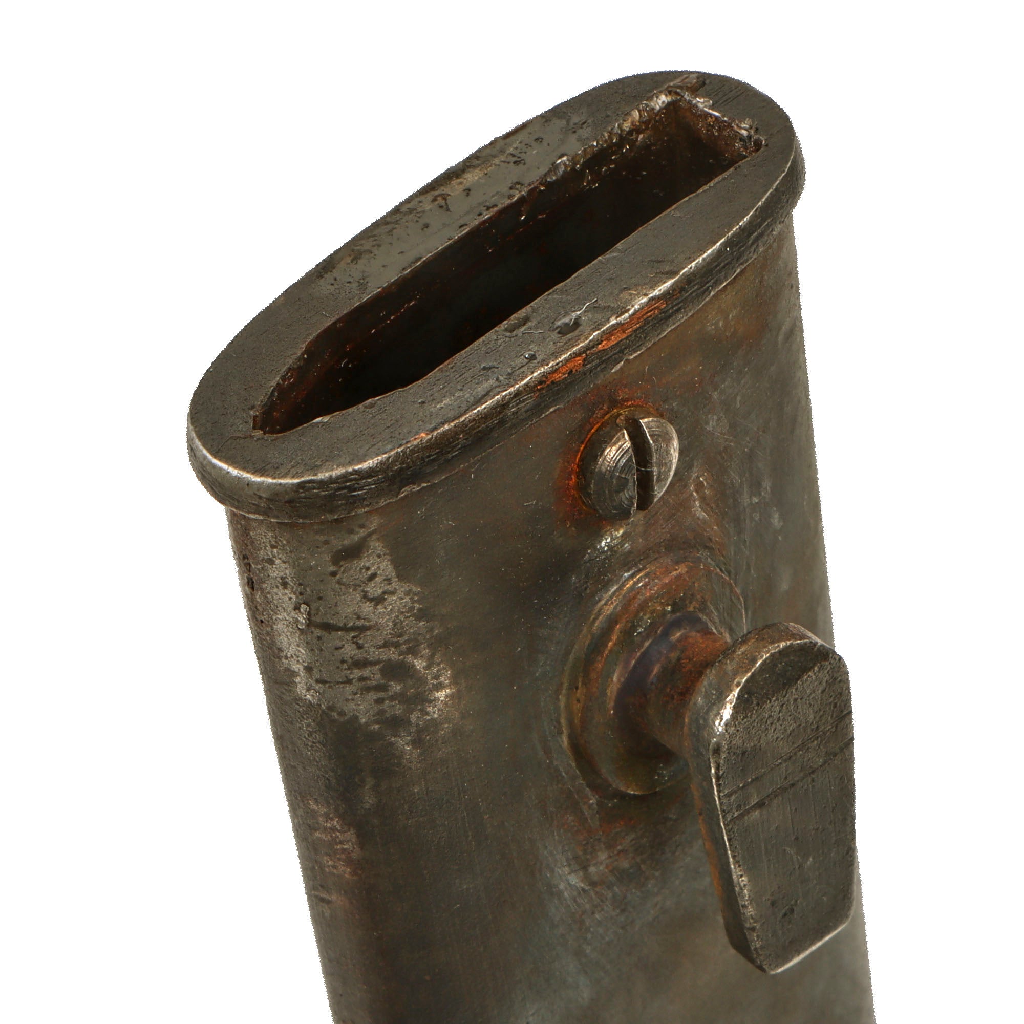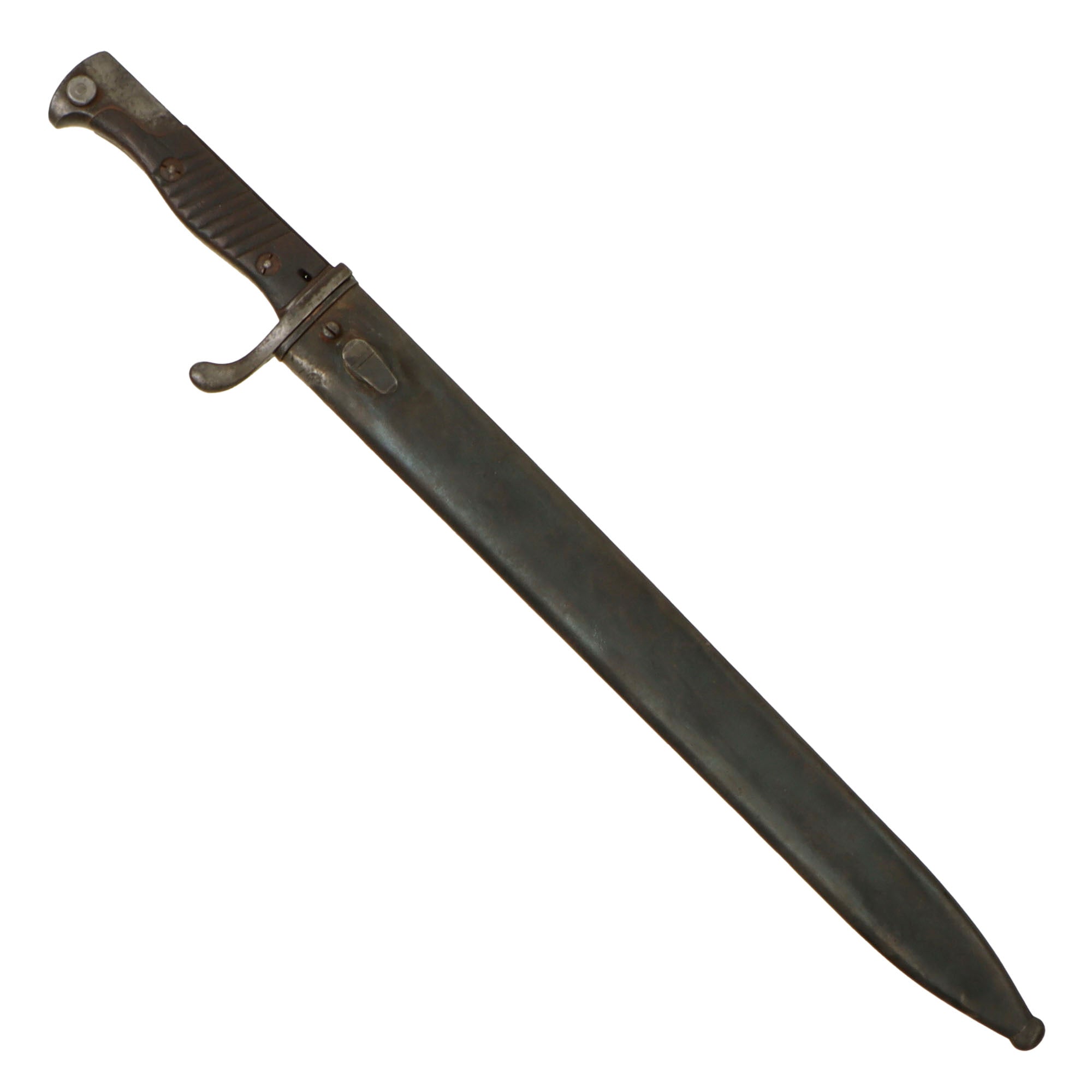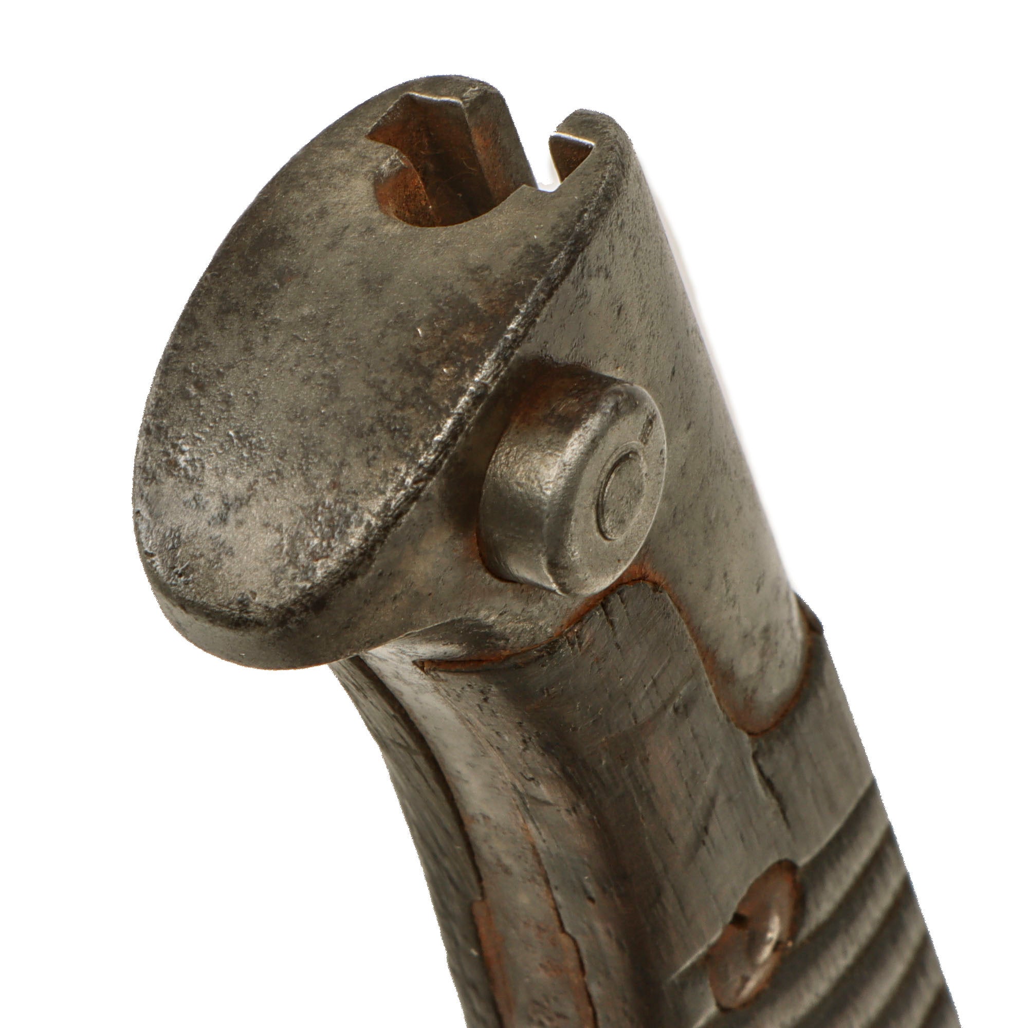 This example has a very desirable "sawback" blade, which was intended for use by pioneers to saw through brush and obstacles. Unfortunately a rumor got out that it was intended to inflict grievous harm on enemies, so a lot of the sawback bayonets had this feature removed, making them hard to find. This example has a blade in very good condition. There is a bit of light staining, and oxidation which has been cleaned away. It does not appear to have been sharpened much, and the sawback itself is in good condition.