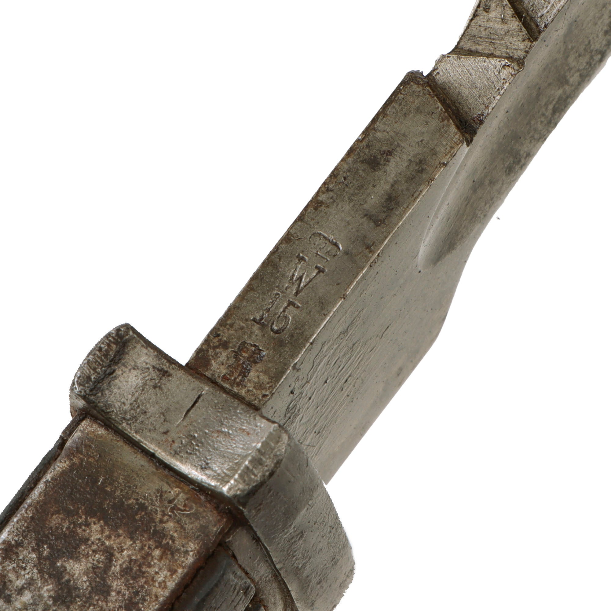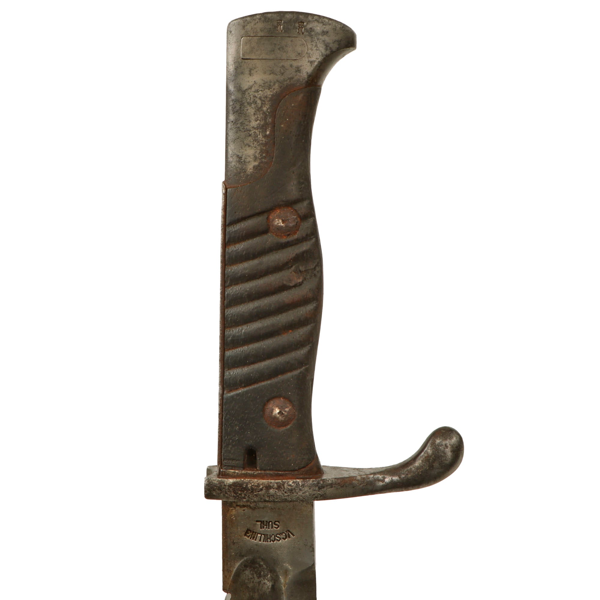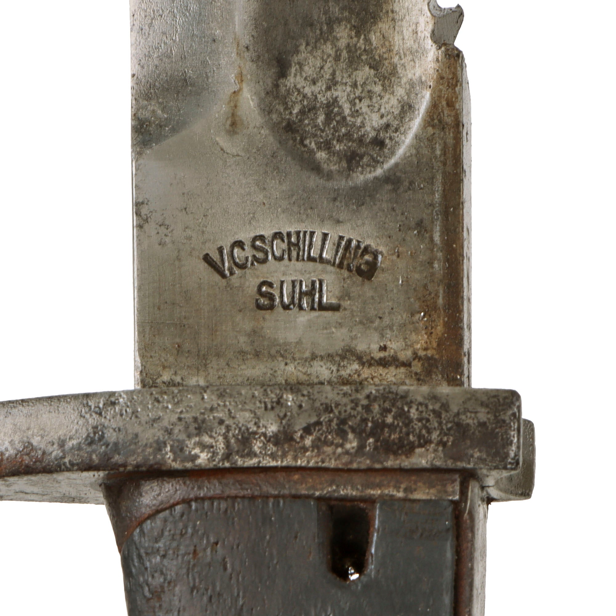 This example has a very nice set of original grooved wood grips that have a lovely color and minor chipping from time, with a very nice hilt with some heavy cleaned oxidation and a great patina. Bayonet lock is fully functional, and the flash guard is undented, which is rare as these were often used as a hammer in the field. The guard does have some oxidation which is to be expected. The blade in general looks to be uncleaned, with minor pitting in specific spots. The blade ricasso is maker marked (top line faint):