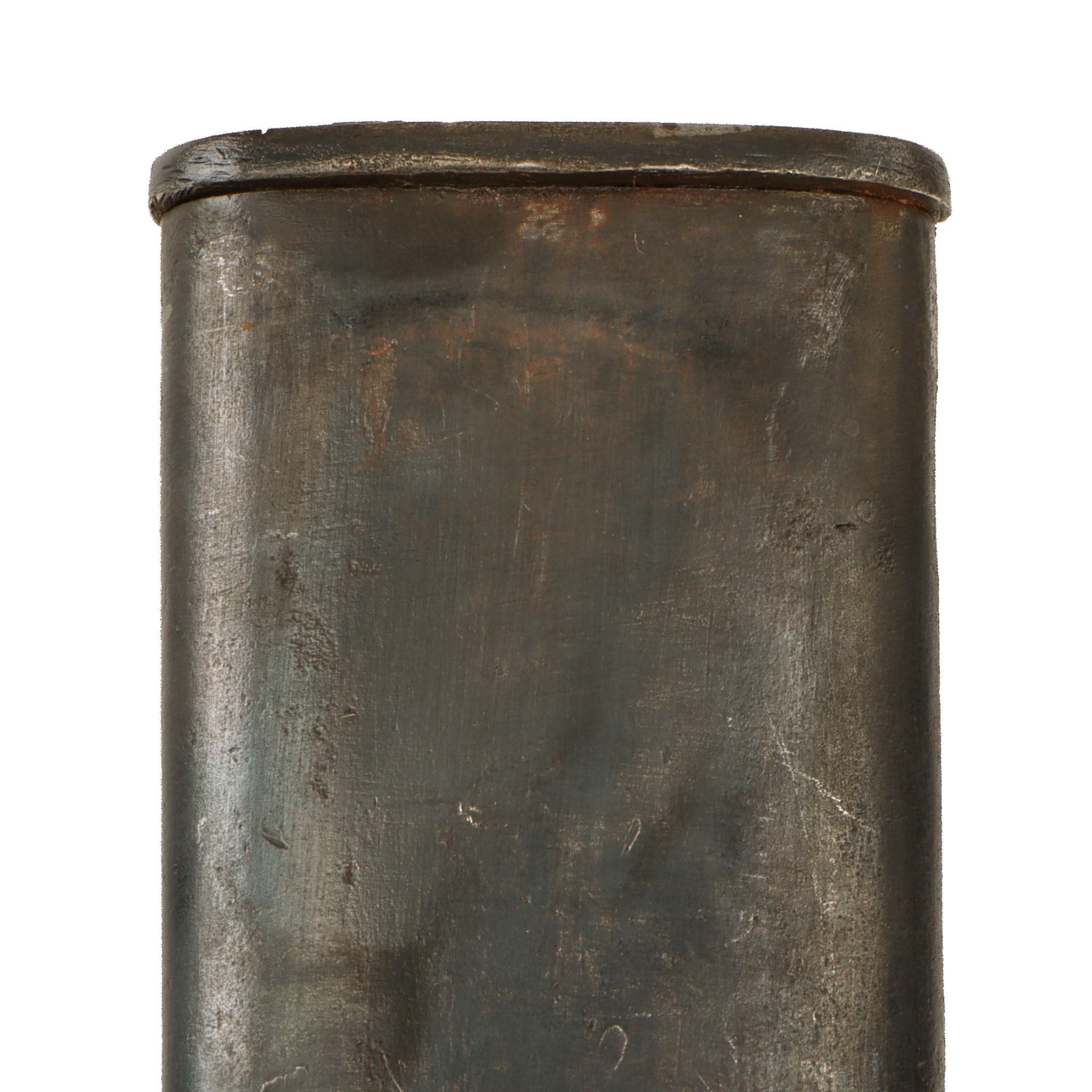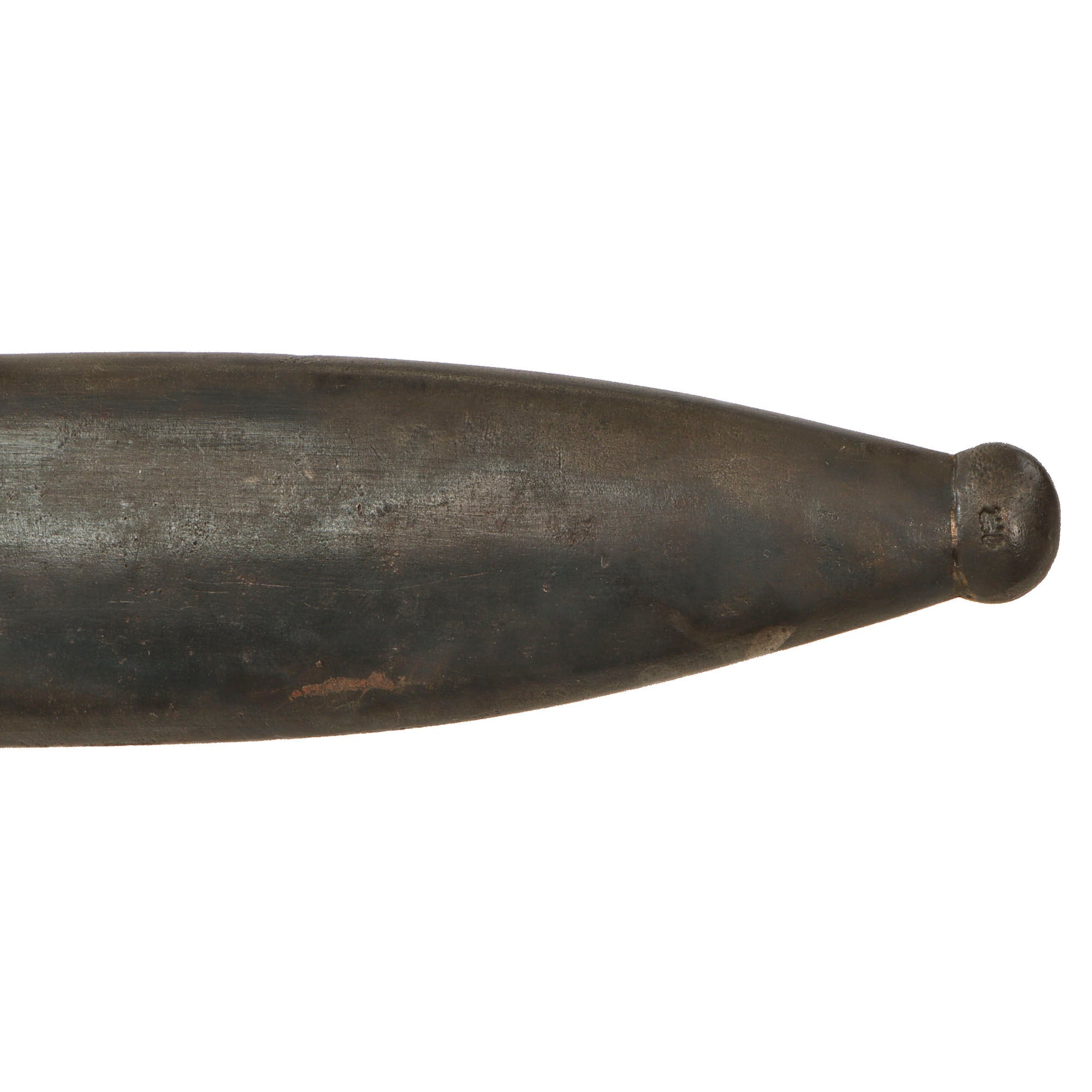 The included steel scabbard is in good condition, showing minor oxidized patina and has some of the original finish still present. It does not show any major oxidation or rust, and the frog button is still intact and unbent. There is minor denting in spots but nothing serious.