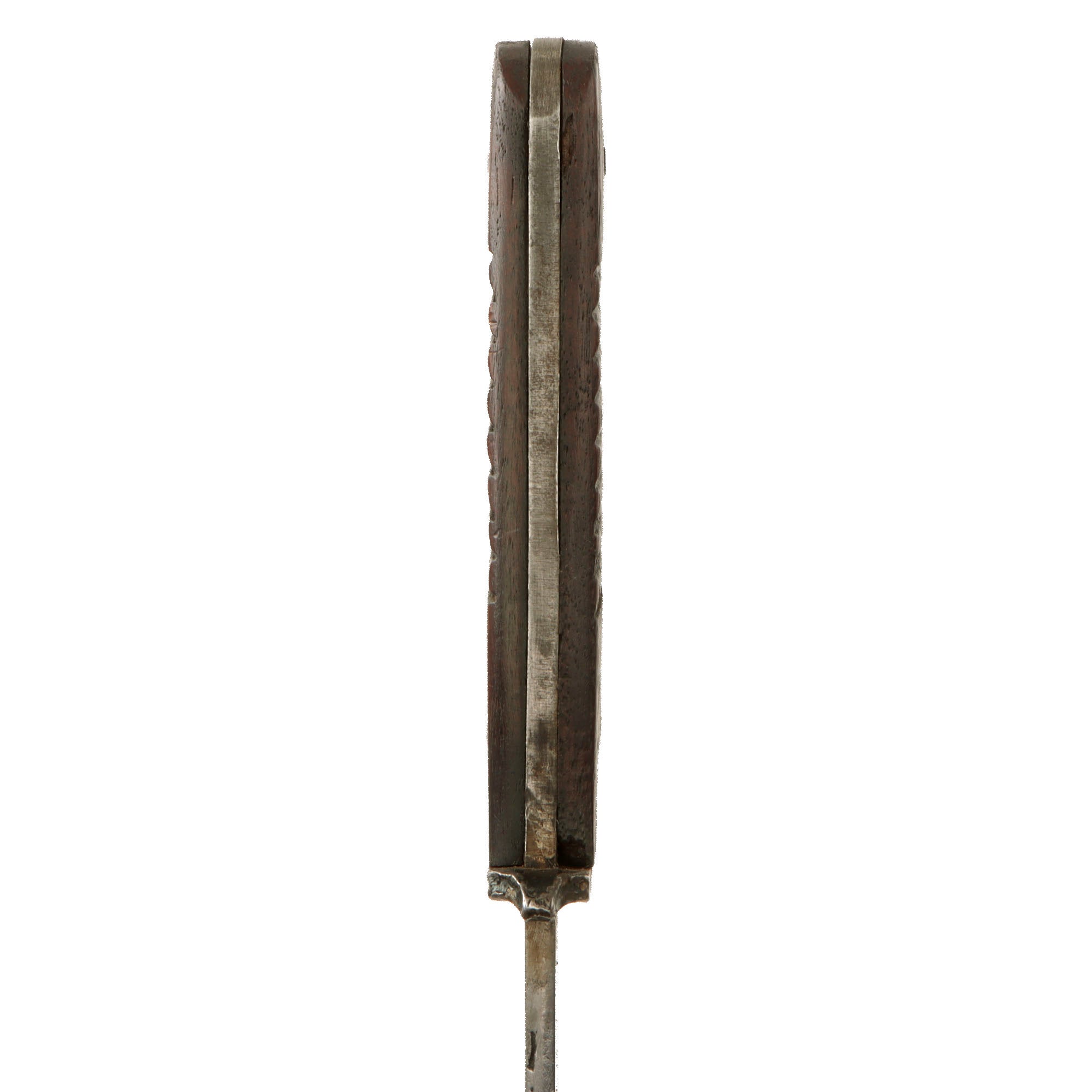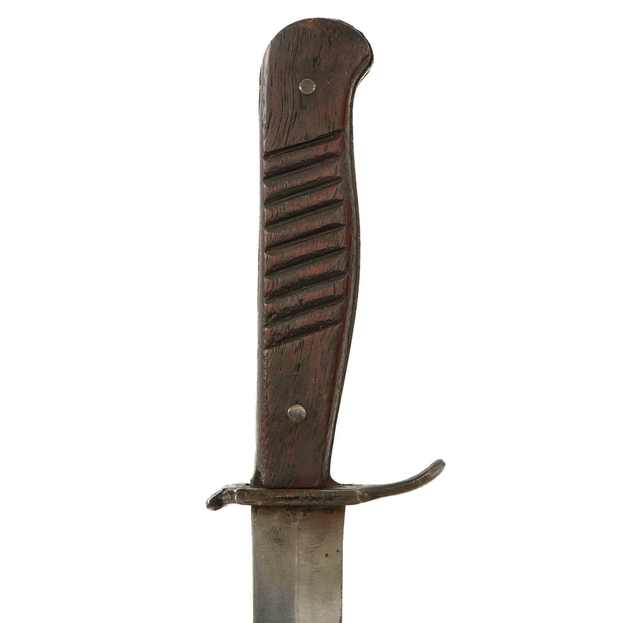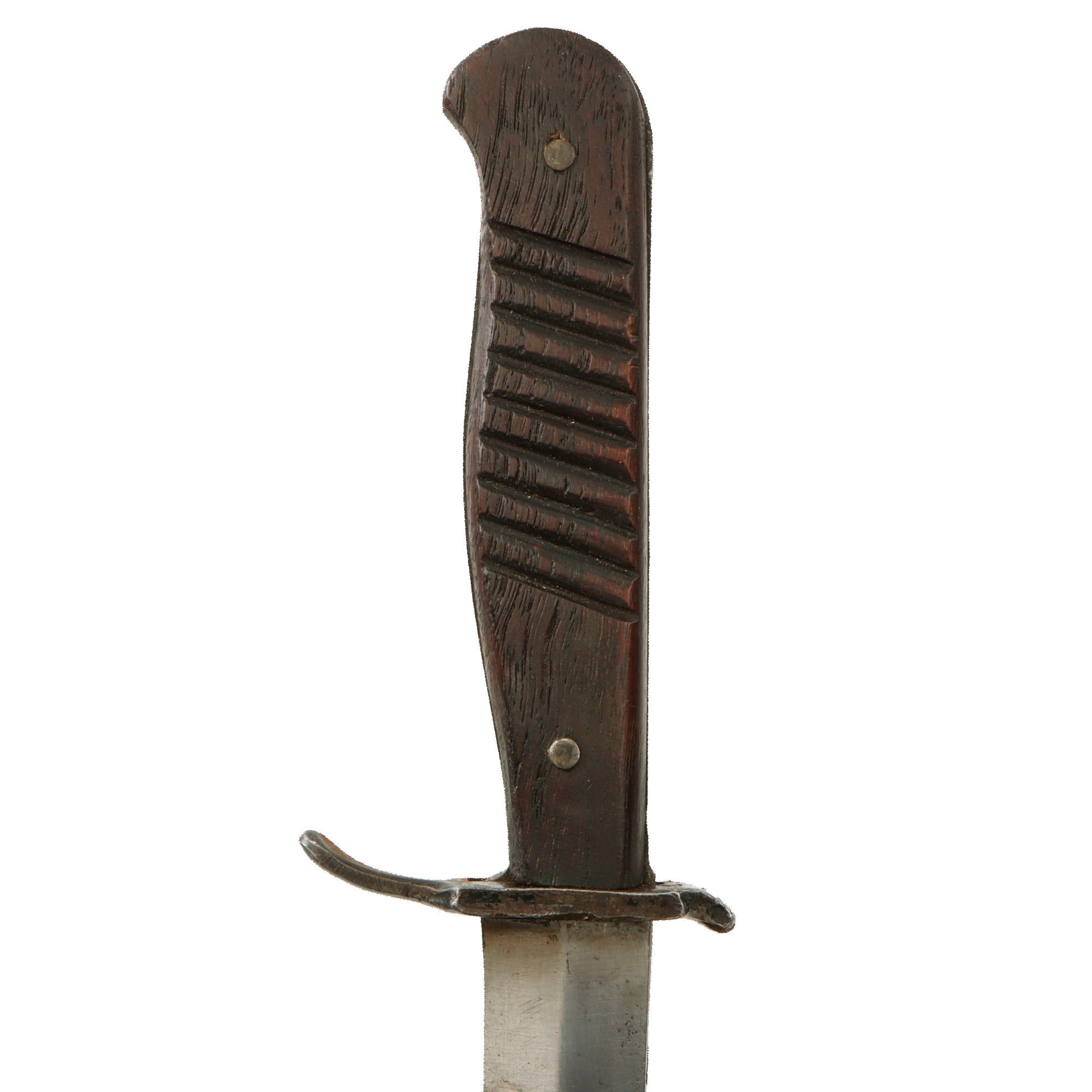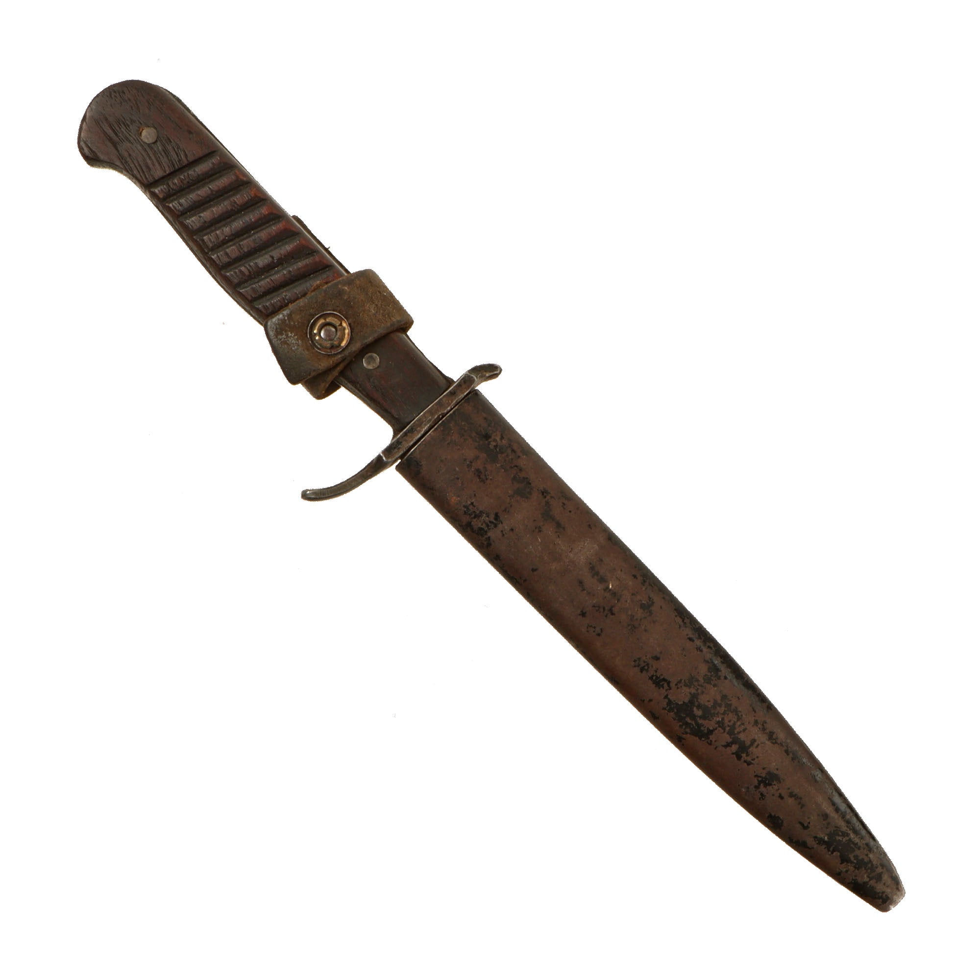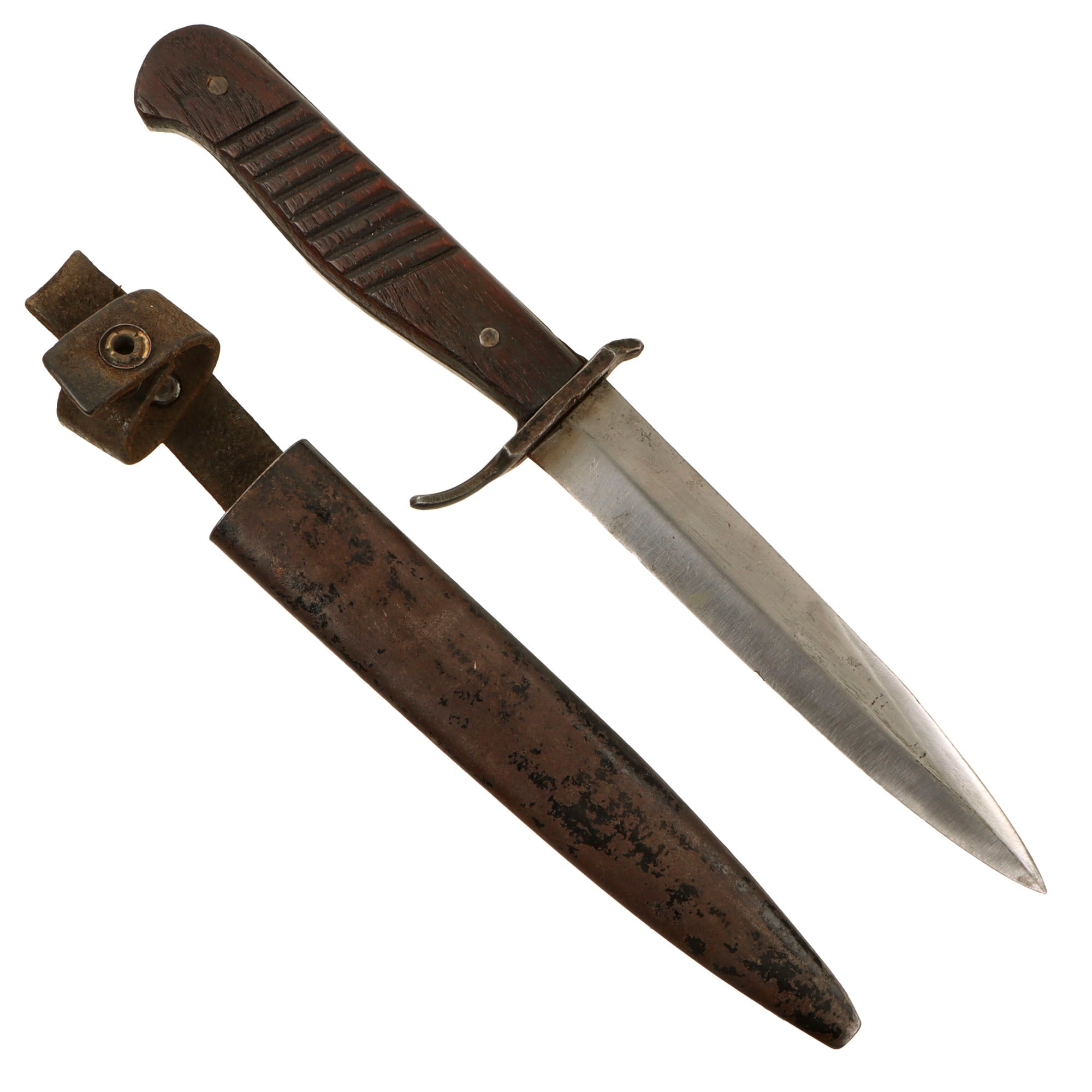 Original Item: Only One Available. Fitted with a single edged and a slight Bowie style blade this is an original fighting knife used by the Germans in WW1 and then again in WW2. In nice used condition, this knife has an all-wood grip with hatching secured by two pins. The blade is single edged but has a small false edge of about two inches at the point. The knife comes in an original rolled steel World War One scabbard with a very fragile leather belt loop which retains the securing strap and snap, but the front piece of the snap has broken off. It will still snap closed, however.
