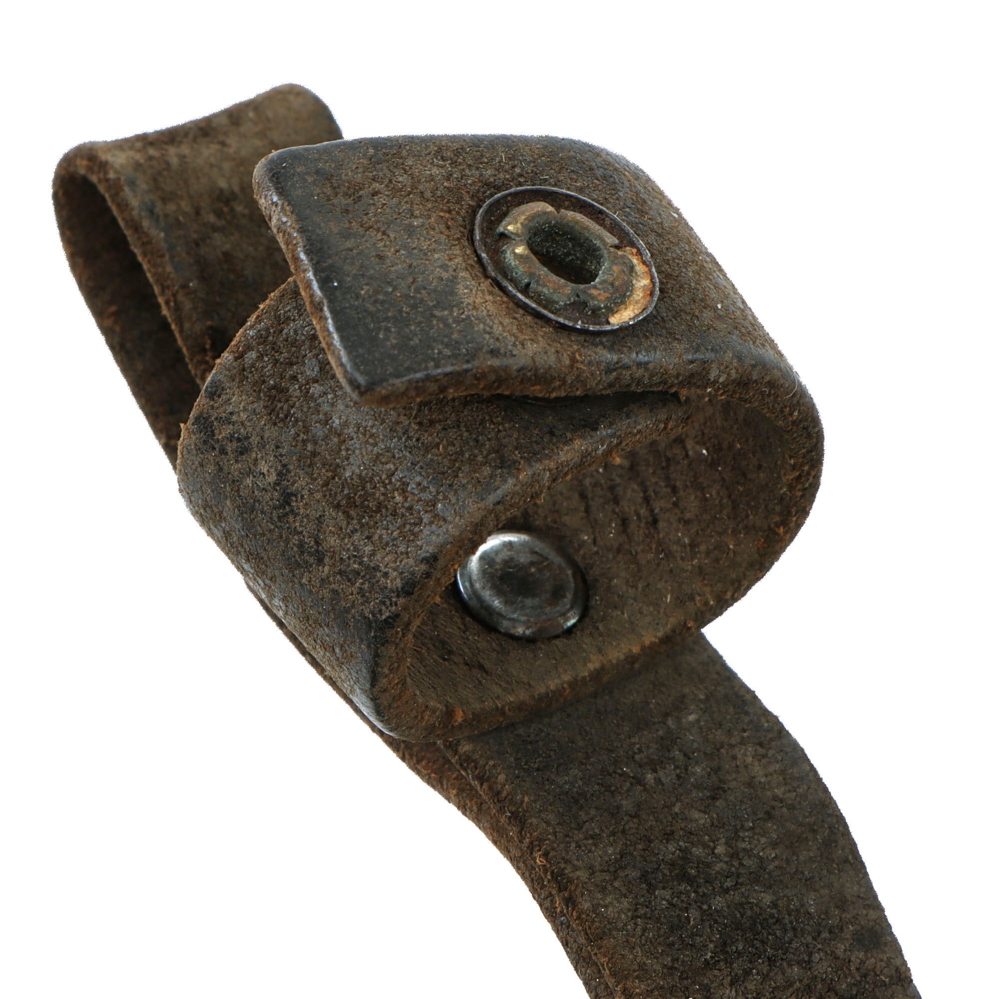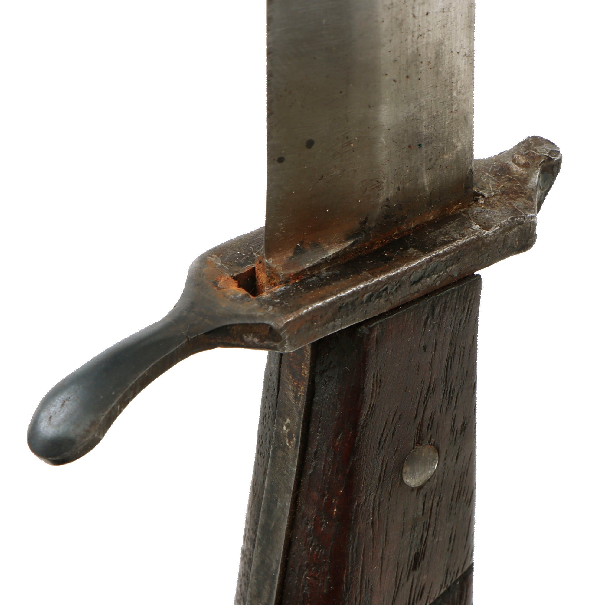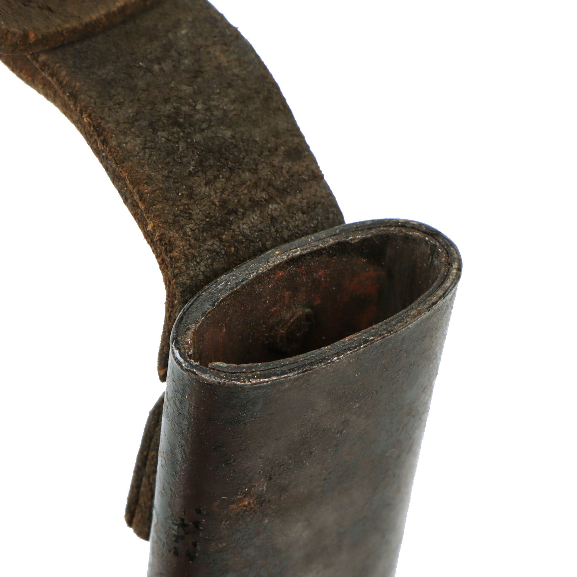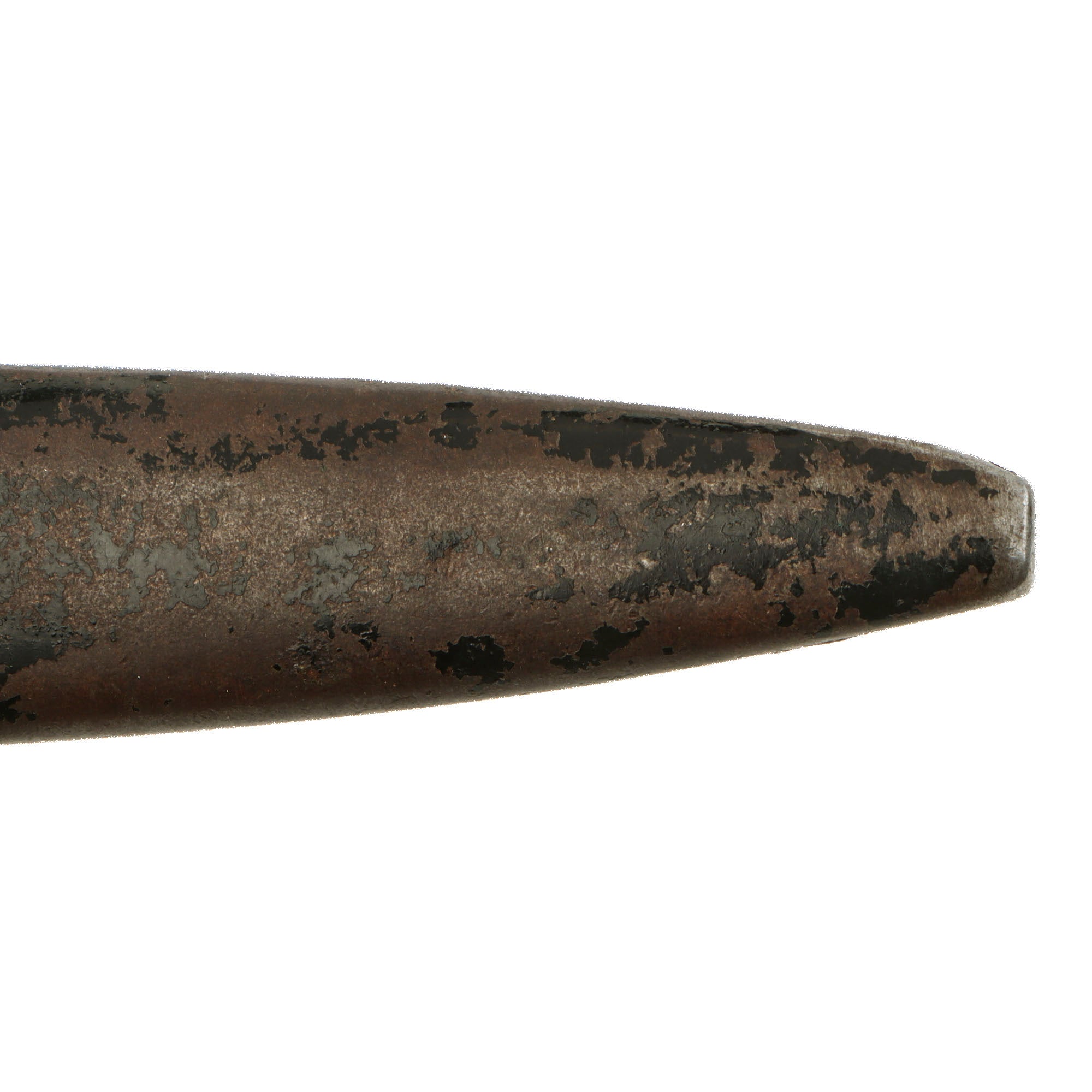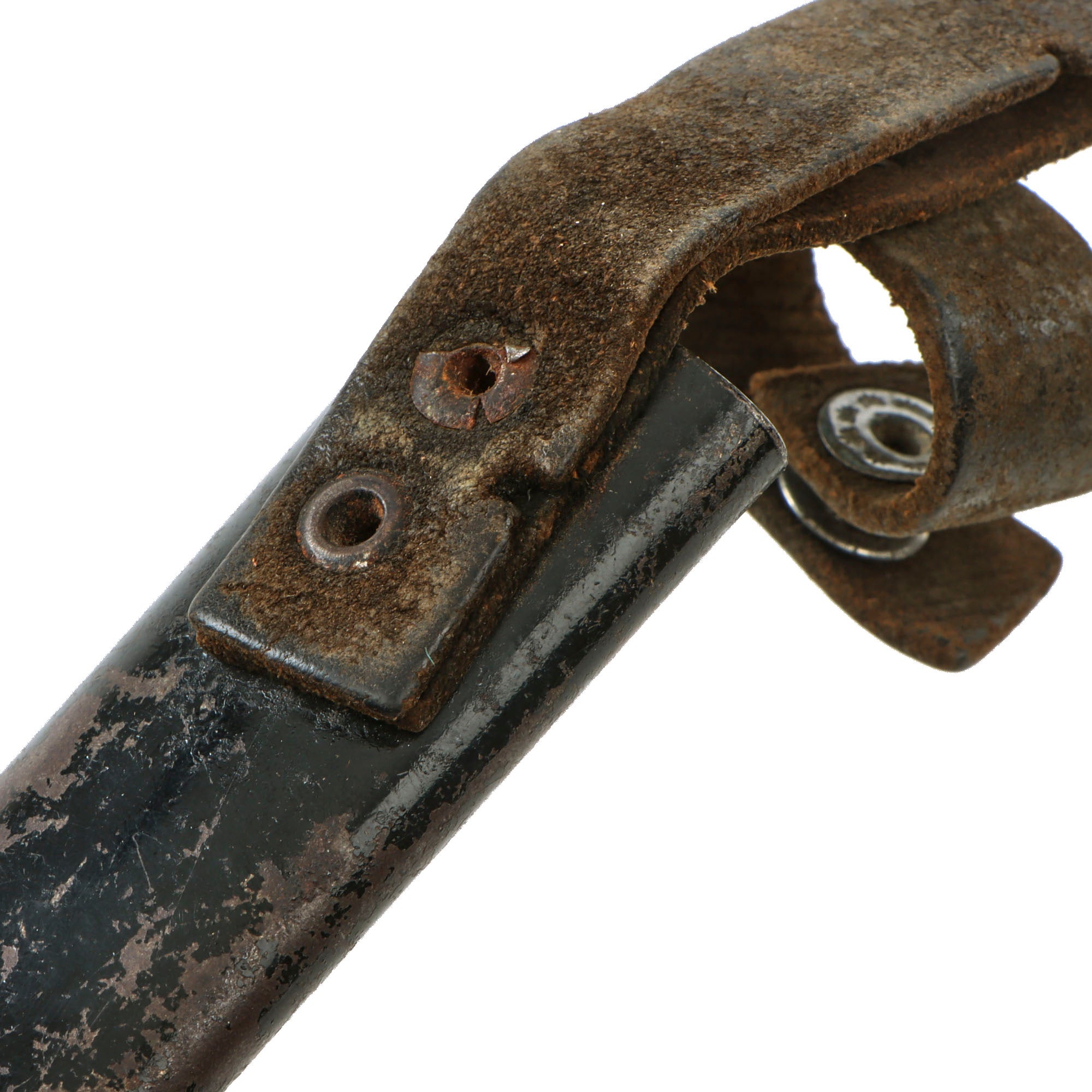 The blade is in fair shape with some small chips to the edge as shown, but not very much oxidation besides at the tip. The scabbard retains the belt loop but the securing snap is missing the top piece as mentioned. The strap is extremely fragile.