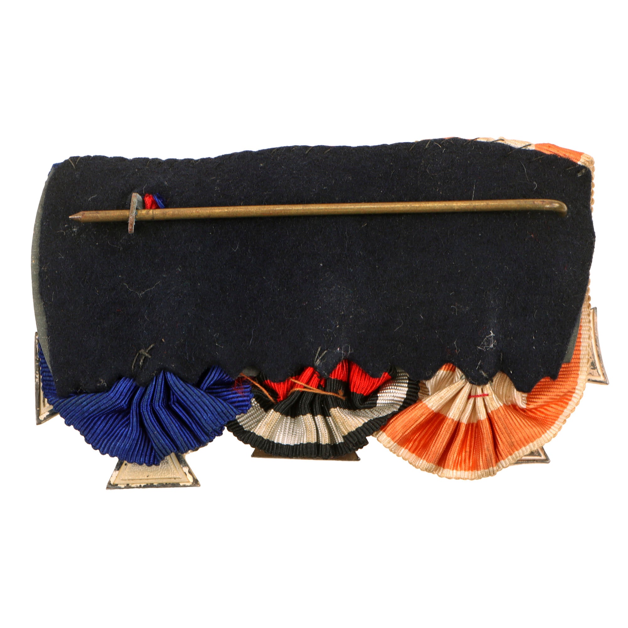 The set of 3 medals offered in good condition is mounted on a very nice metal supported medal bar, which has a long brass securing pin. The colors are well retained, with some light staining and overall oxidation on the various awards.